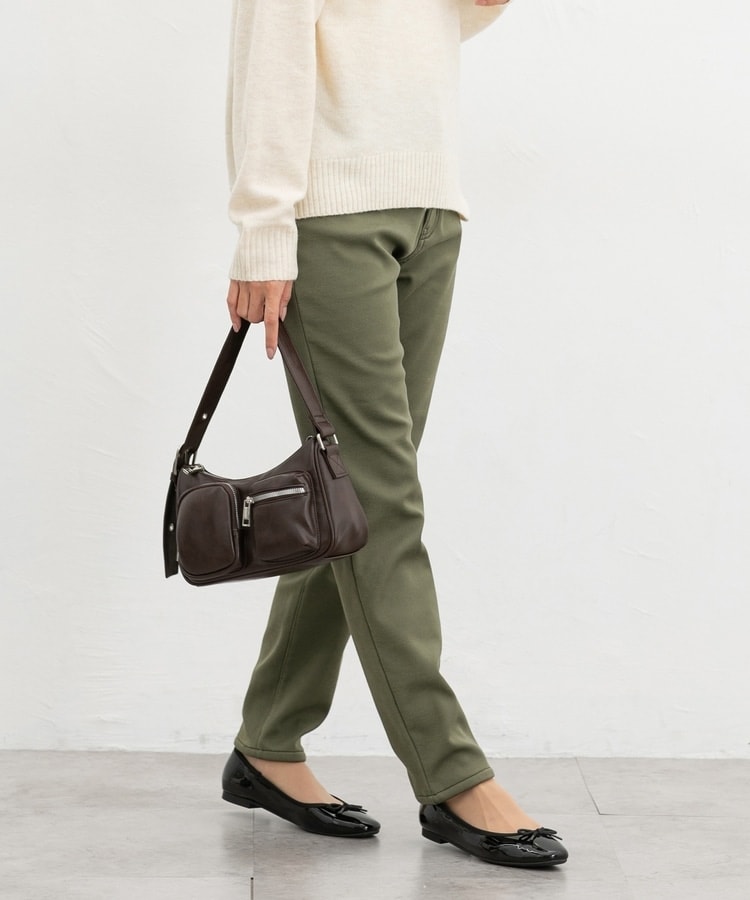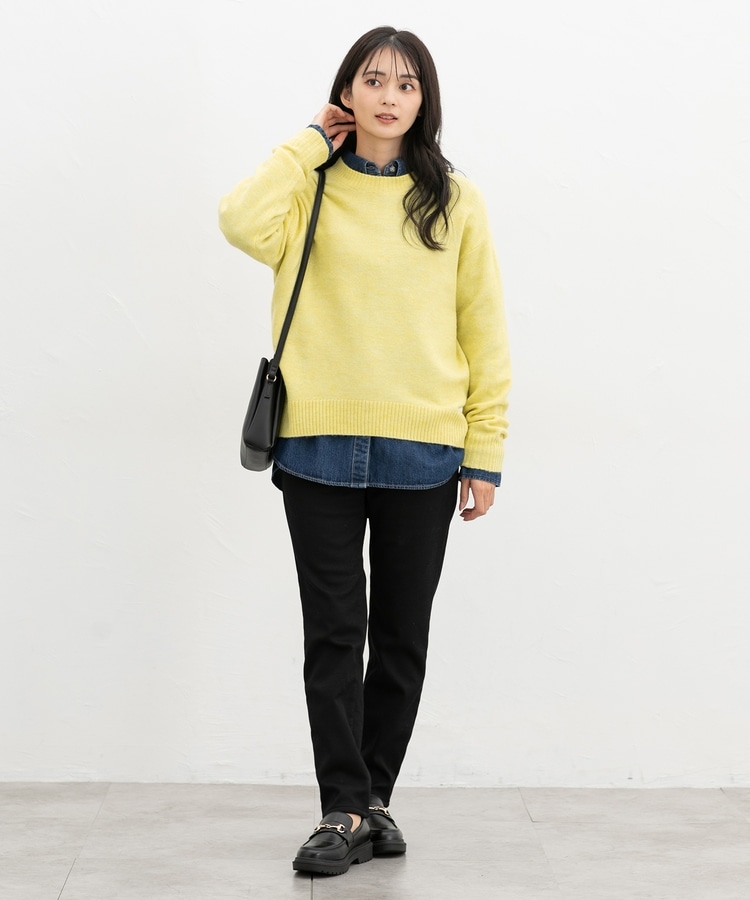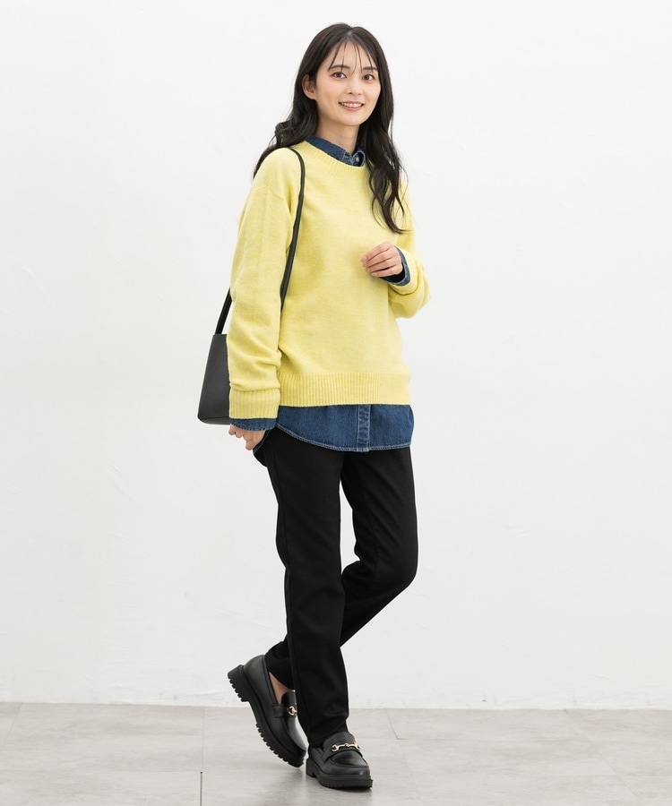 ゆるっとしたニットやスウェットと合わせてメリハリをつけるコーデがおすすめ。