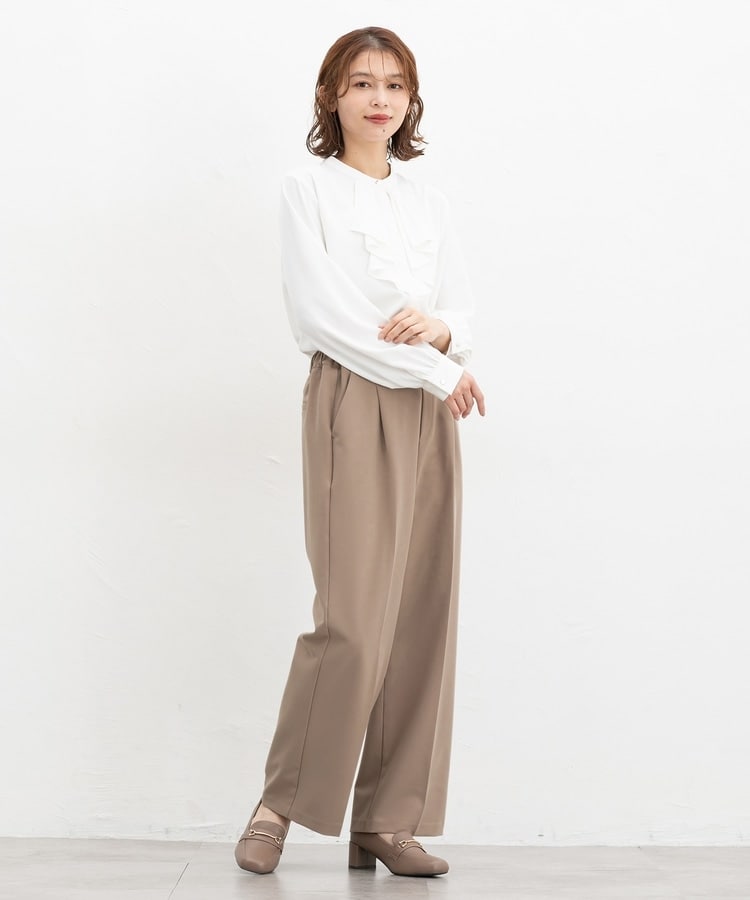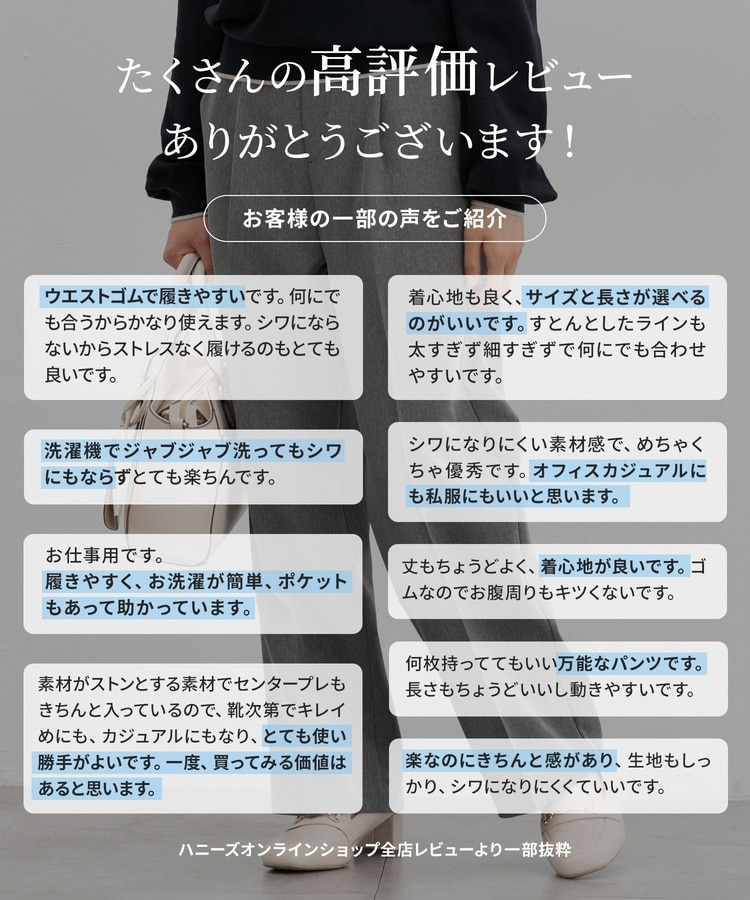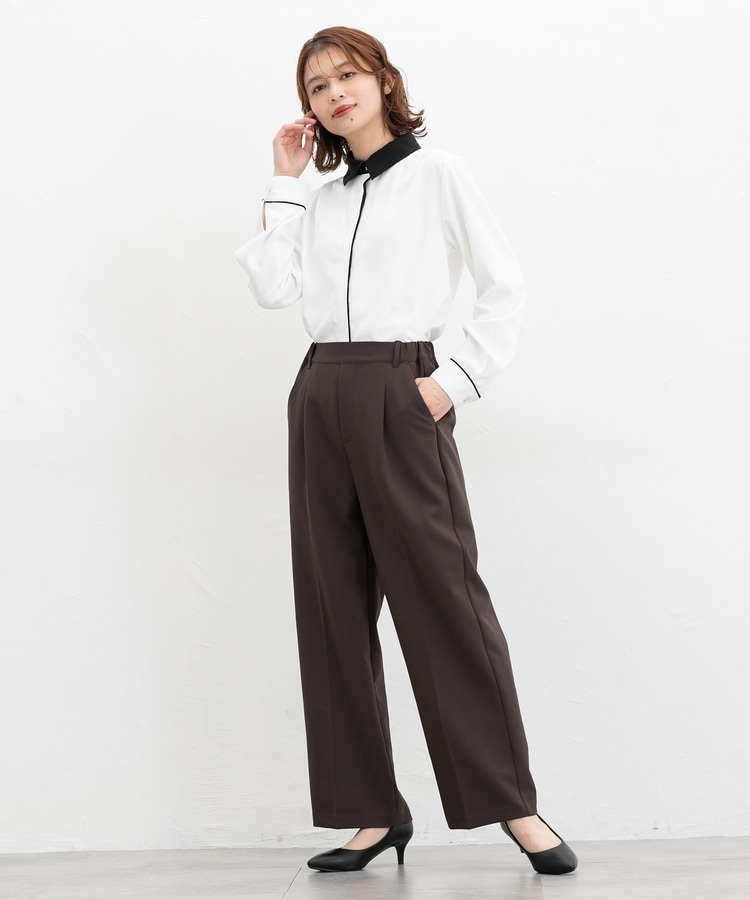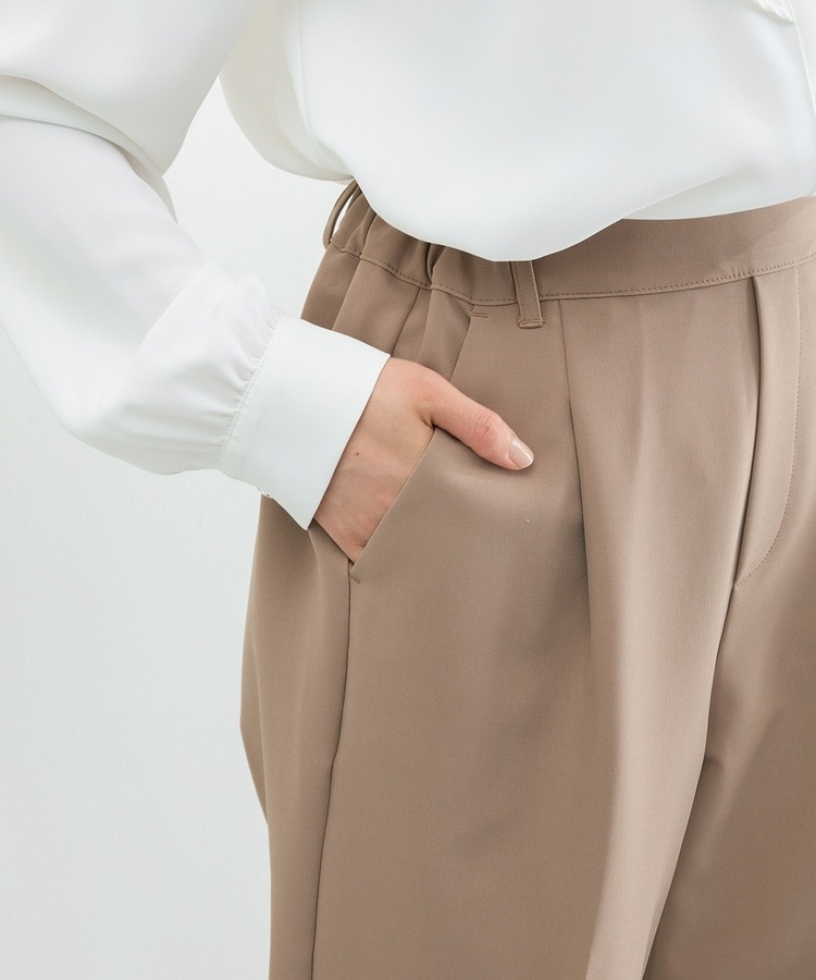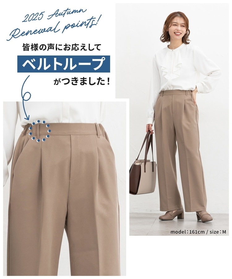 きちんと感のあるセンタープレスと腰回りのラインにこだわった美しいストレートシルエットで美脚効果も抜群。