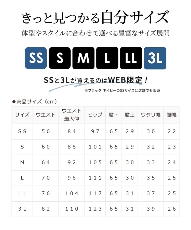 自分にぴったりが見つかる、SS〜3Lまで揃った豊富なサイズ展開。