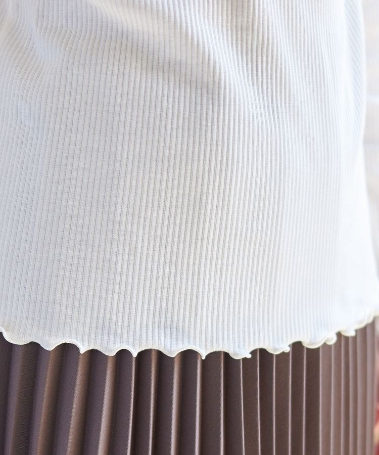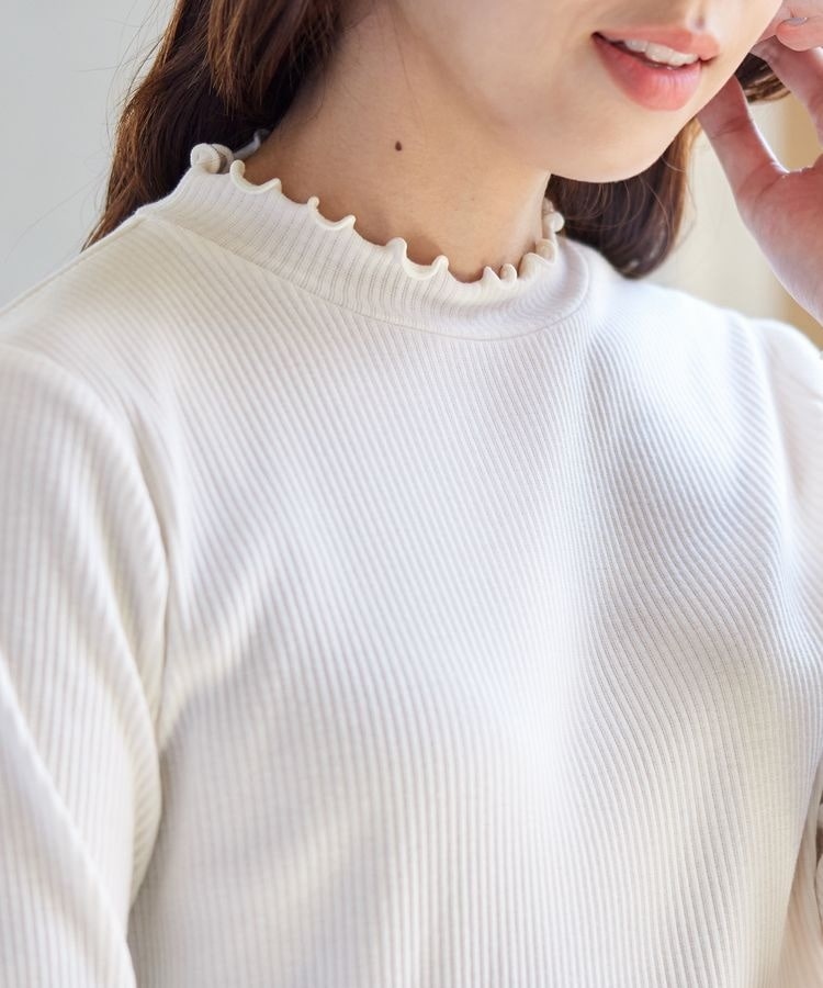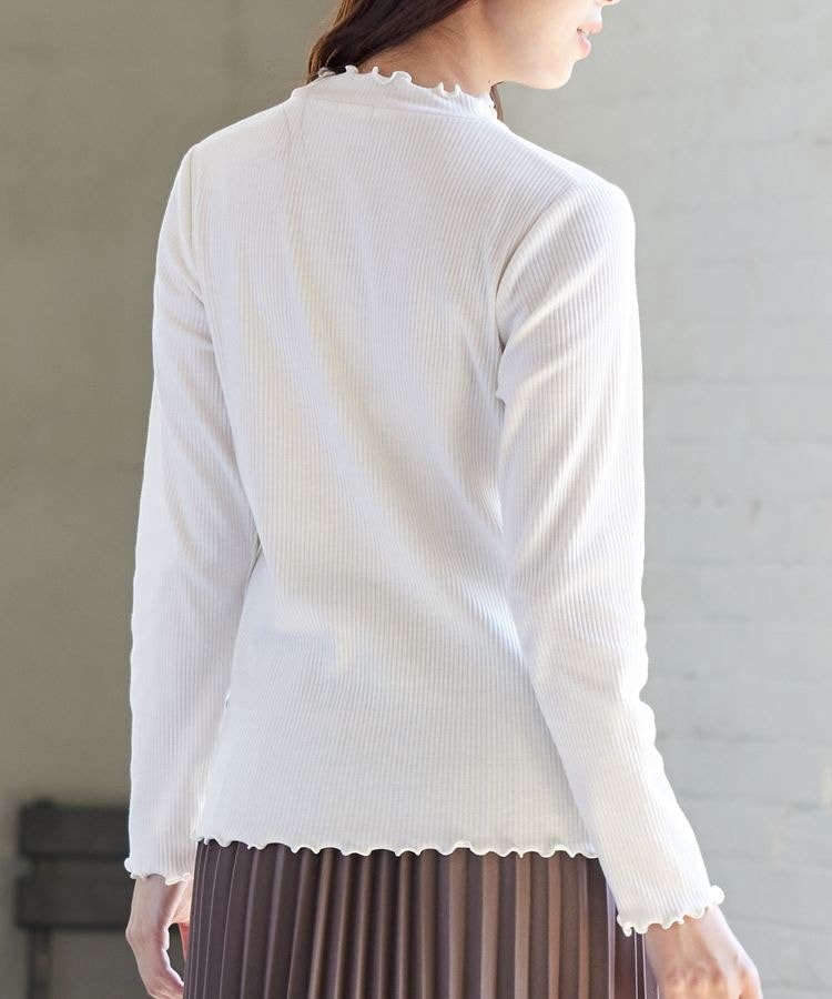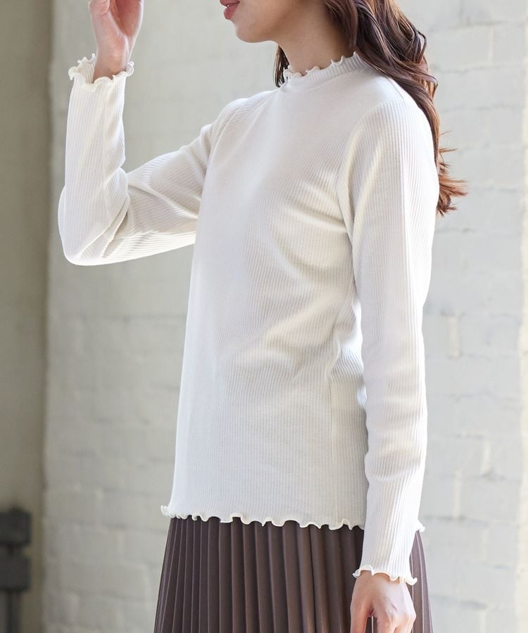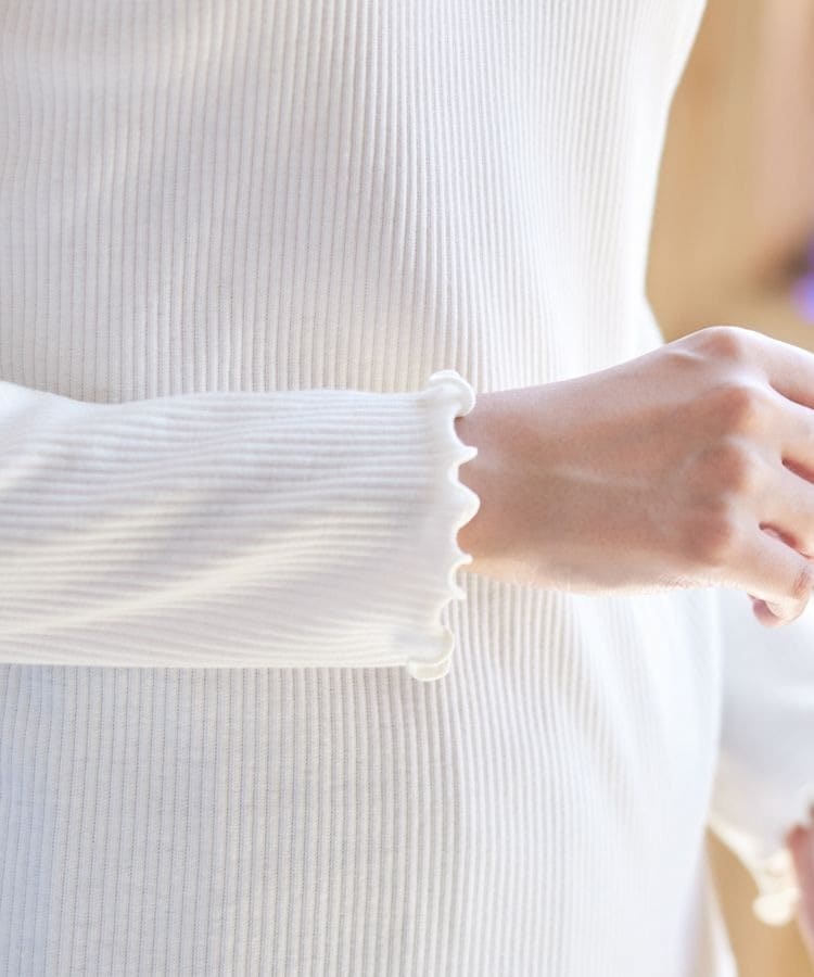 縦ラインがすっきり見えを叶えるプチハイネックトップスは、メローロックでさりげない甘さをプラス。