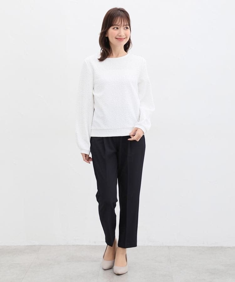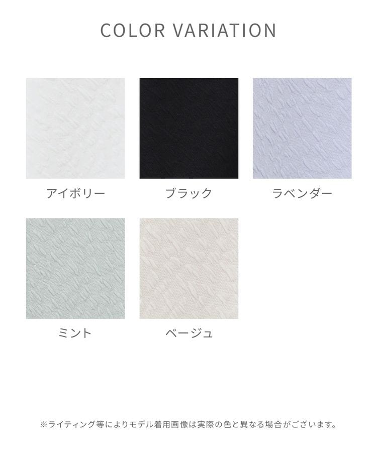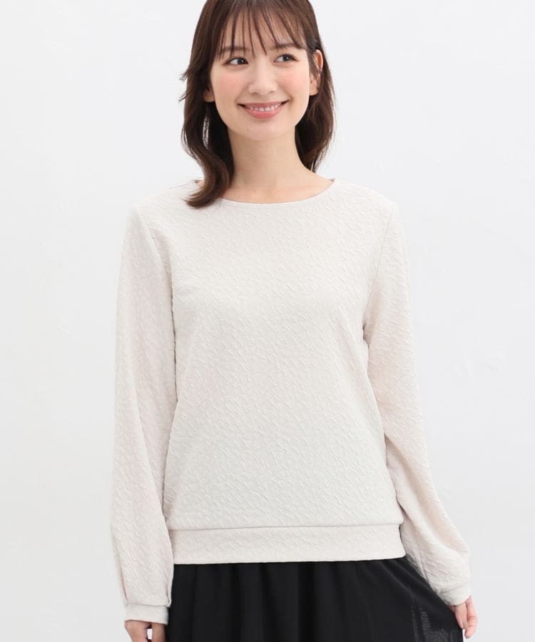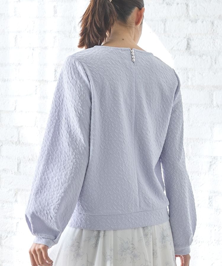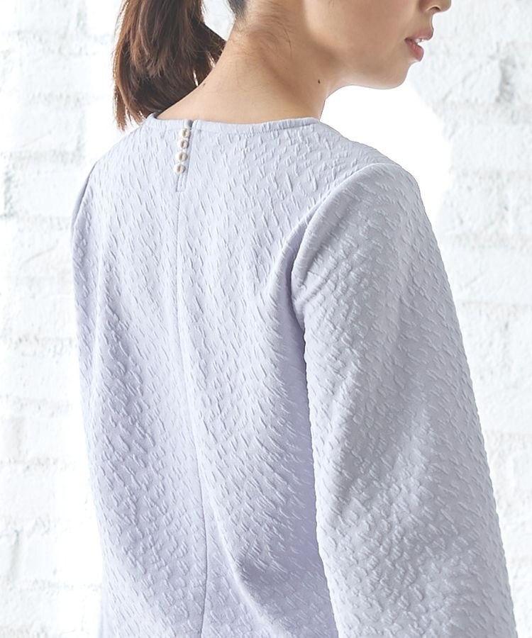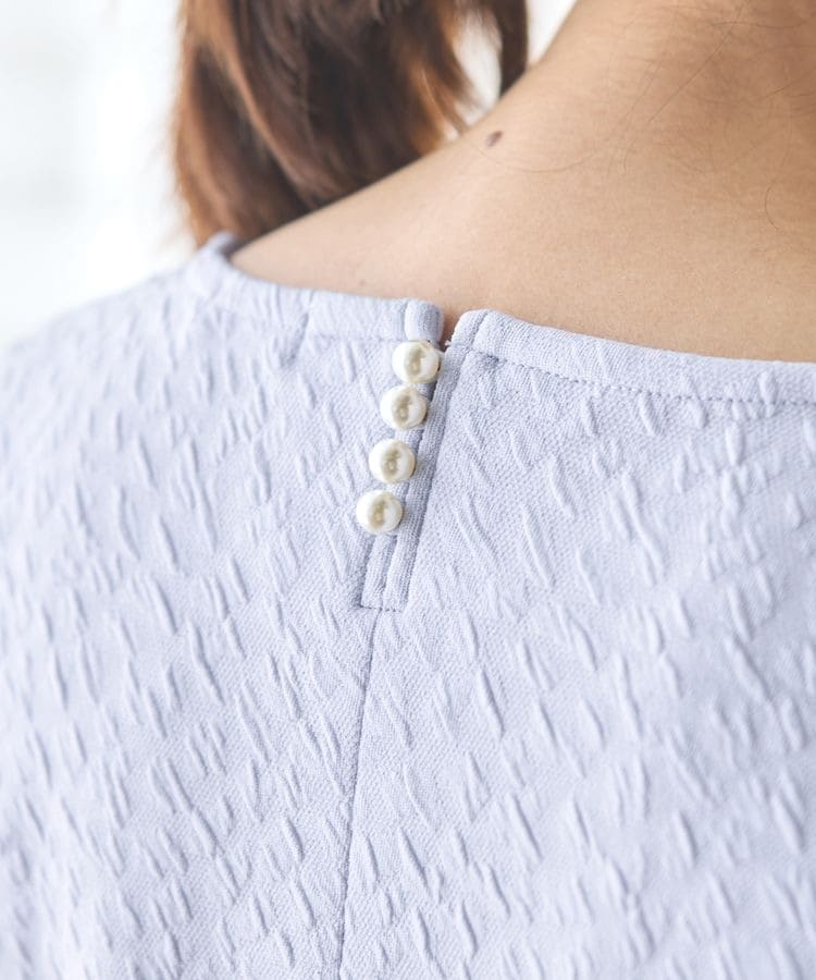 ポコポコ素材とバックネックのパール風ボタンが大人可愛いデザイン。