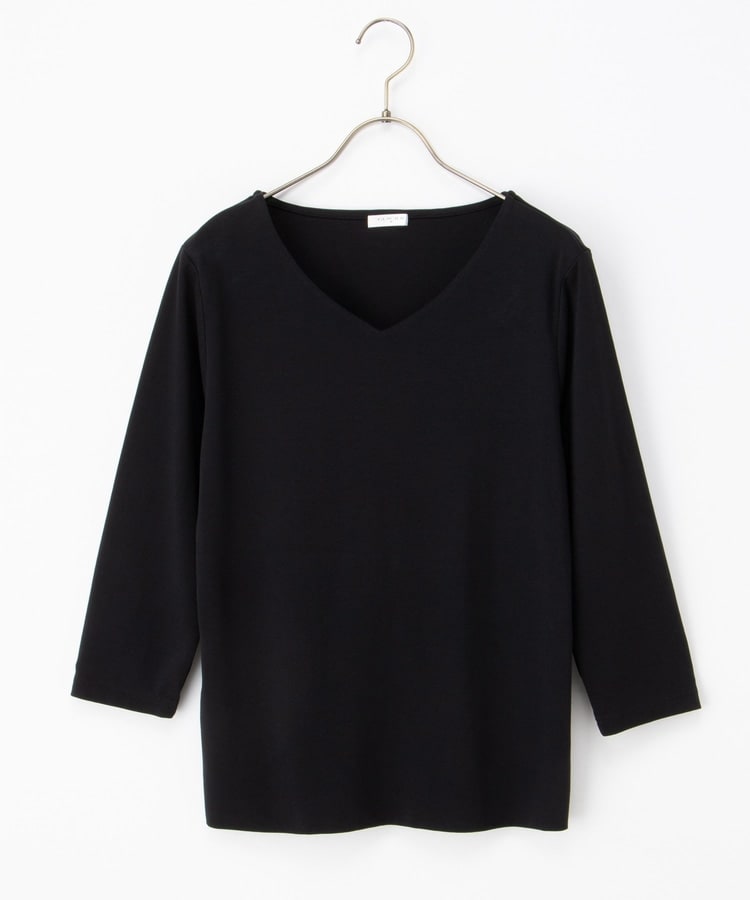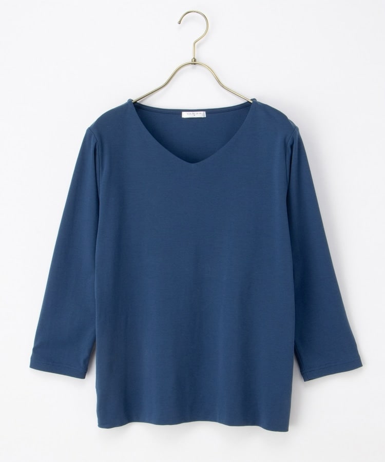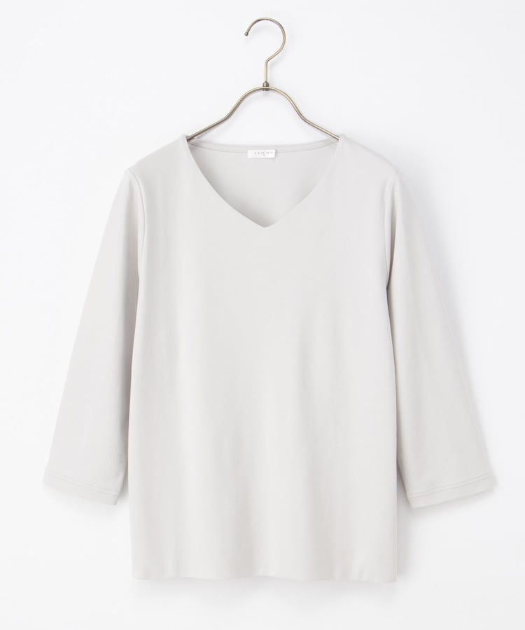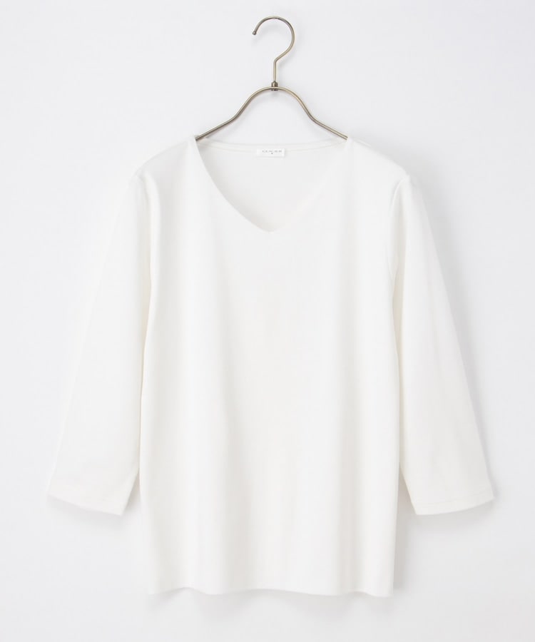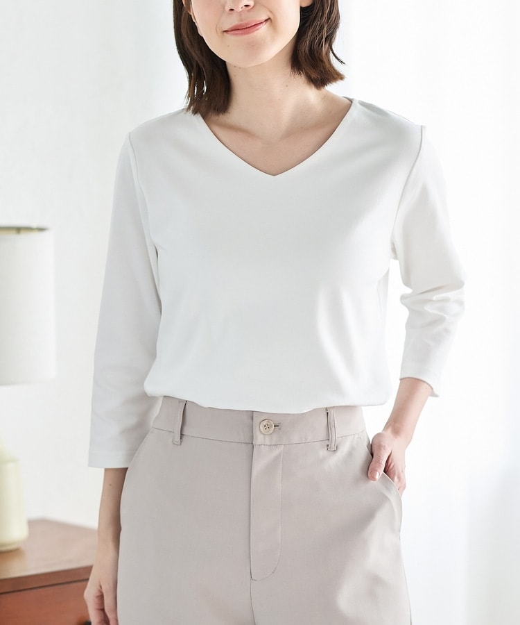 ステッチをなくした首もとすっきりのVネックで、高見えが叶う上品デザイン。