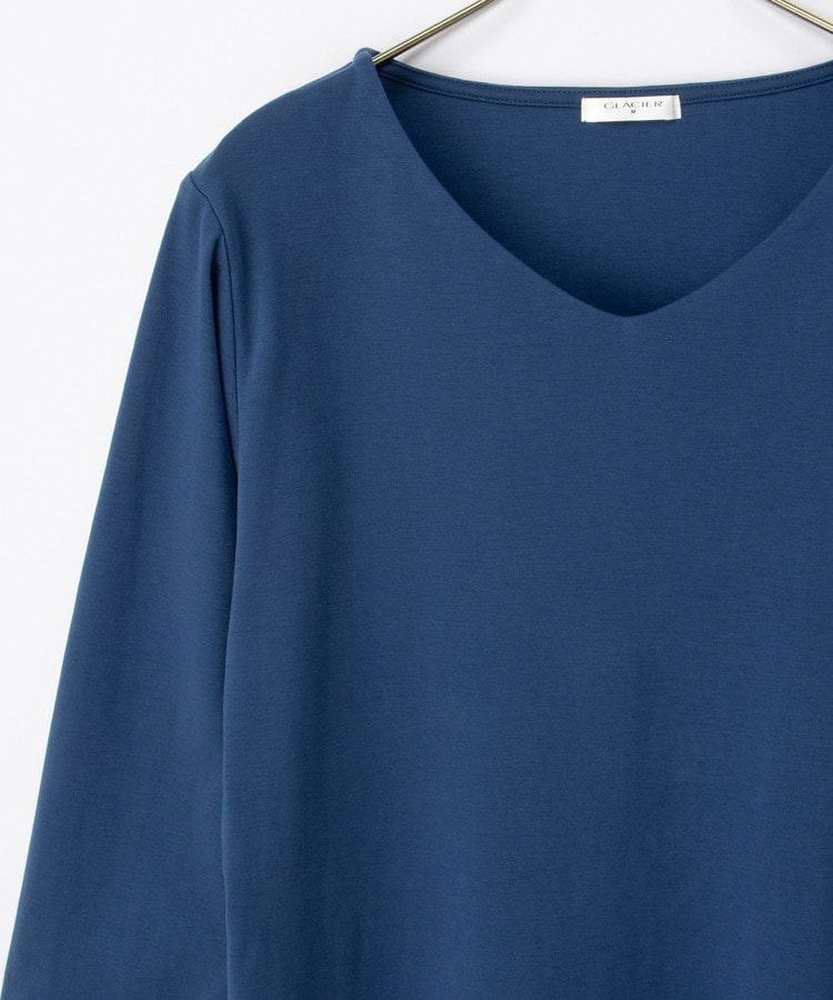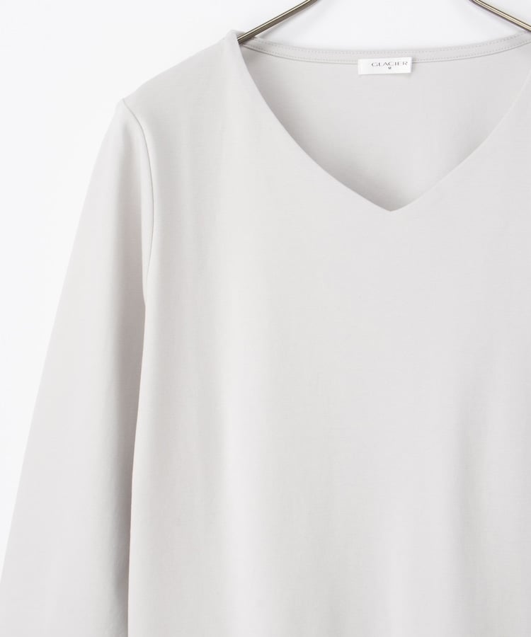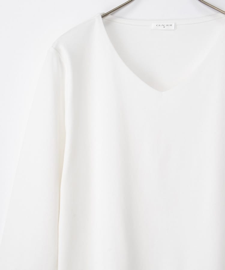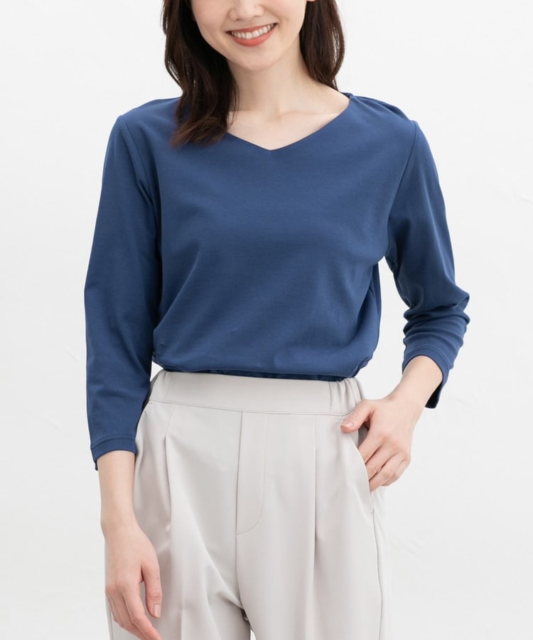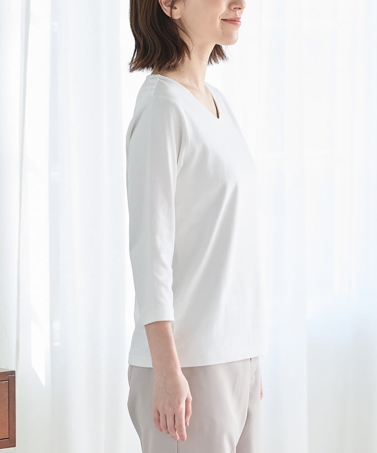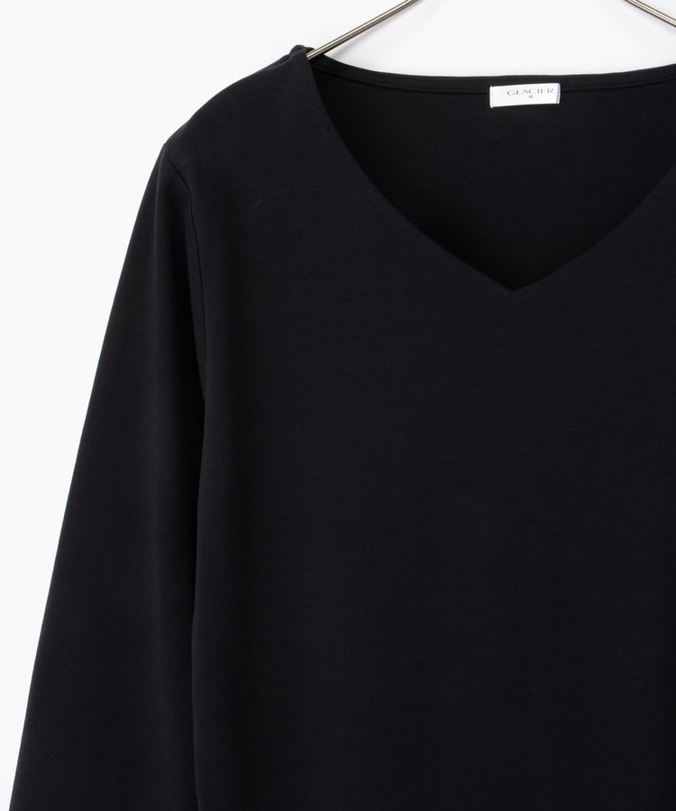 ステッチをなくした首もとすっきりのVネックで、高見えが叶う上品デザイン。