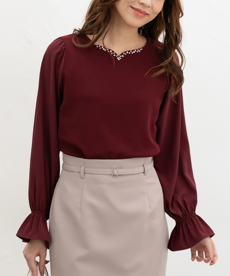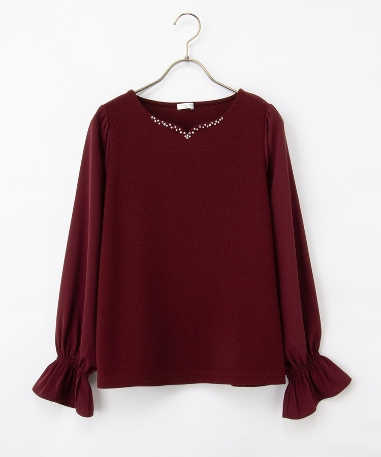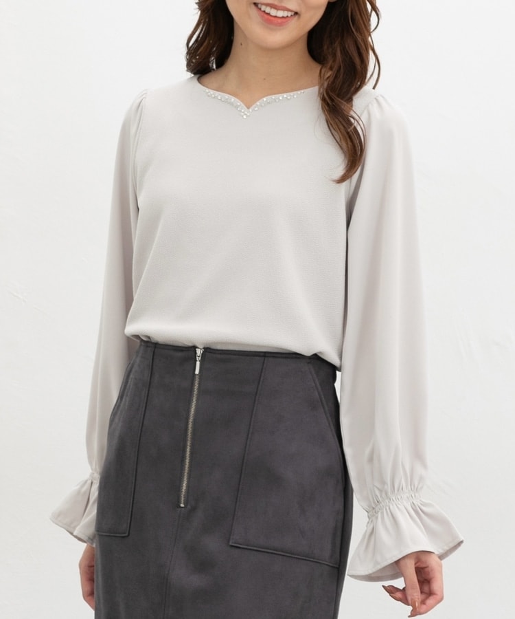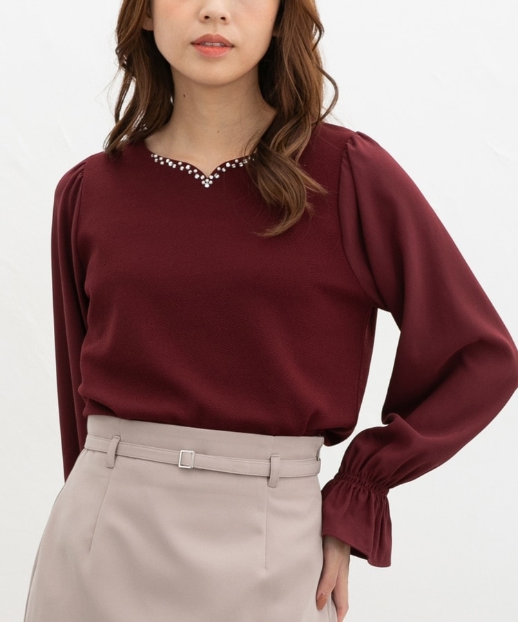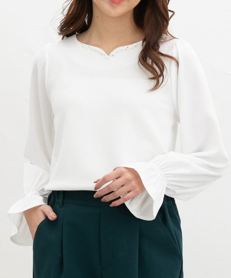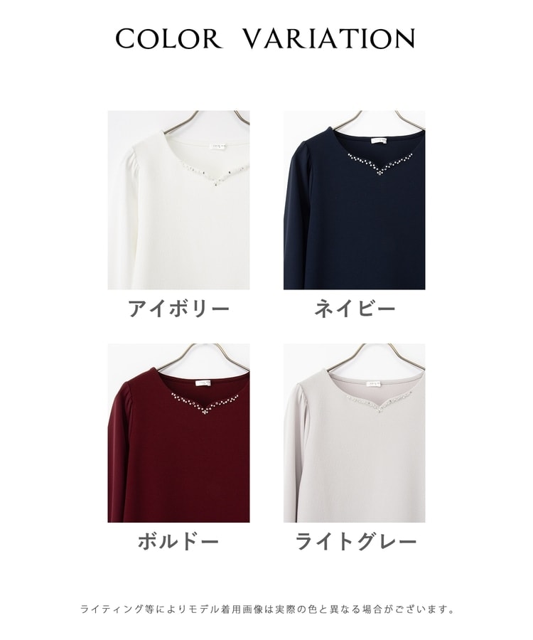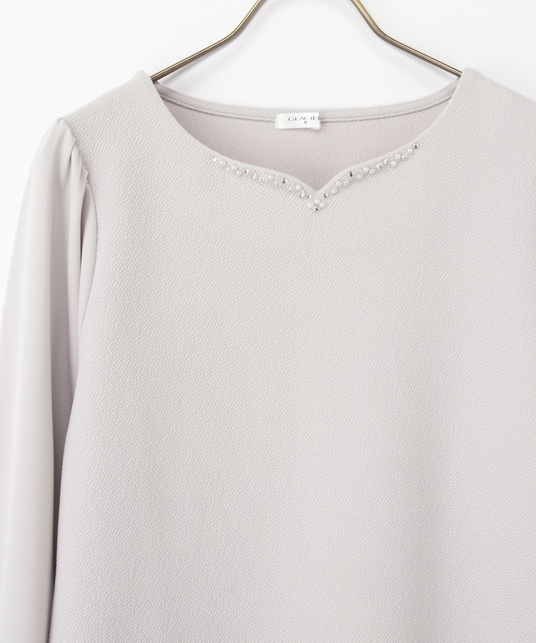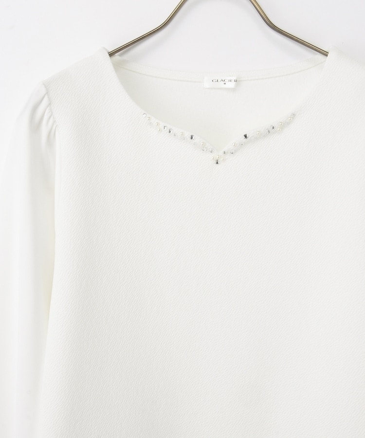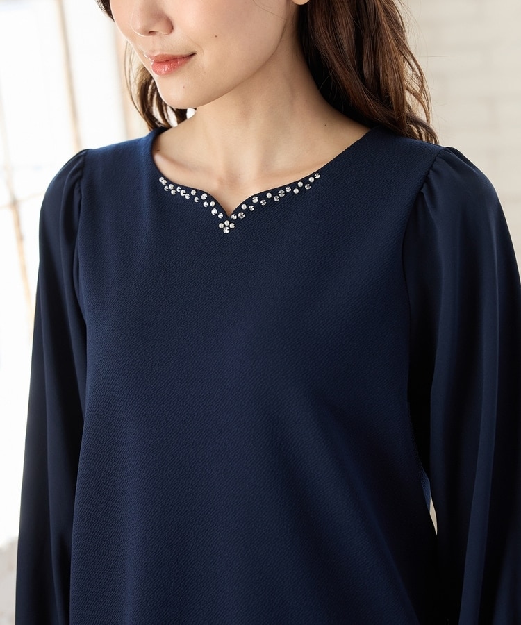 ハートネックと衿ぐりのビジュー使いが華やかで上品なデザイン。