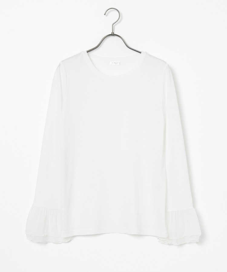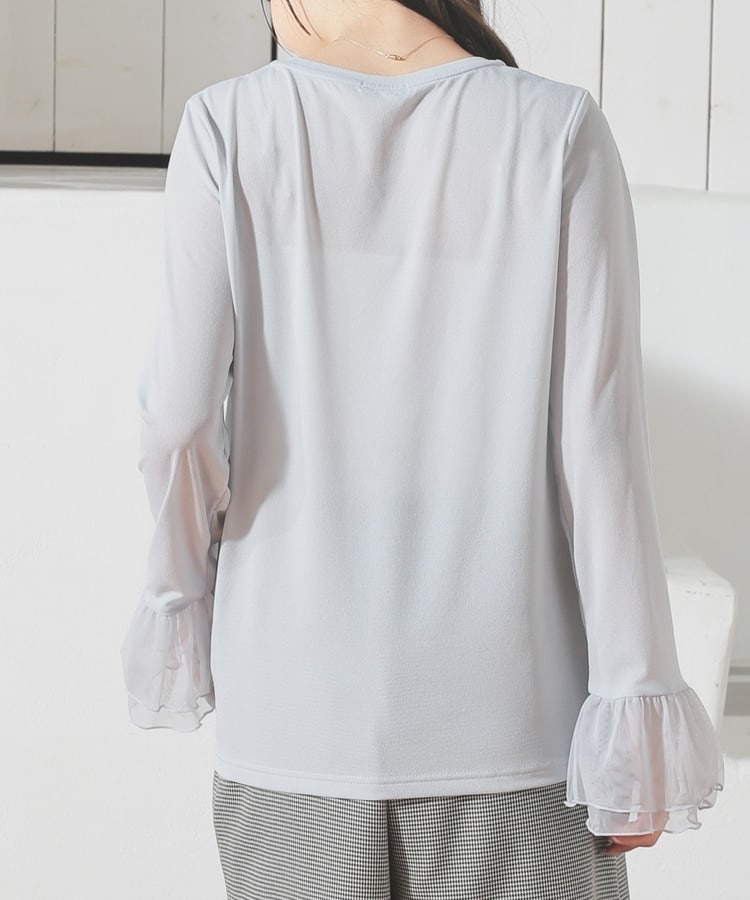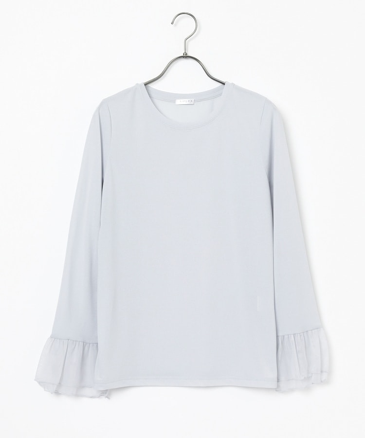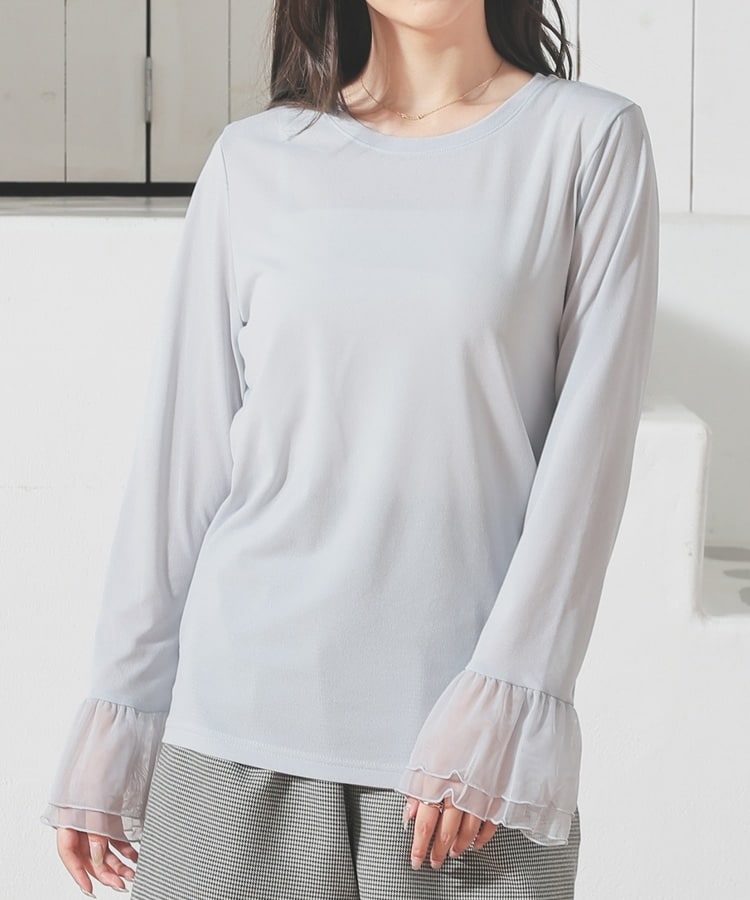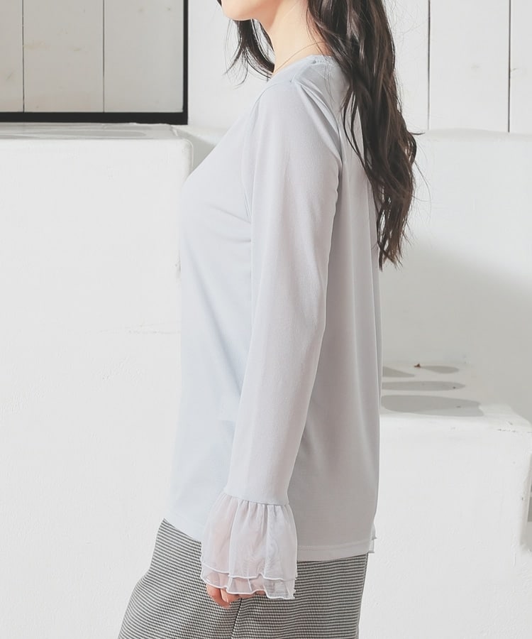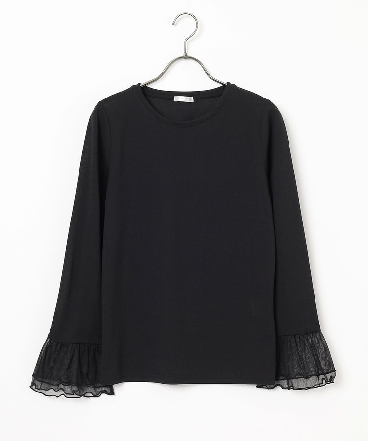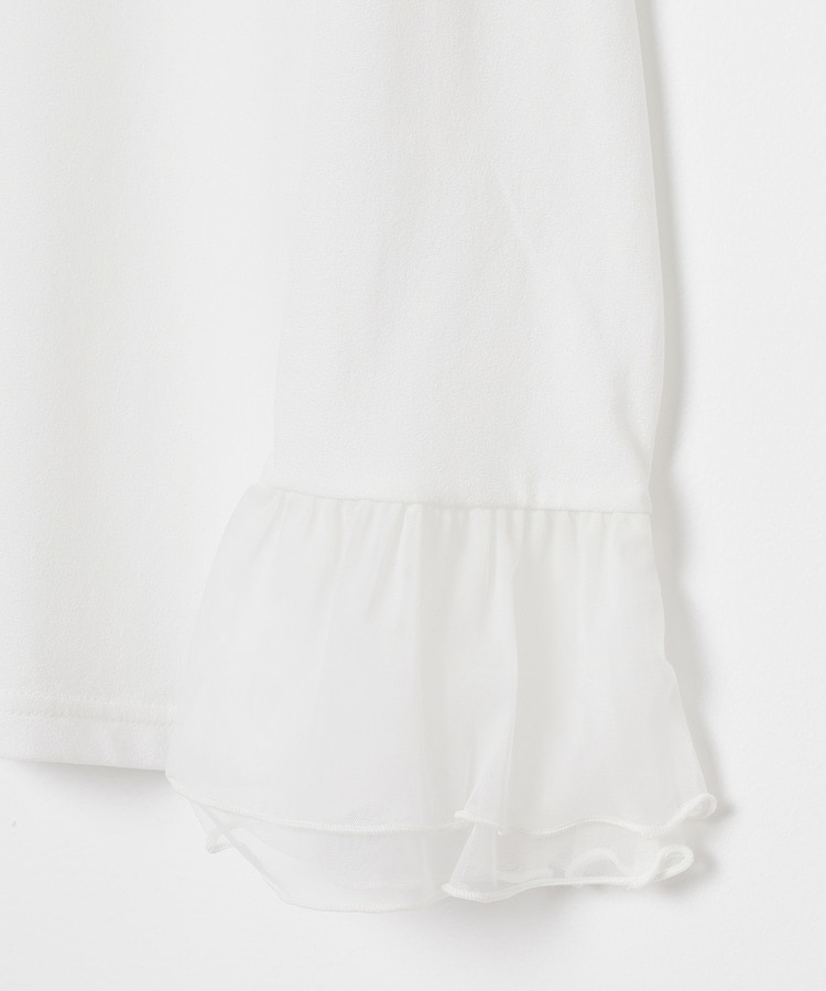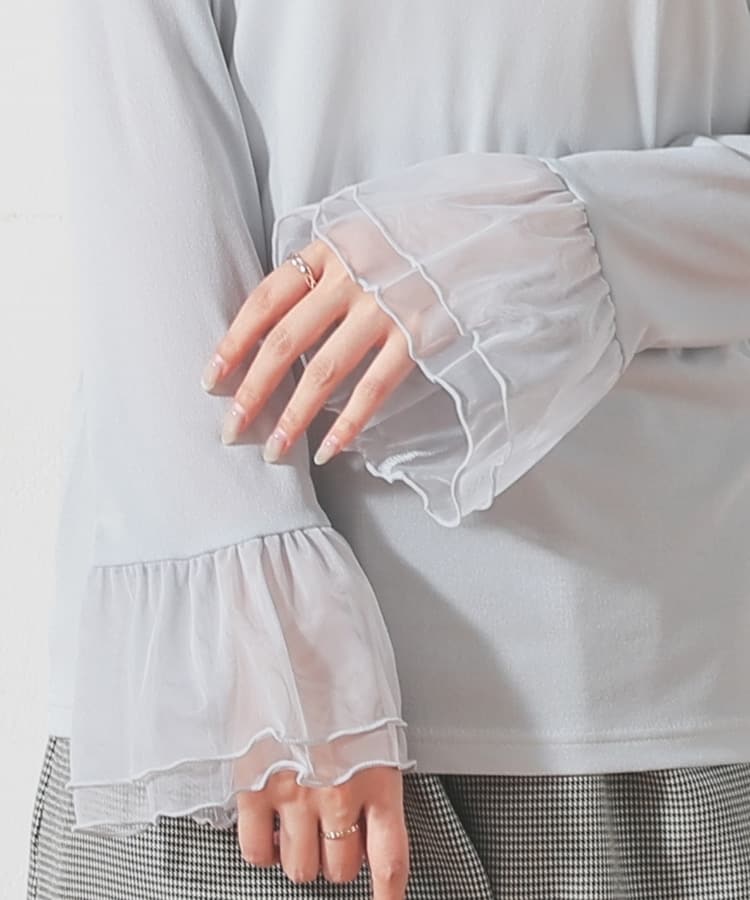 透け感のあるチュールを2枚重ねた袖口フリルがフェミニンなデザイン。