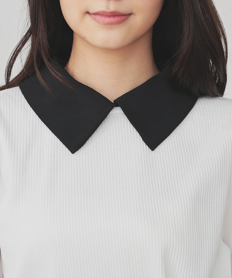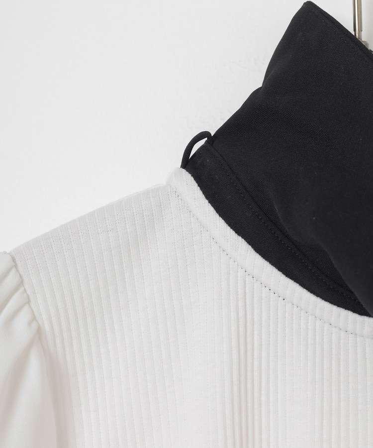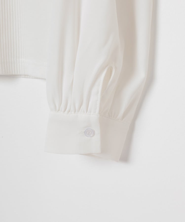 肩と袖口にギャザーを入れた、異素材使いのふんわり袖で、さり気なく二の腕をカバー。
