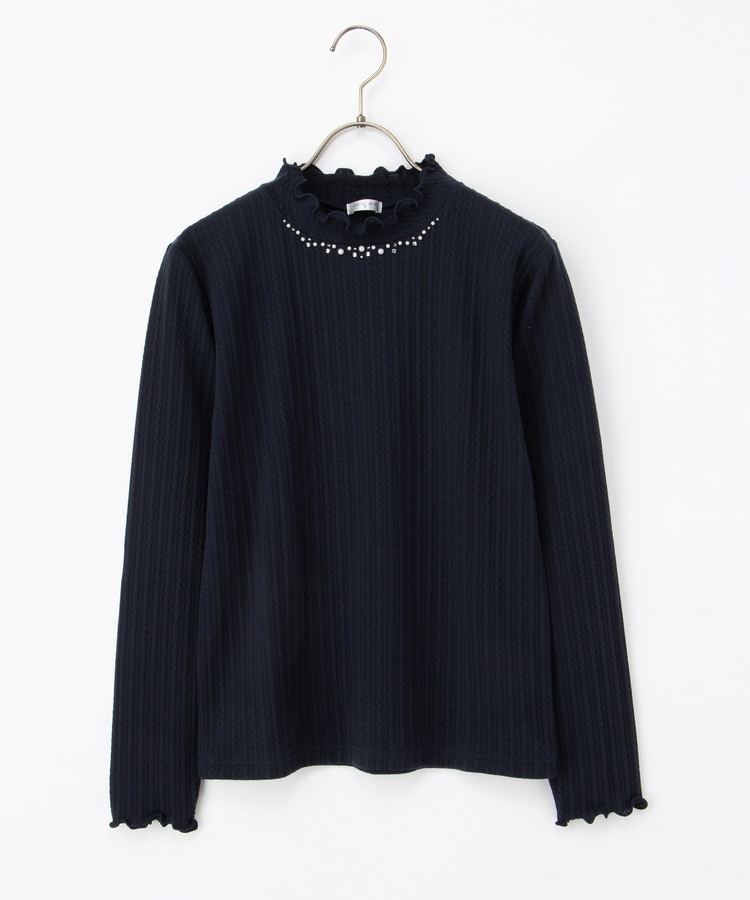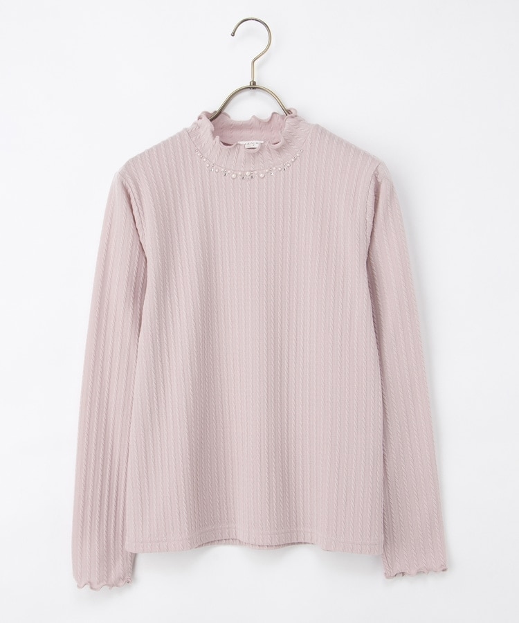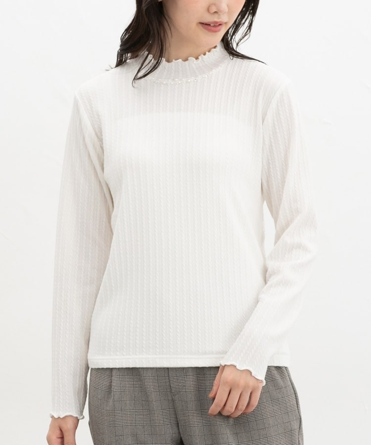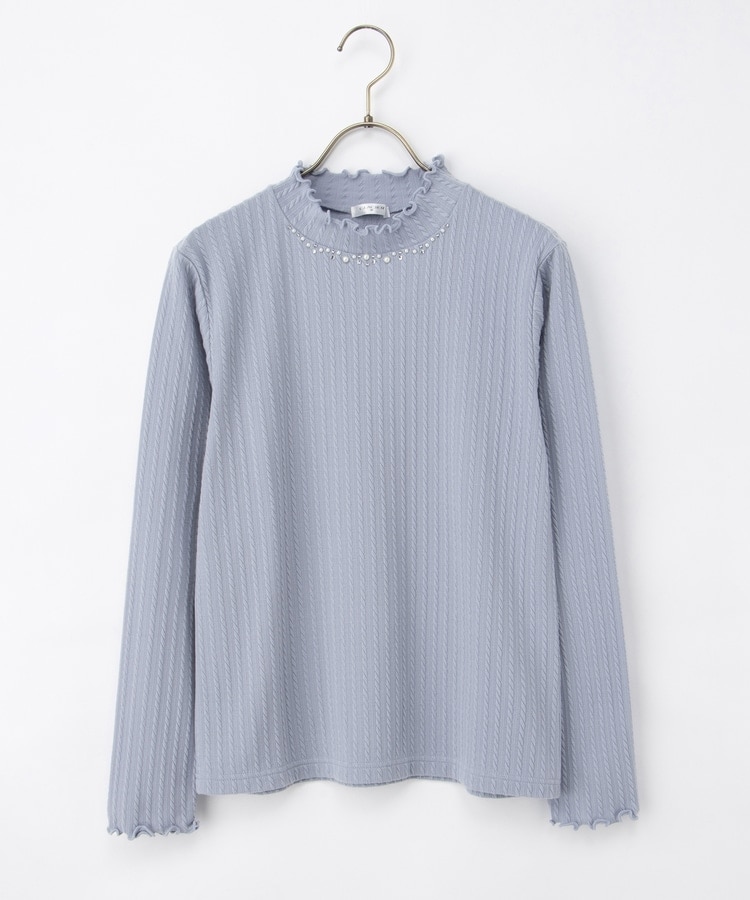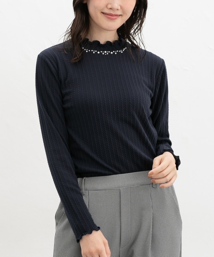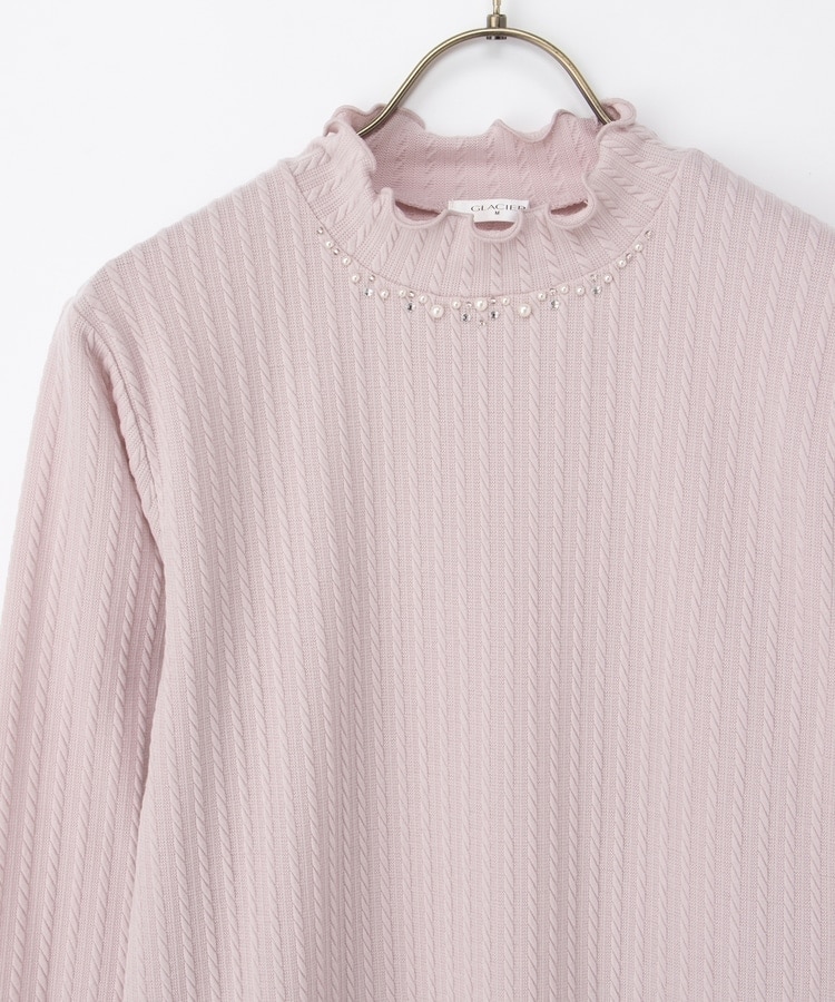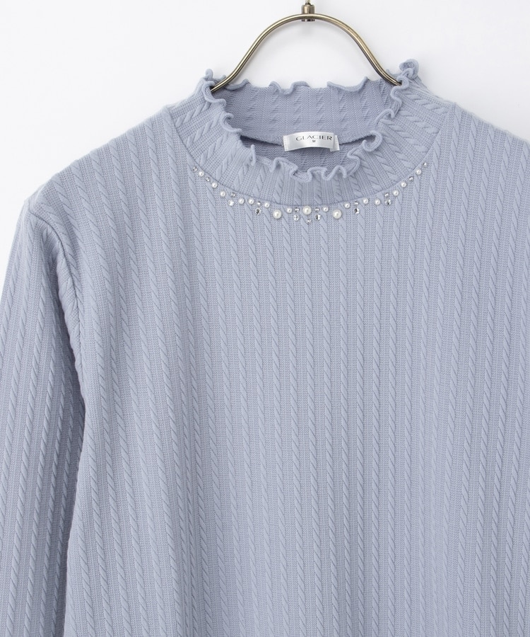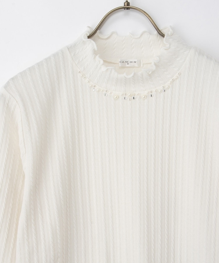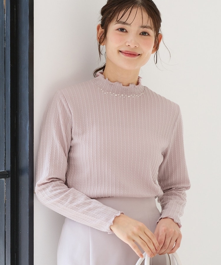 衿ぐり・袖口のメローと衿元のビジューがフェミニンなデザイン。