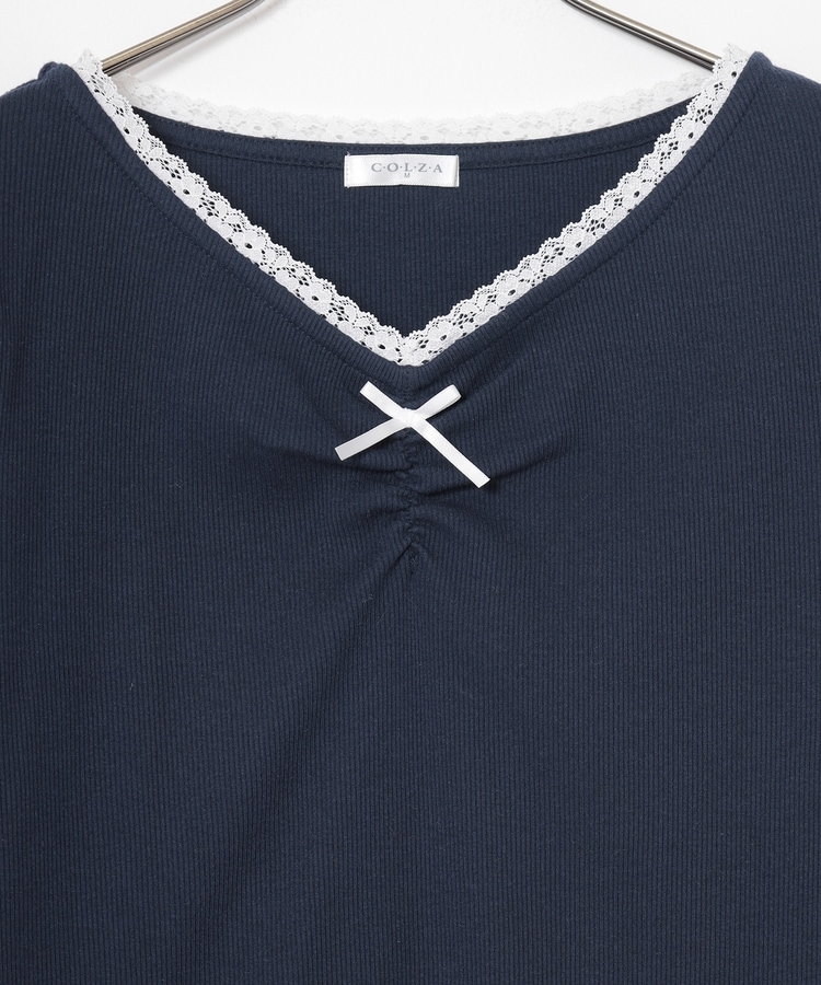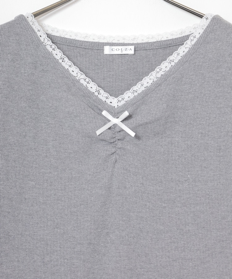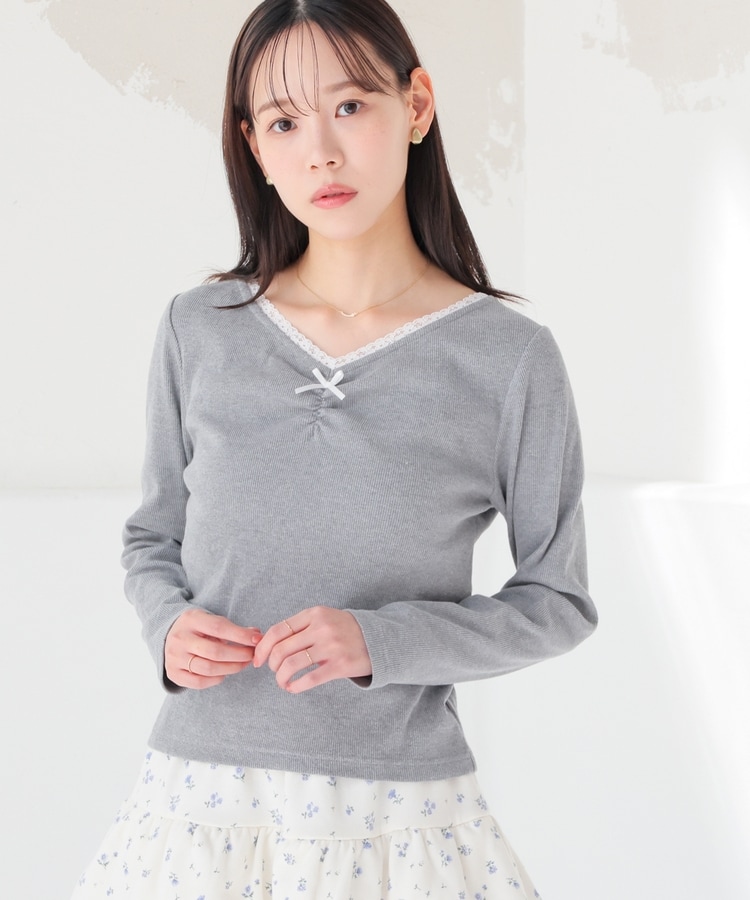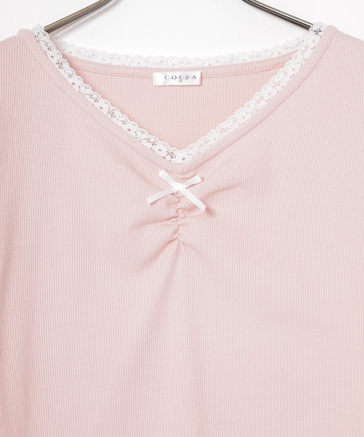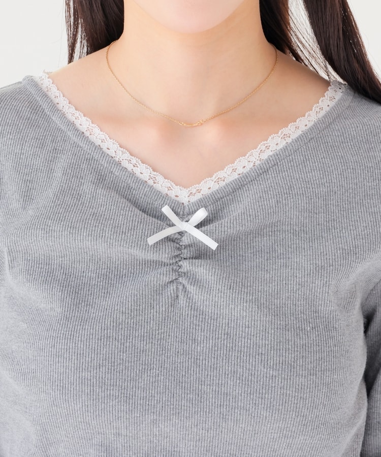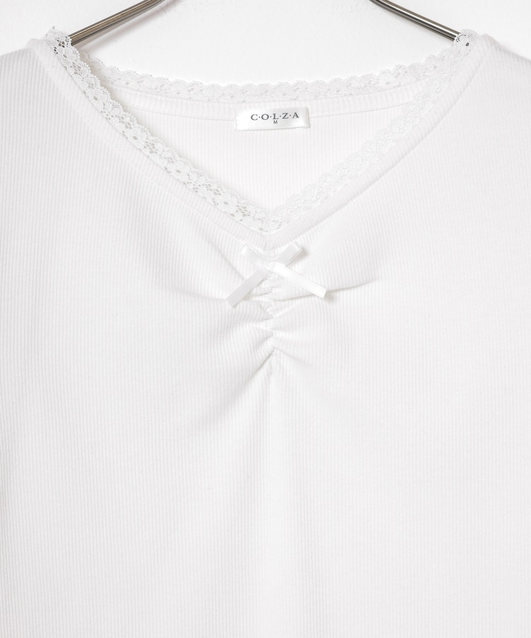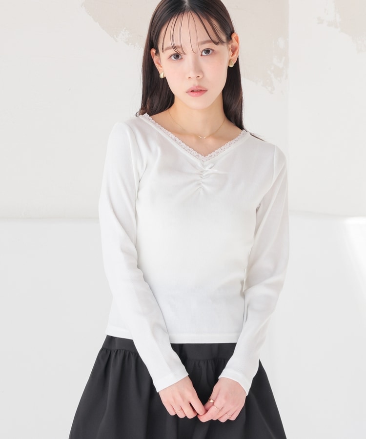 胸元ギャザーと衿ぐりレースがフェミニンなデザイン。