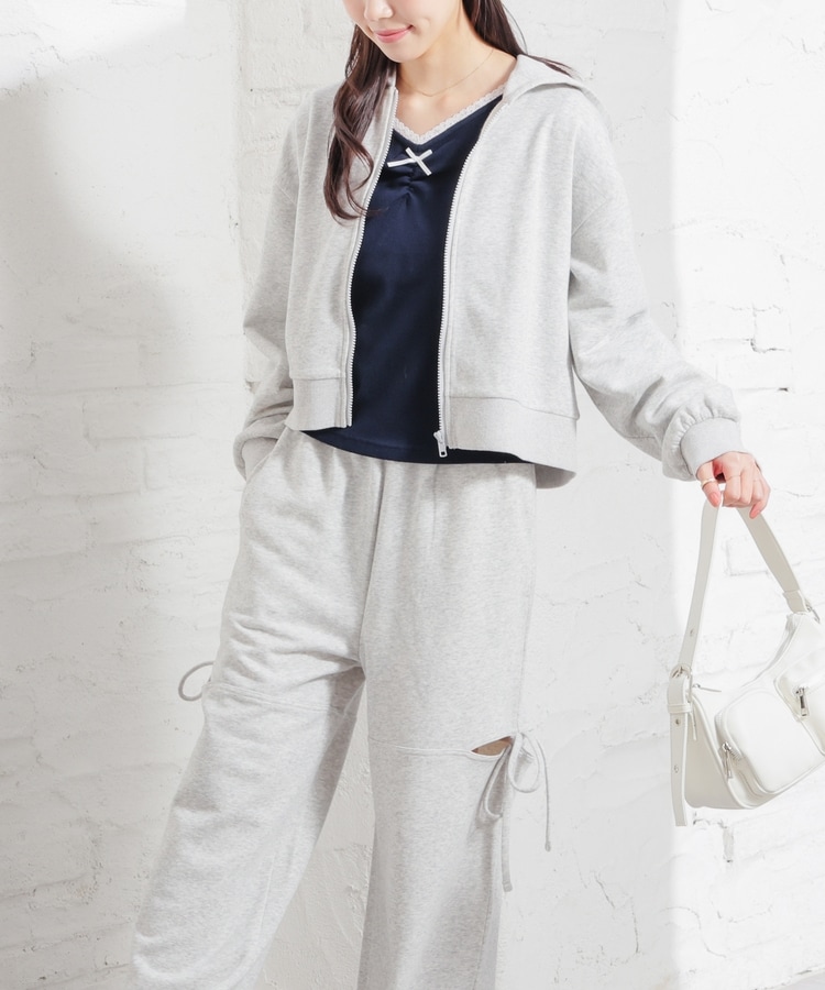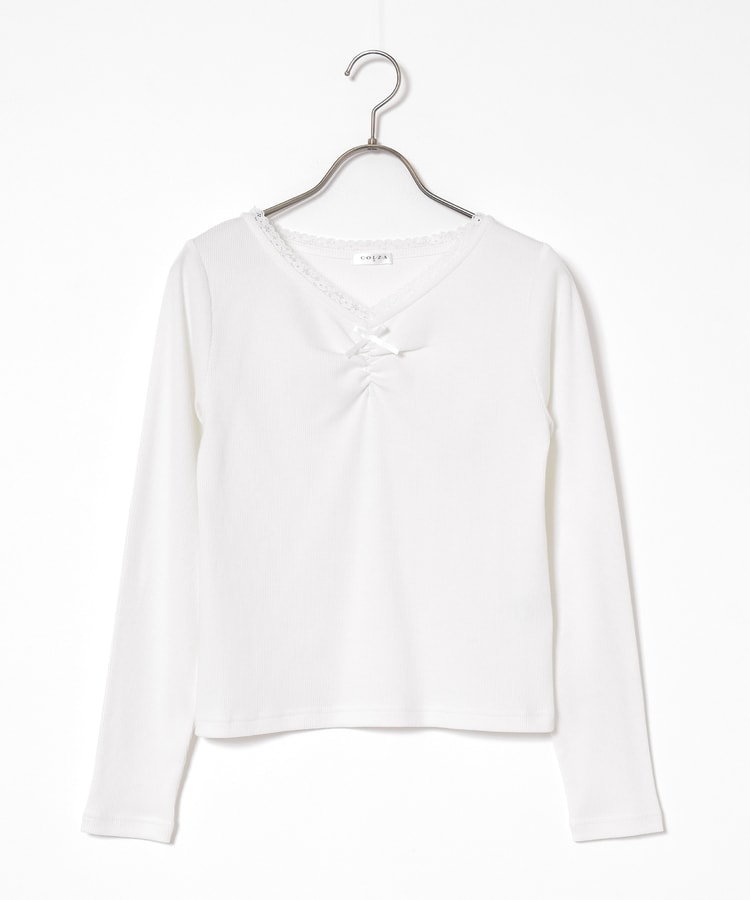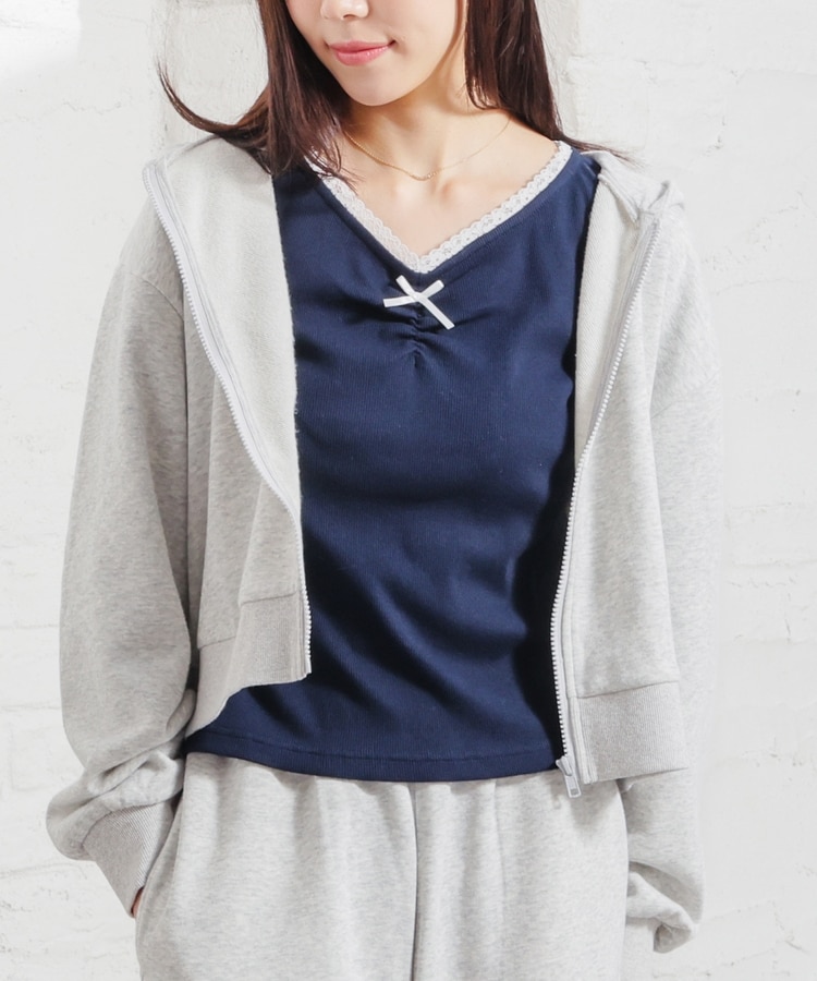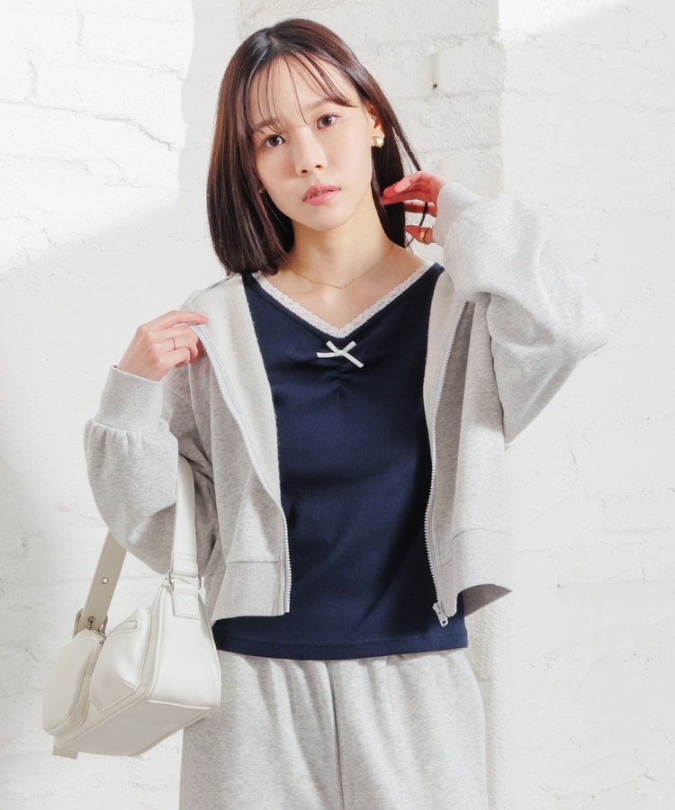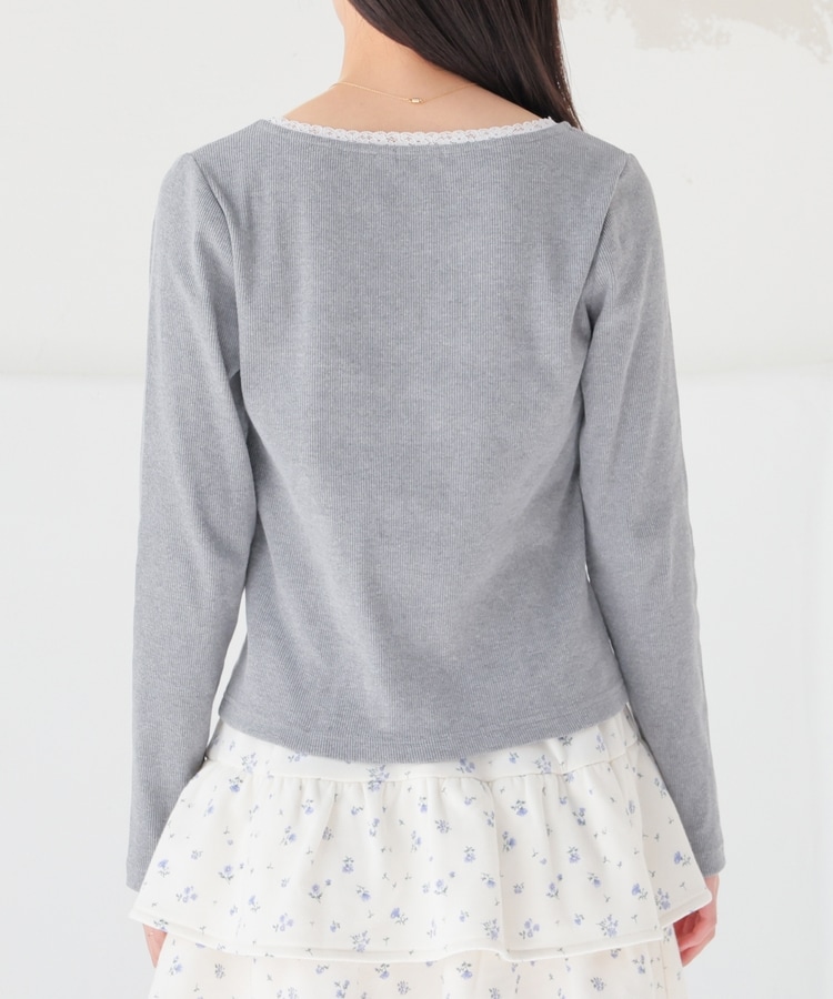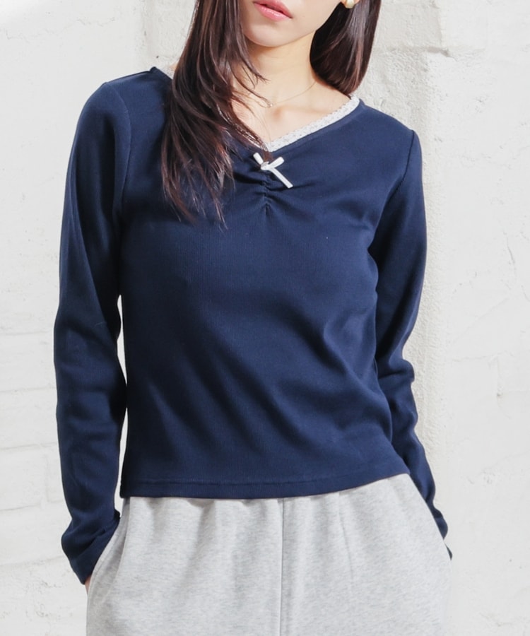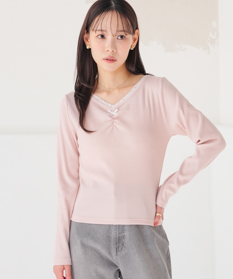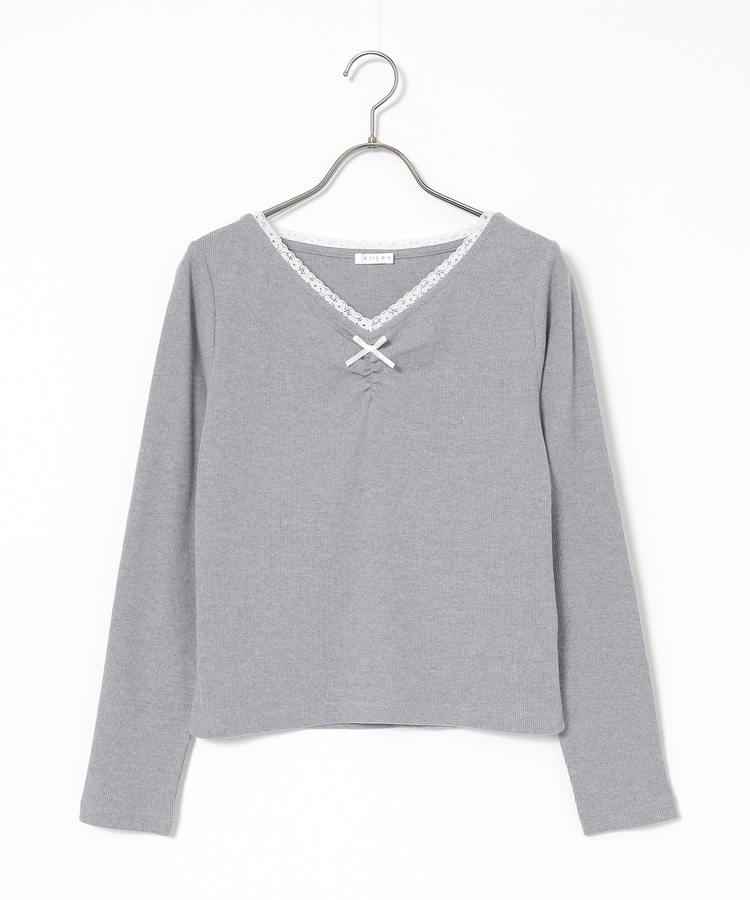 胸元ギャザーと衿ぐりレースがフェミニンなデザイン。
