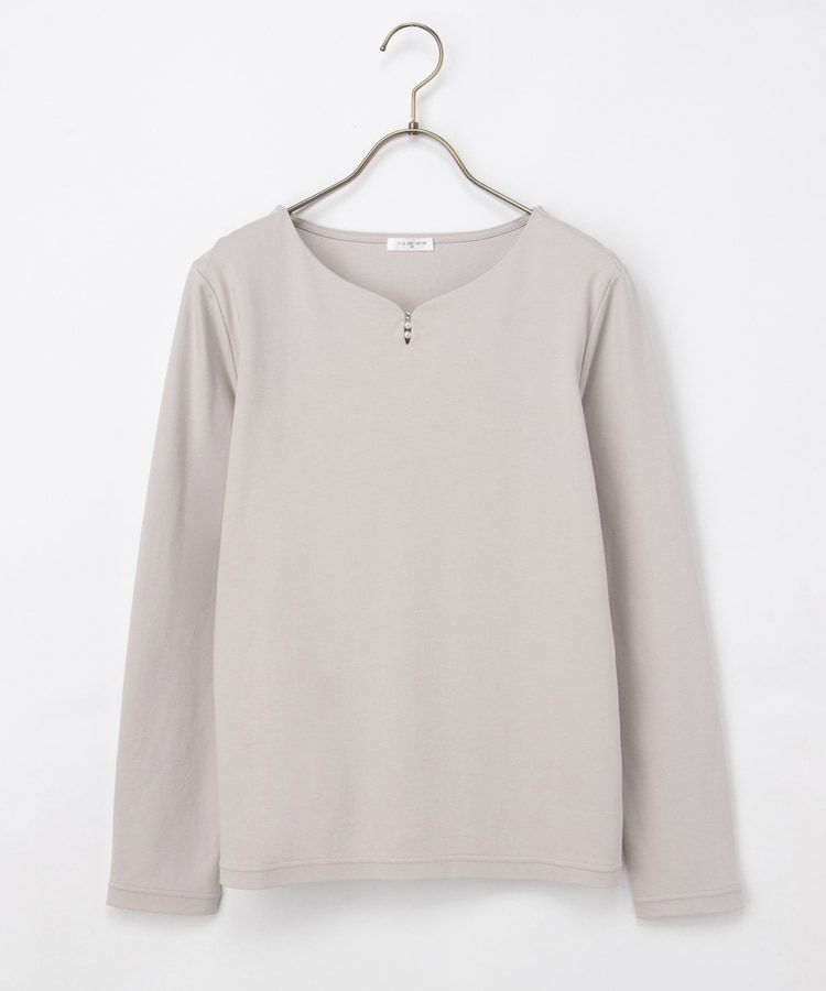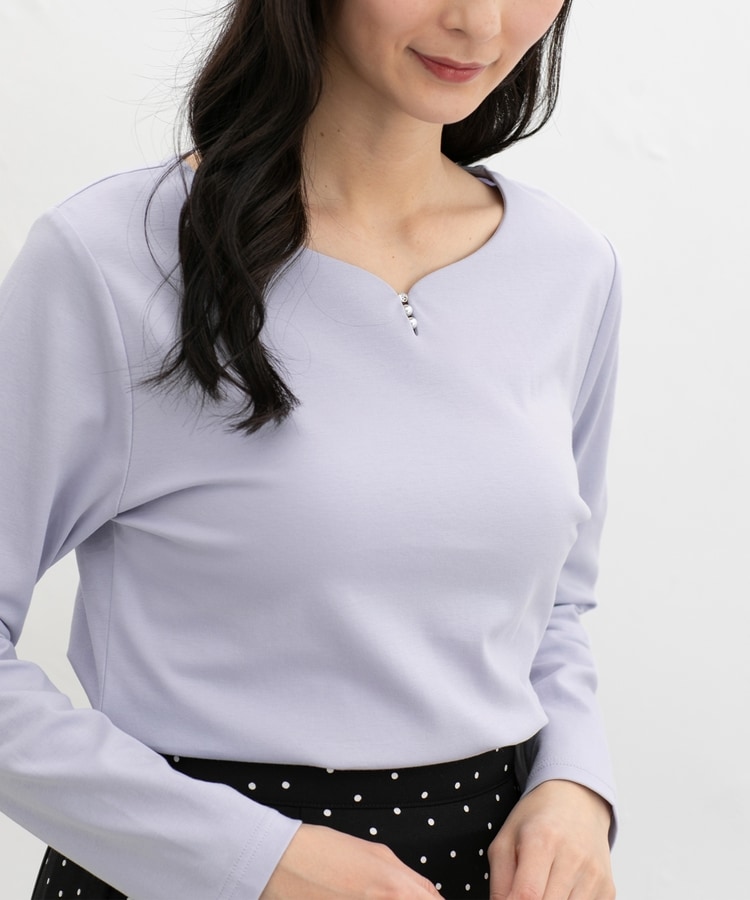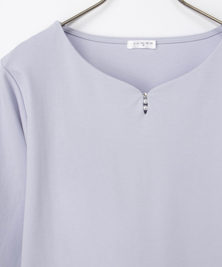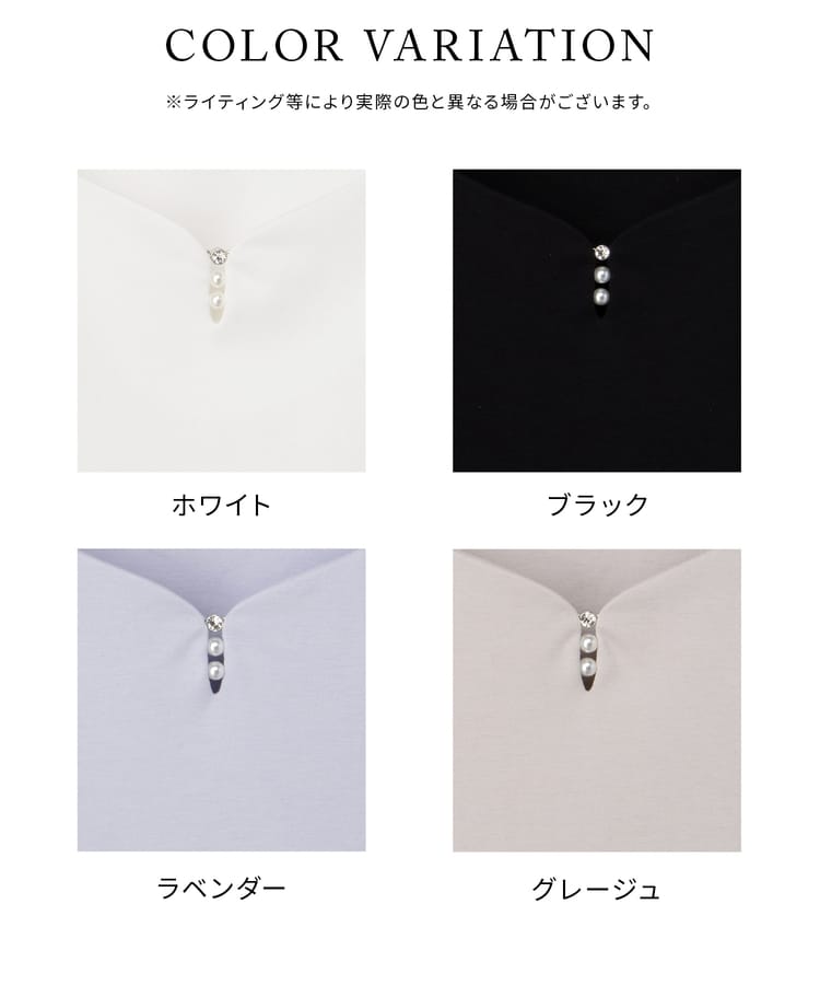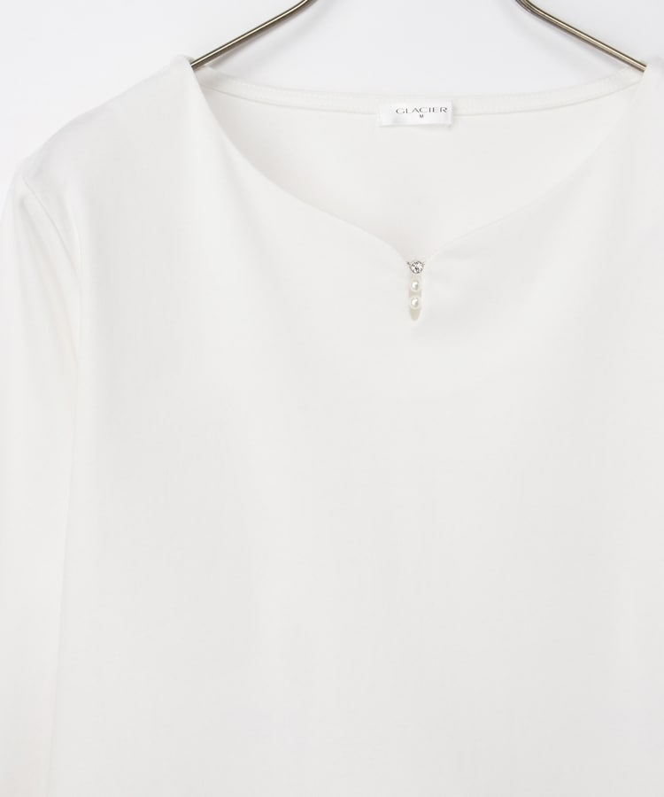 首元がすっきり見えるキーネックに、パール風ビーズやラインストーンを添えた、華やかで上品なデザイン。