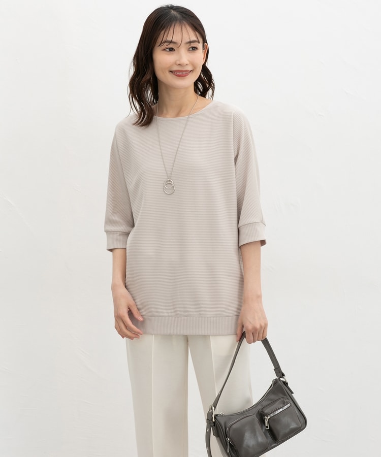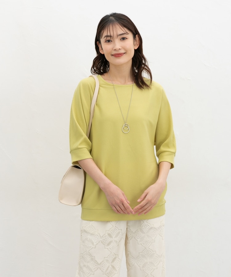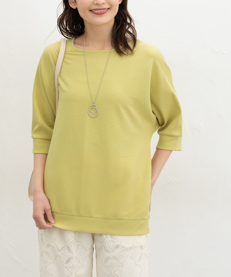 ストレッチの利いたレーヨン混テレコ素材を横に使ったボーダー風の編地で、着心地も洒落度も◎