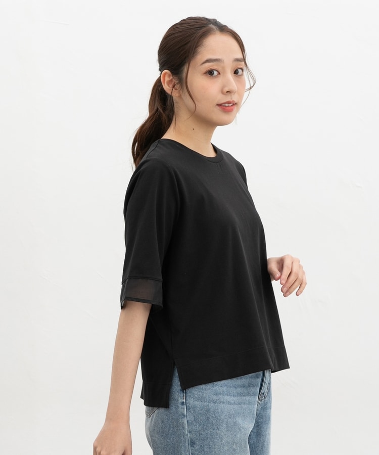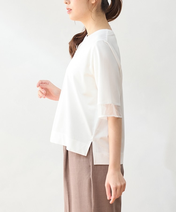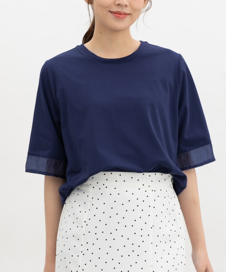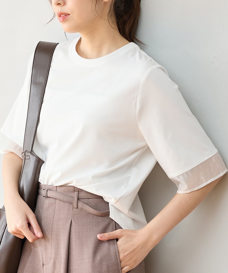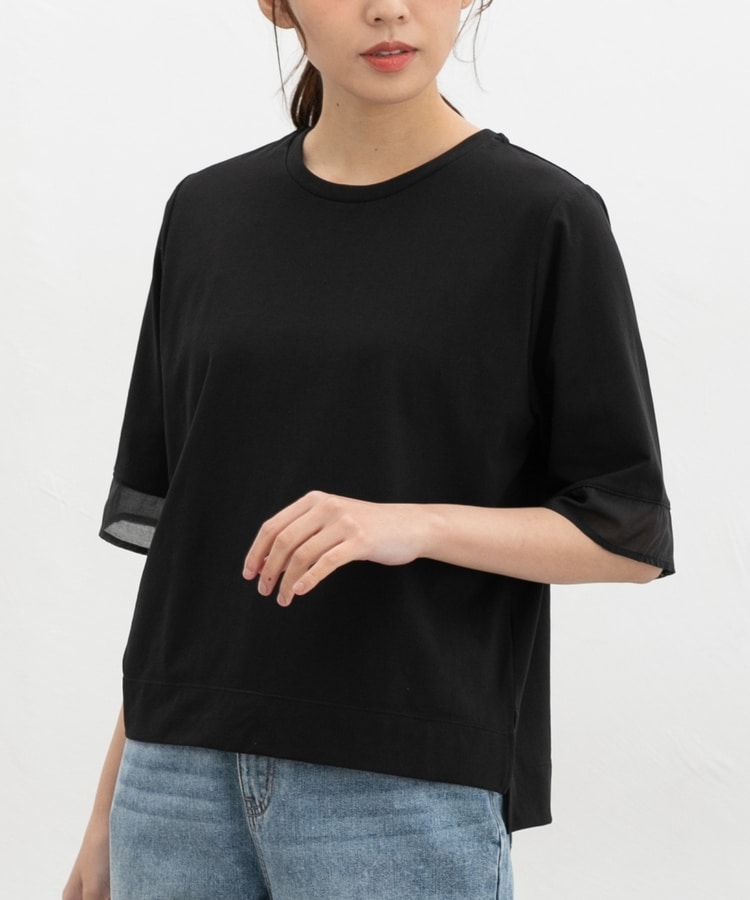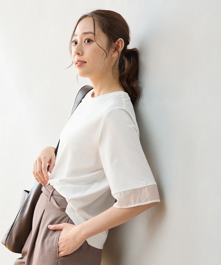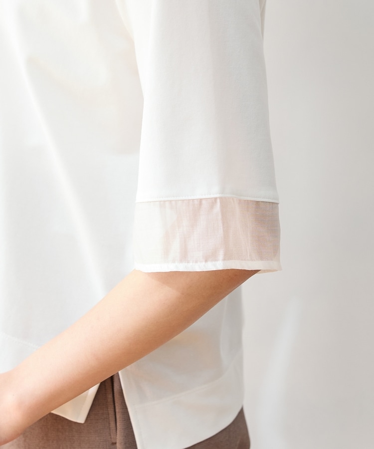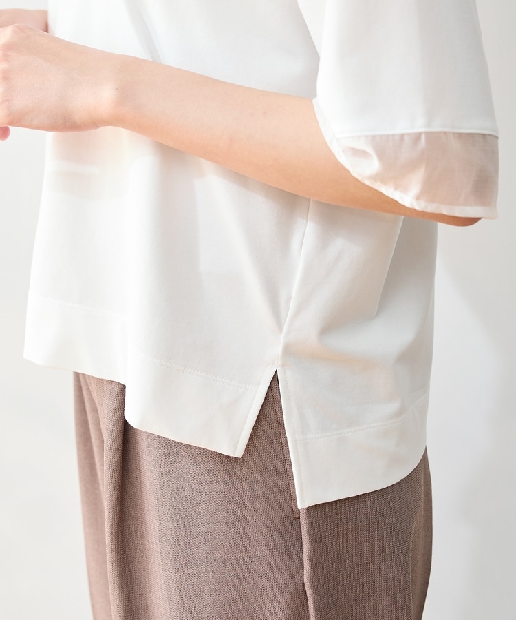長めの袖の袖口を程よい透け感のシアー素材で切り替えた、二の腕を隠しながら清涼感もあるデザイン。