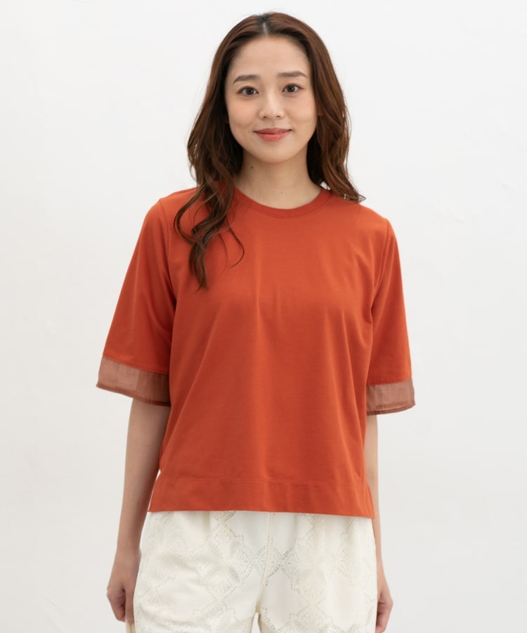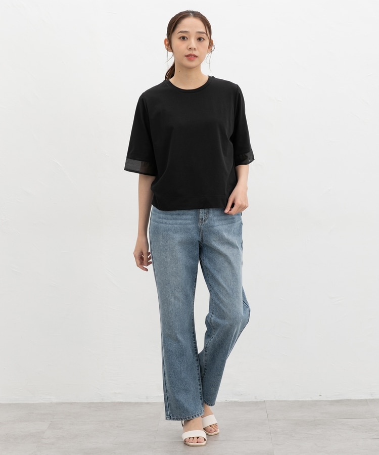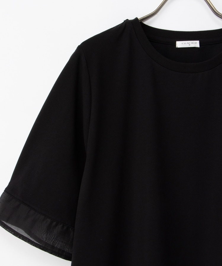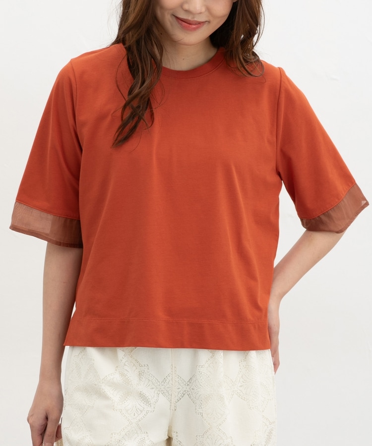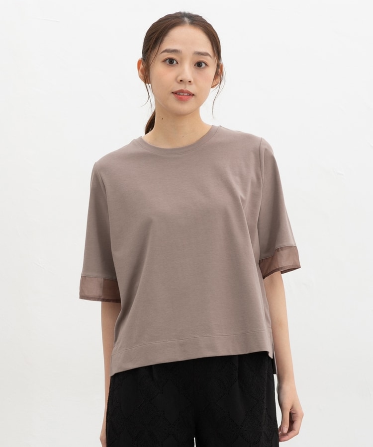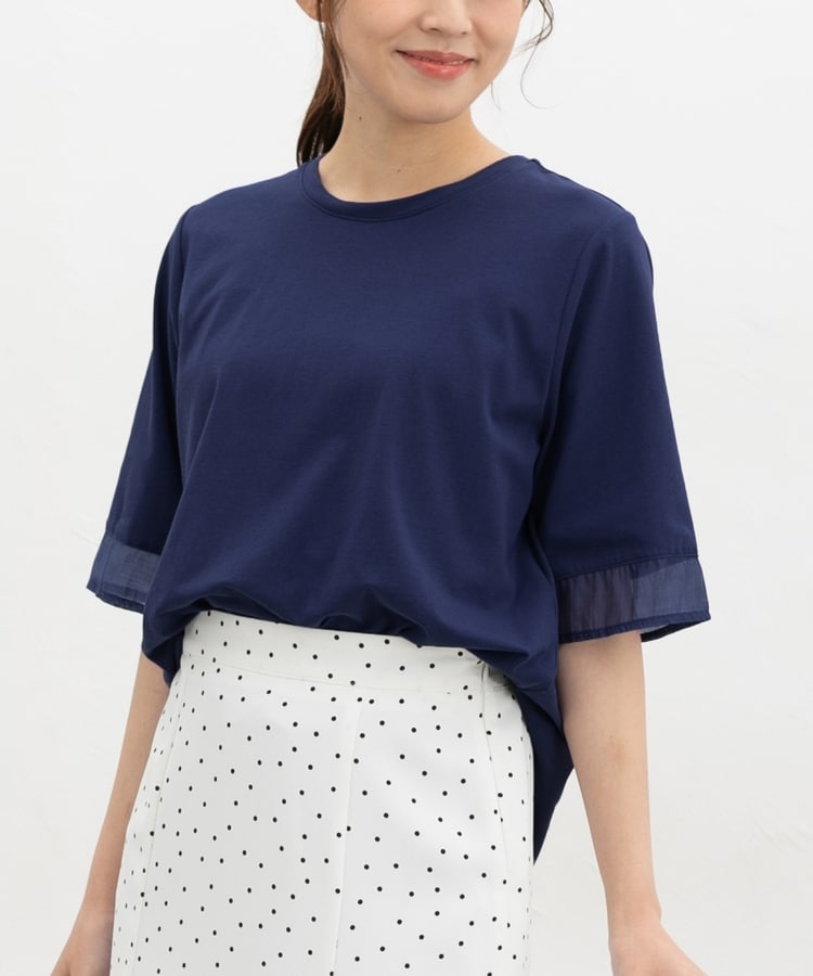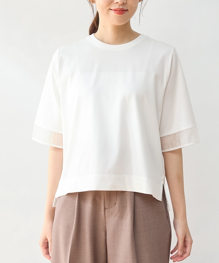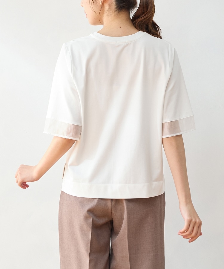 長めの袖の袖口を程よい透け感のシアー素材で切り替えた、二の腕を隠しながら清涼感もあるデザイン。