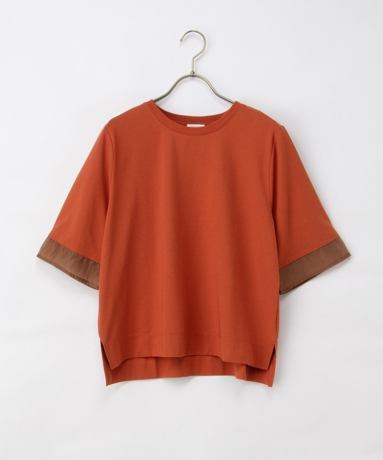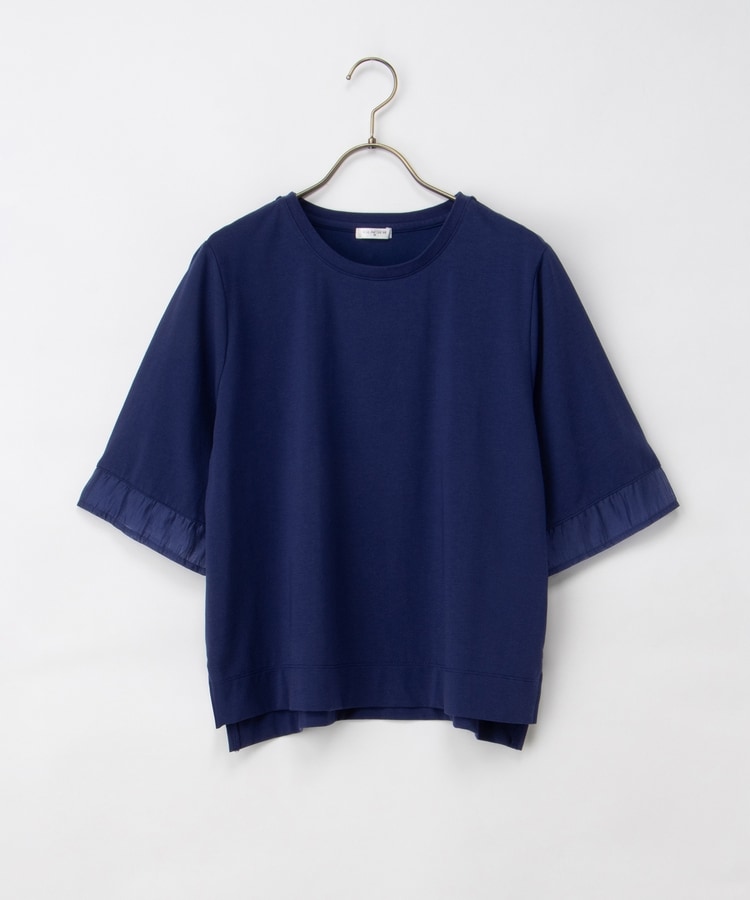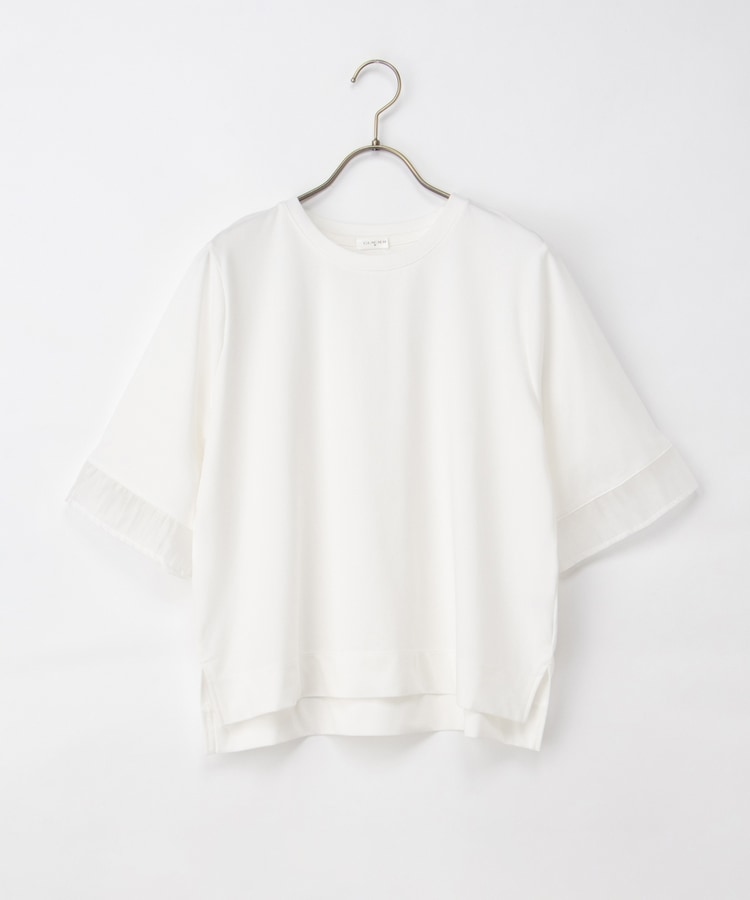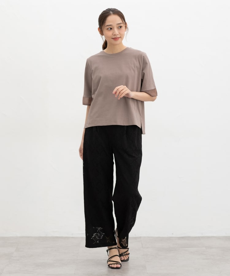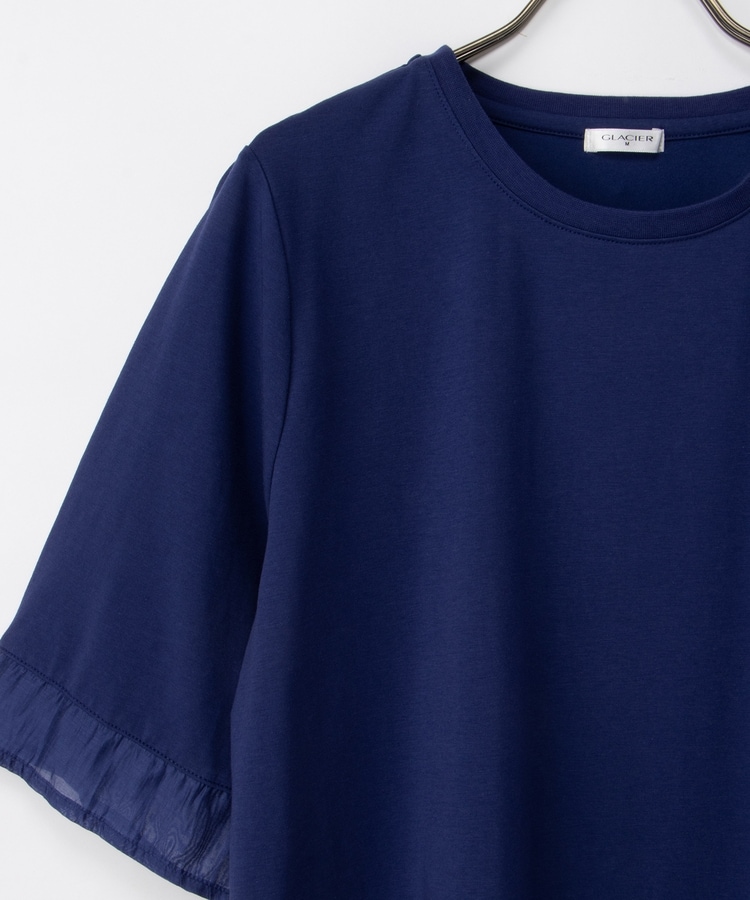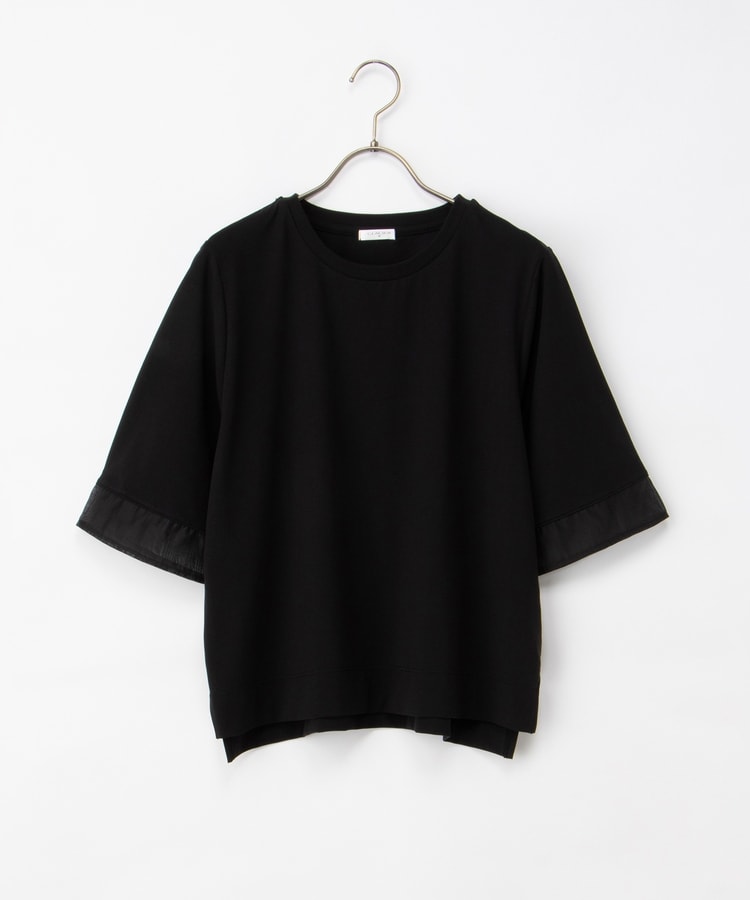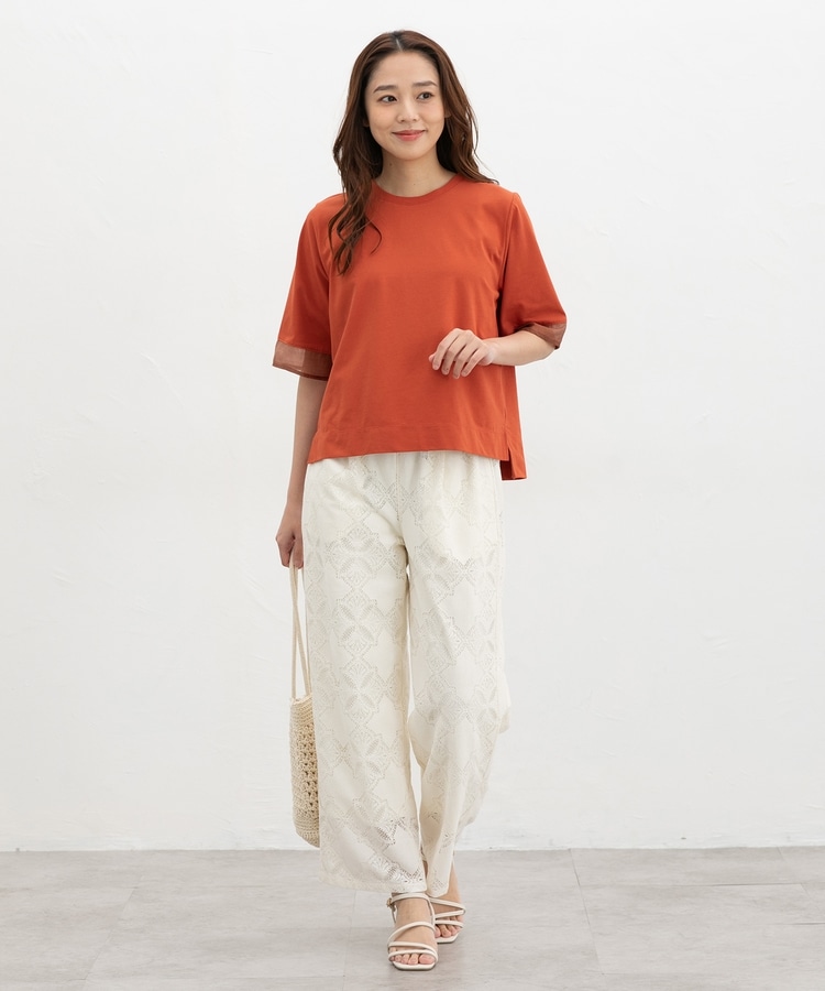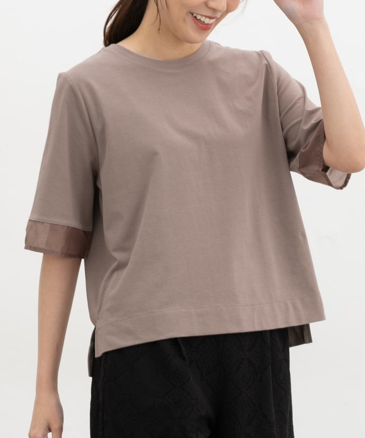 長めの袖の袖口を程よい透け感のシアー素材で切り替えた、二の腕を隠しながら清涼感もあるデザイン。