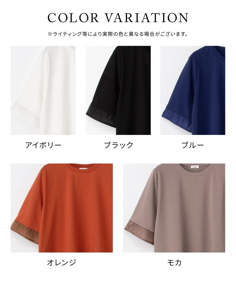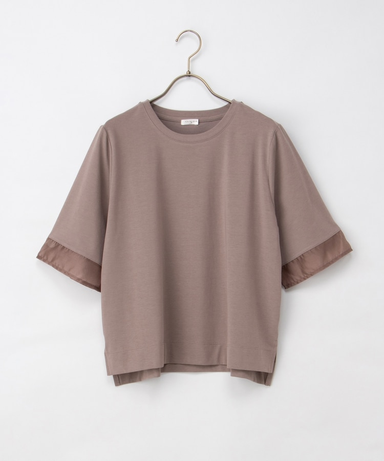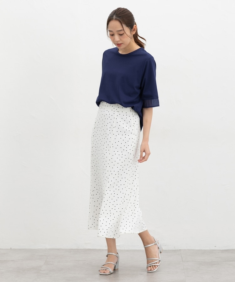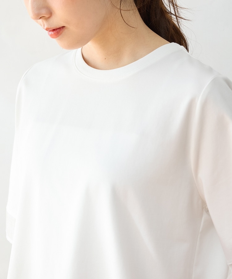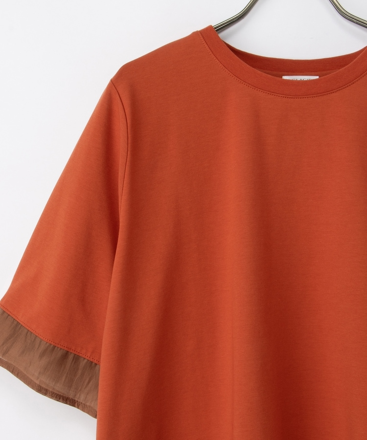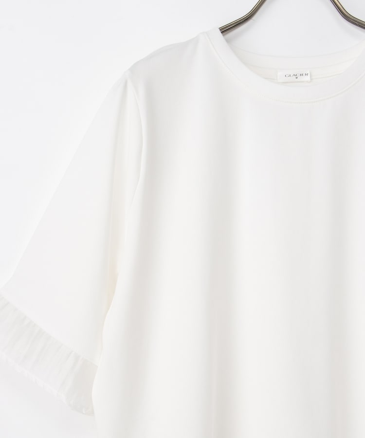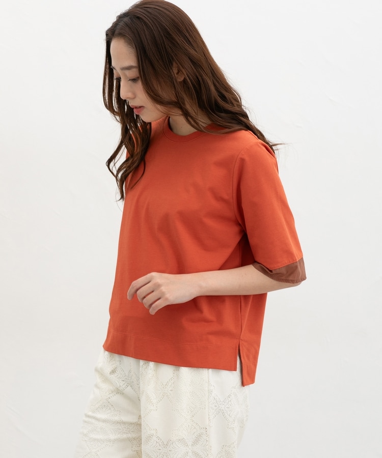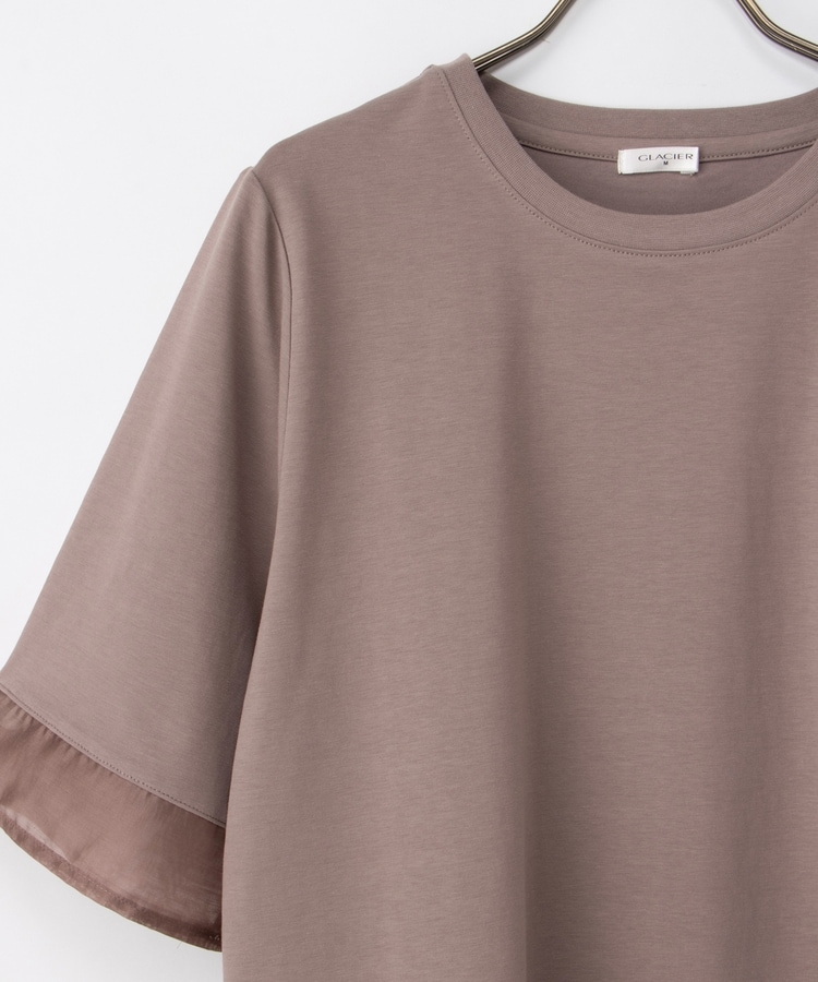 長めの袖の袖口を程よい透け感のシアー素材で切り替えた、二の腕を隠しながら清涼感もあるデザイン。