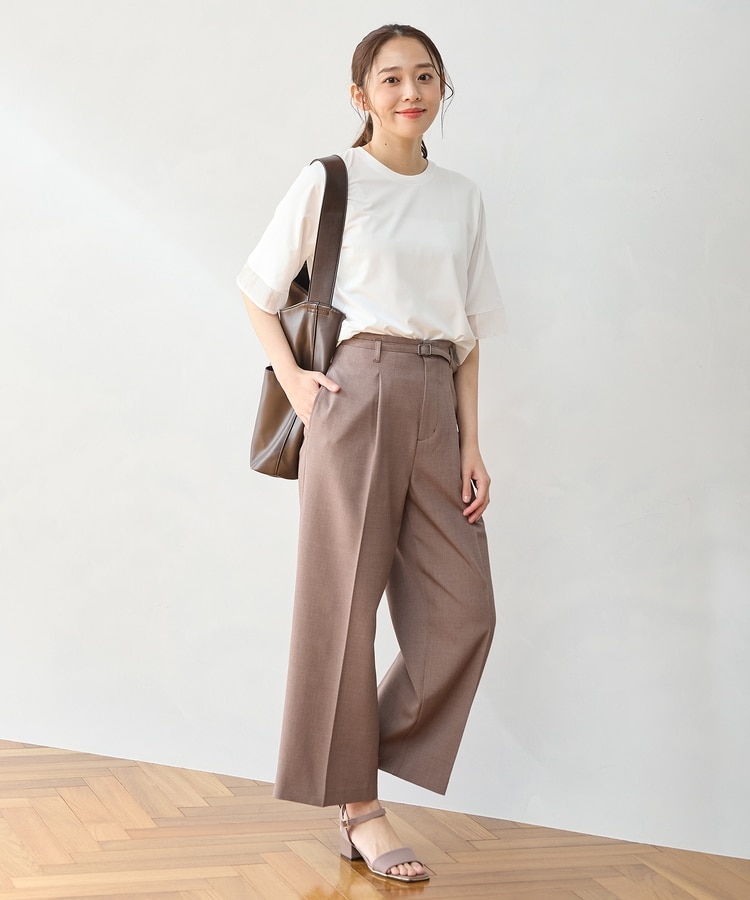 軽さのあるサイドスリット入りで、ゆったりめの幅とタックアウトでもサマになる長すぎない丈感。