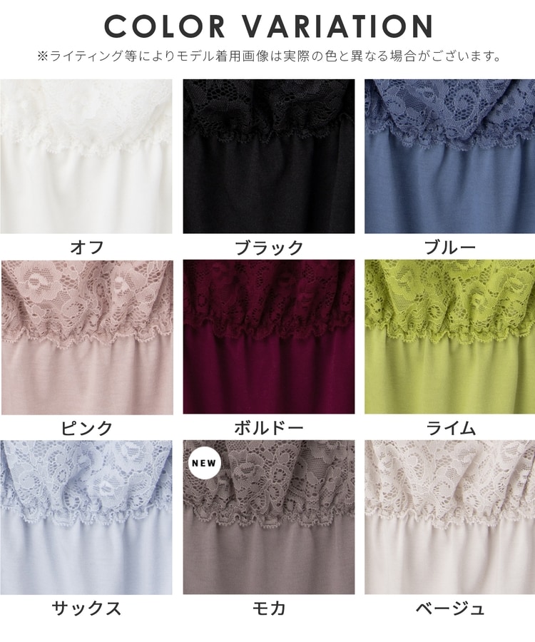 開きの広いトップスと合わせてレースを見せるのはもちろん、薄手のカーデやブラウスのインナーとしても、ロングシーズン毎日大活躍。