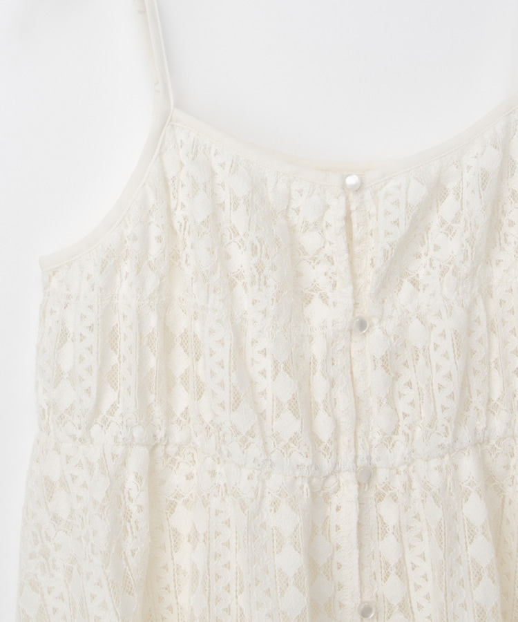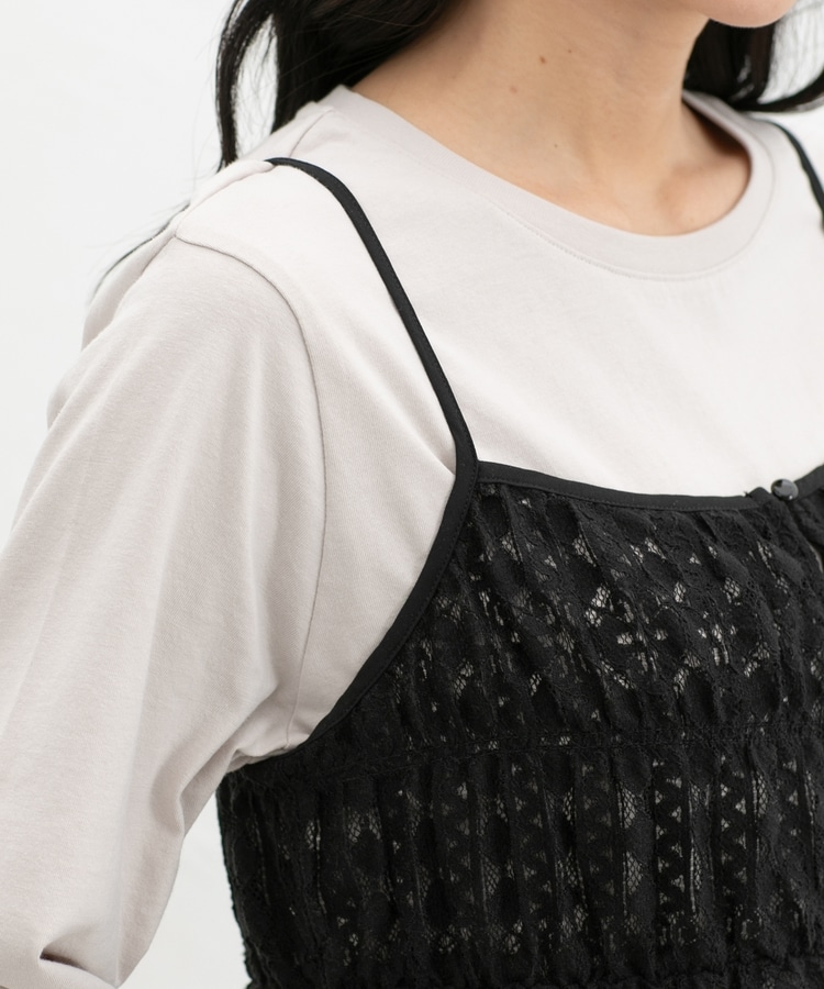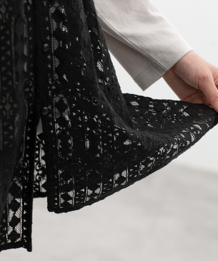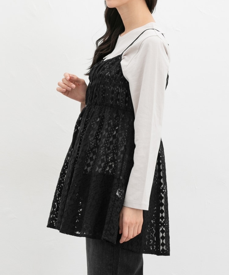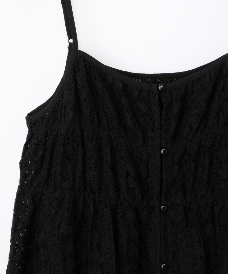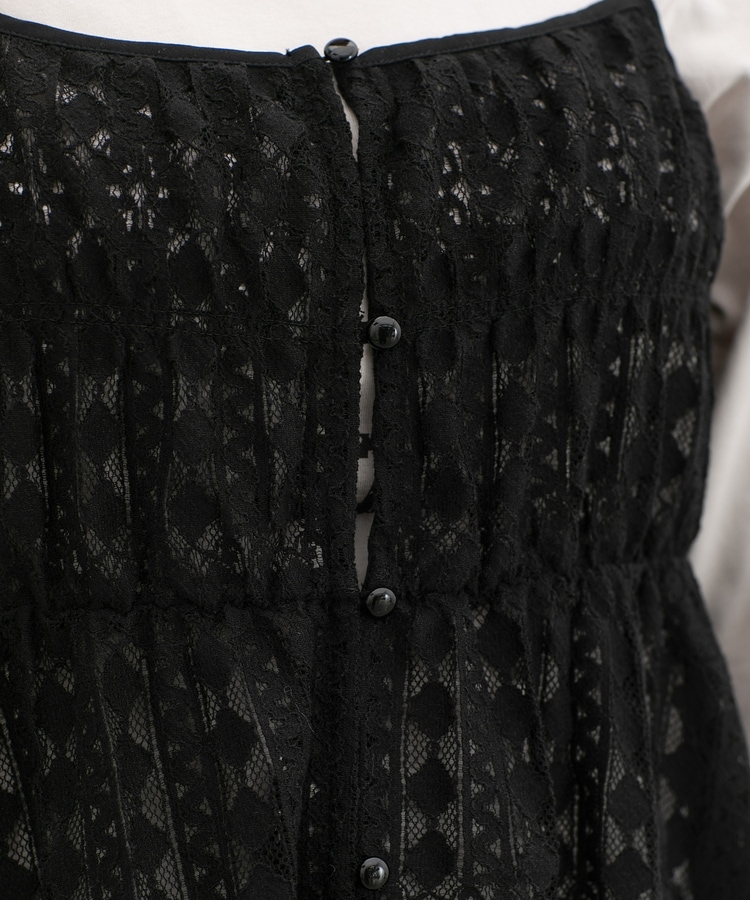 総レース×シャーリングの、華やかでフェミニンなデザイン。