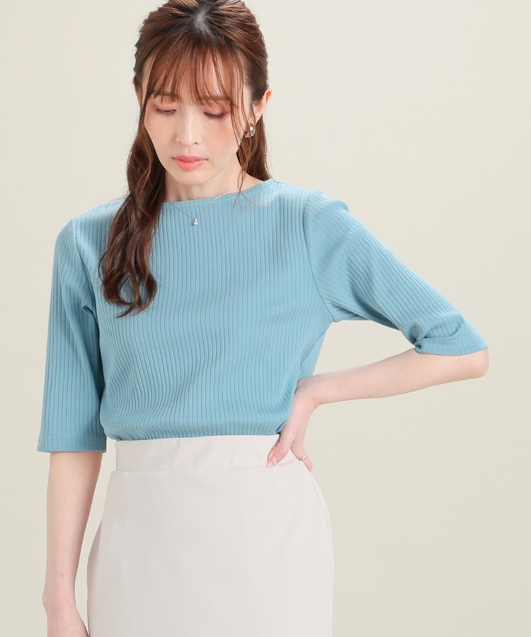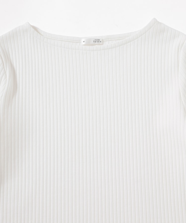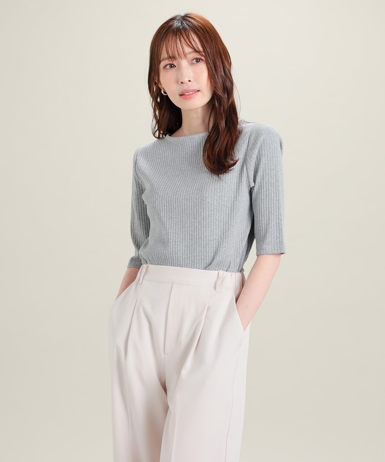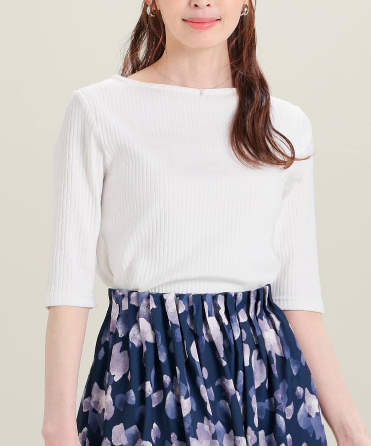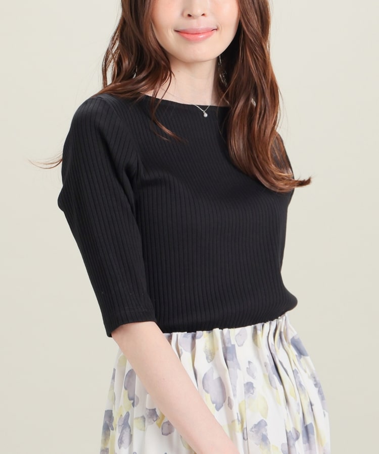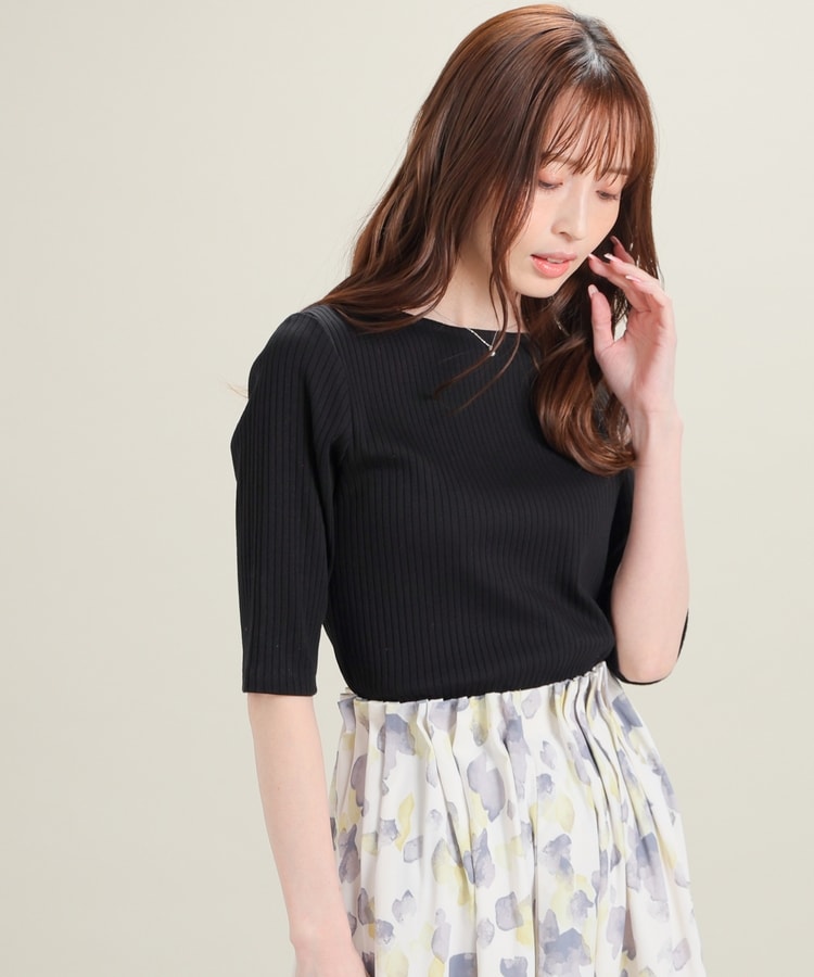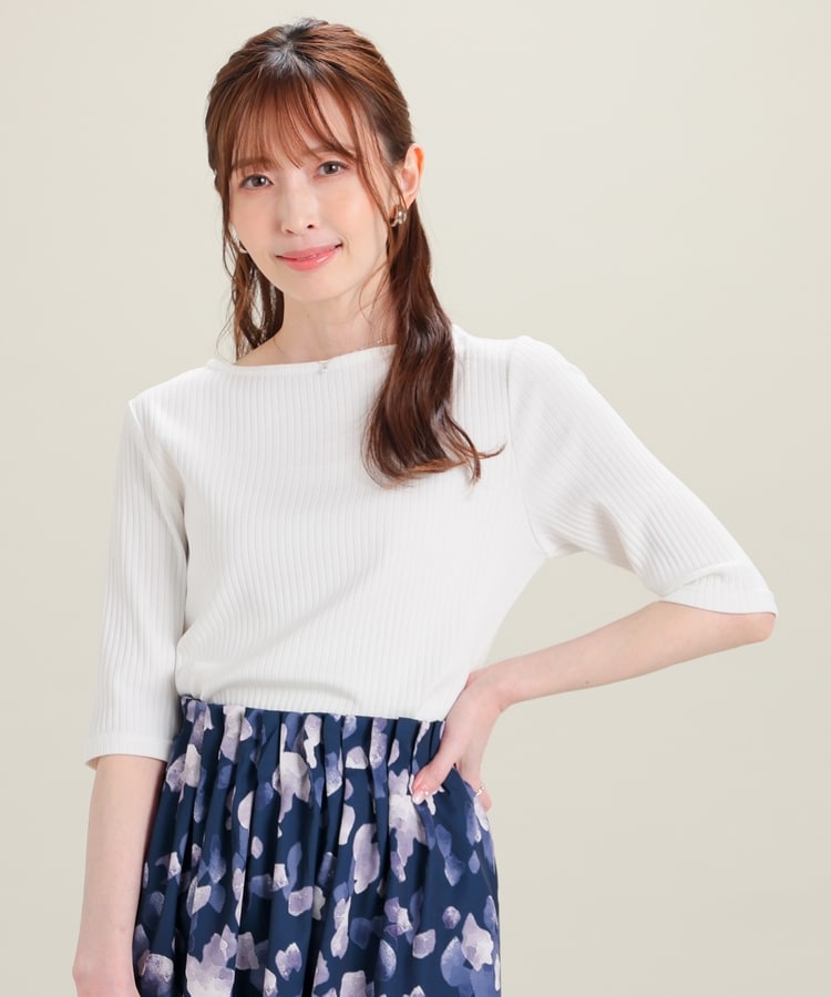 デコルテの露出を抑えたボートネックの、シンプルで上品なデザイン。