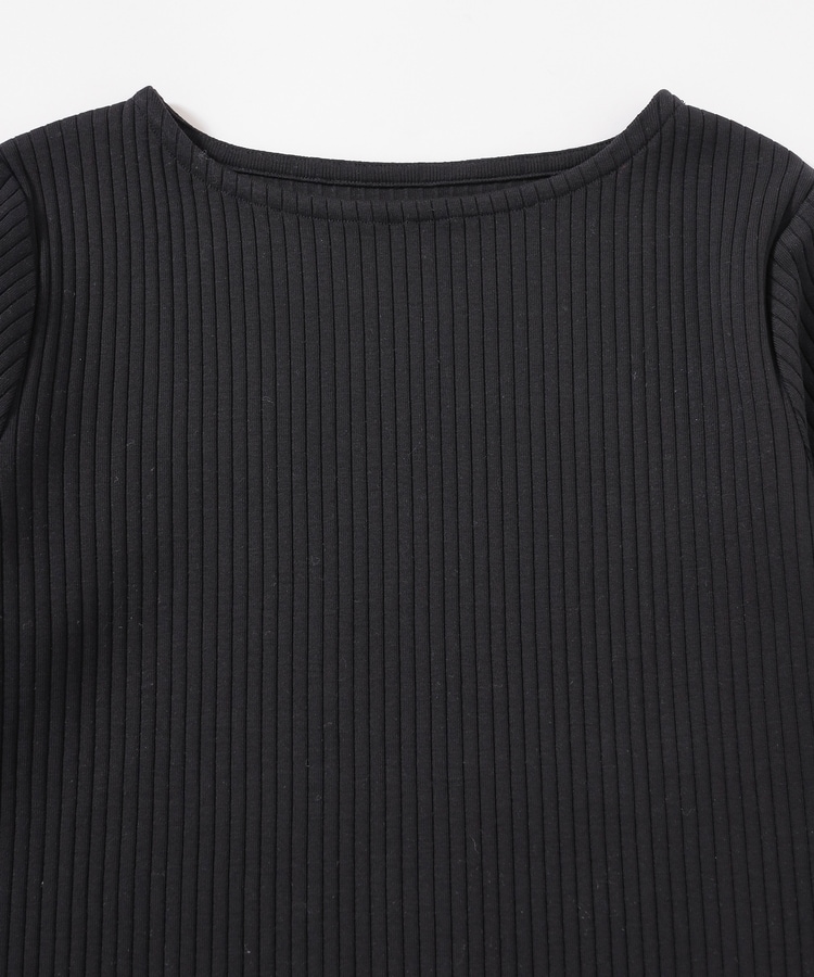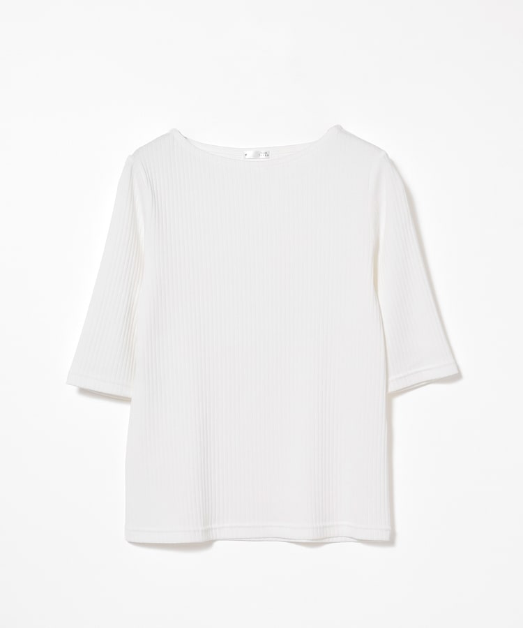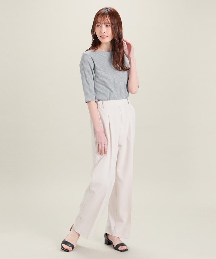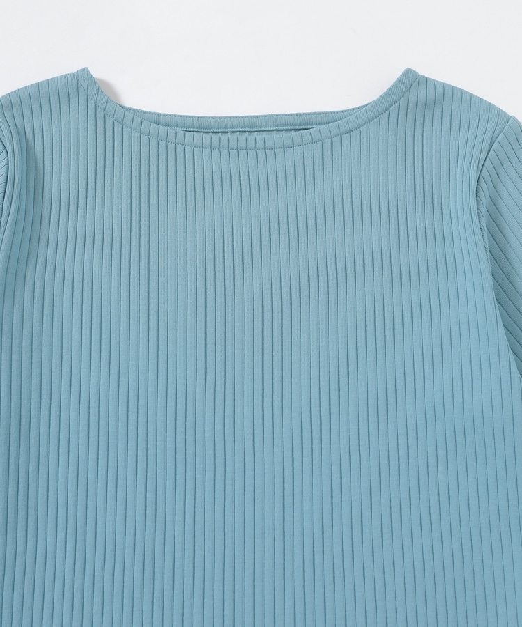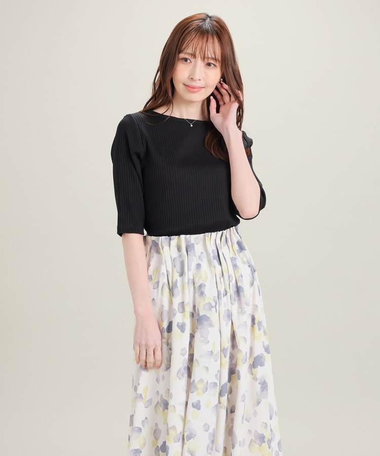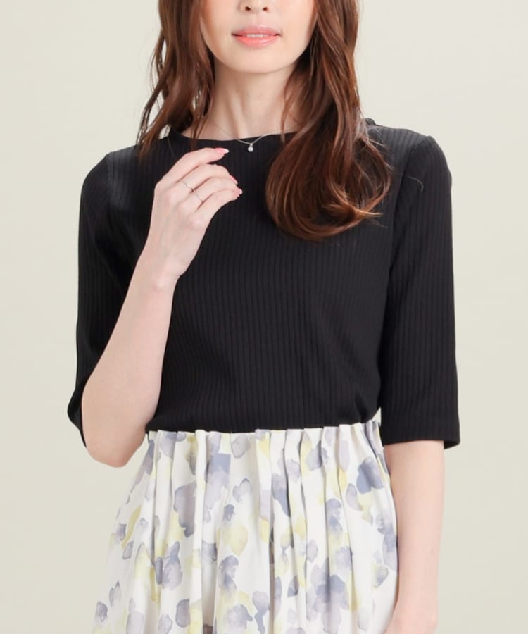 デコルテの露出を抑えたボートネックの、シンプルで上品なデザイン。