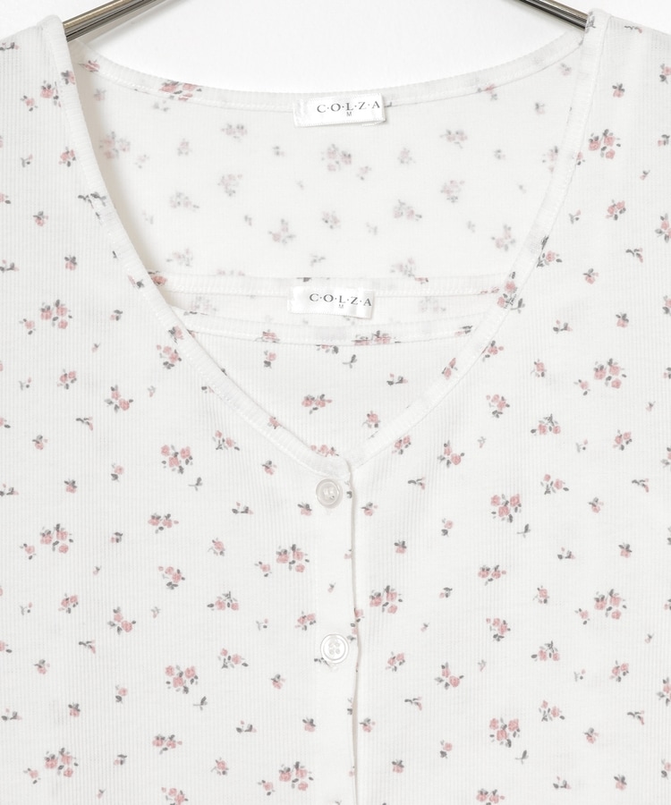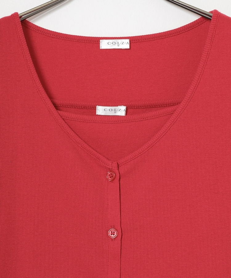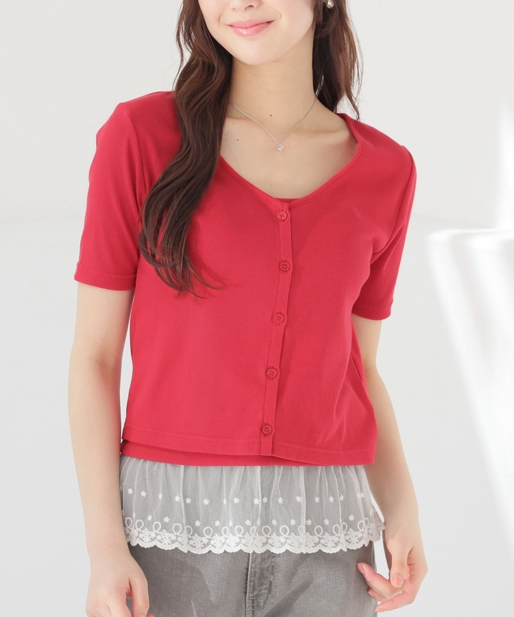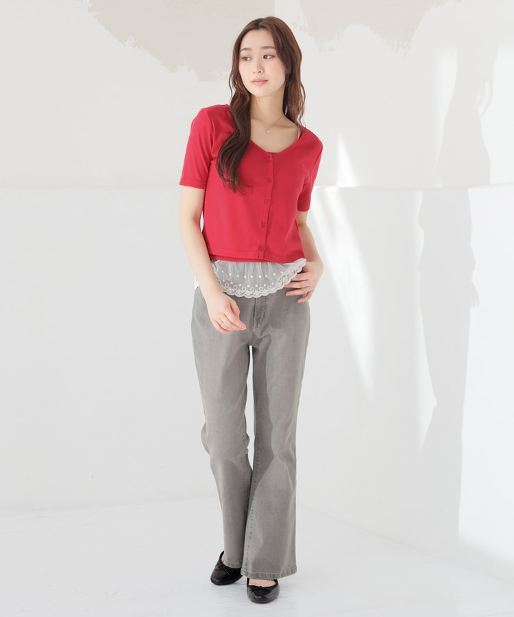 カーディガンは首元がすっきり見えるVネックで、すっきり幅×短め丈のコンパクトシルエット。