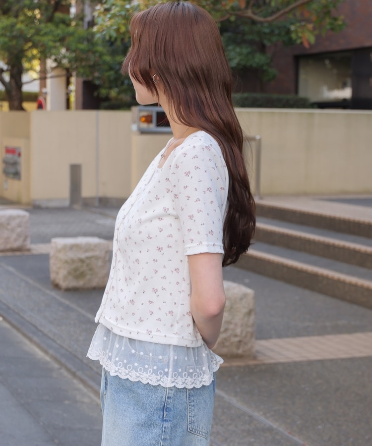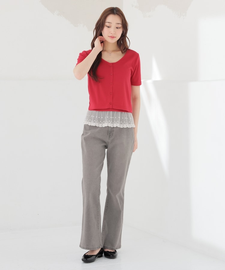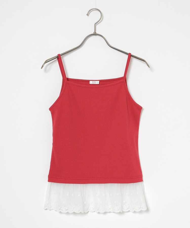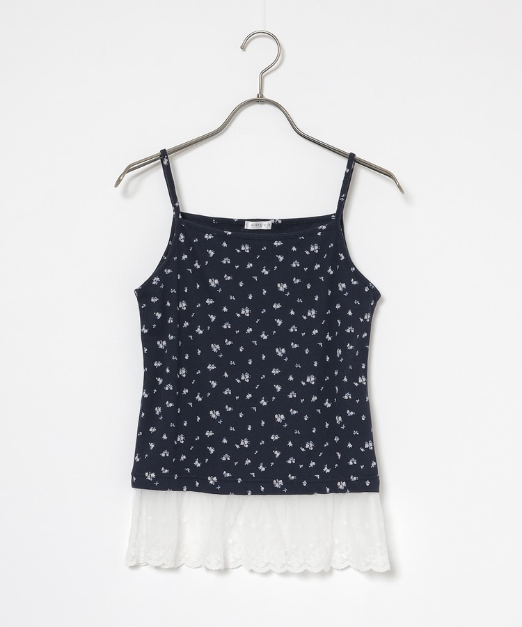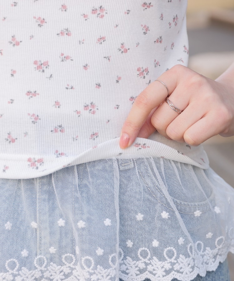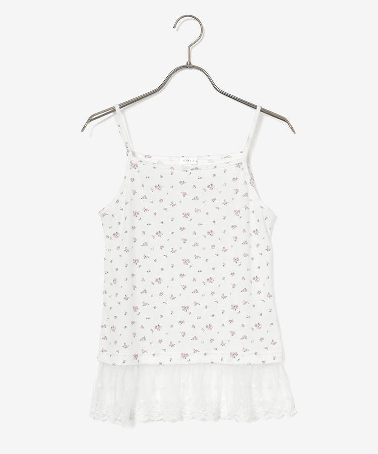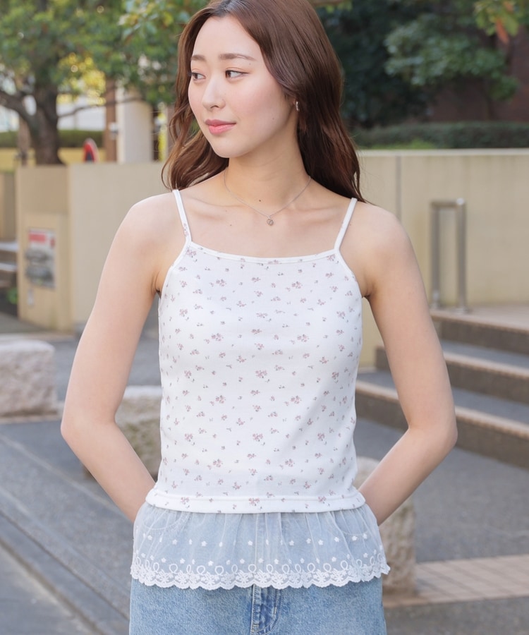 同素材のキャミソールはフェミニンなレースの裾フリル付き。
