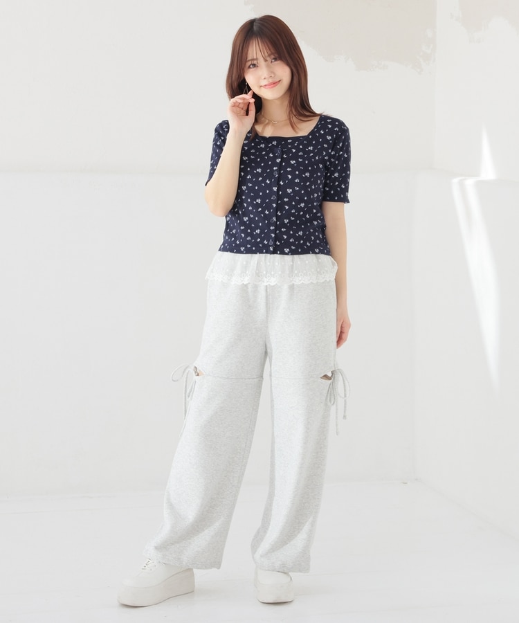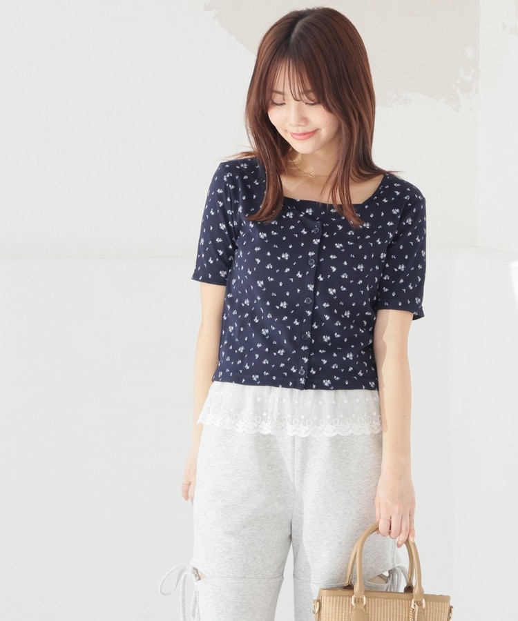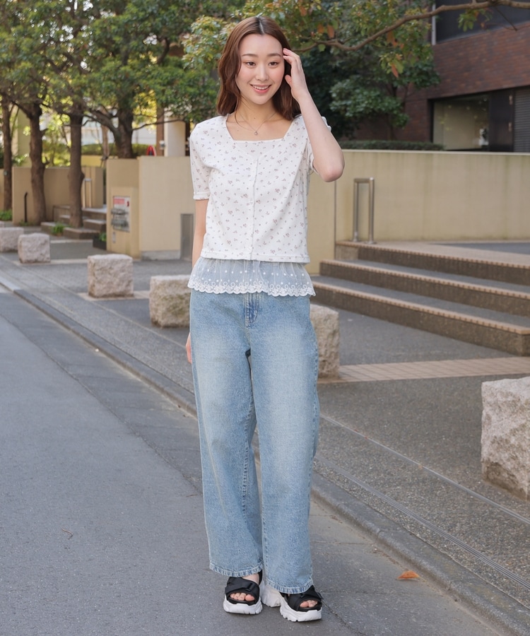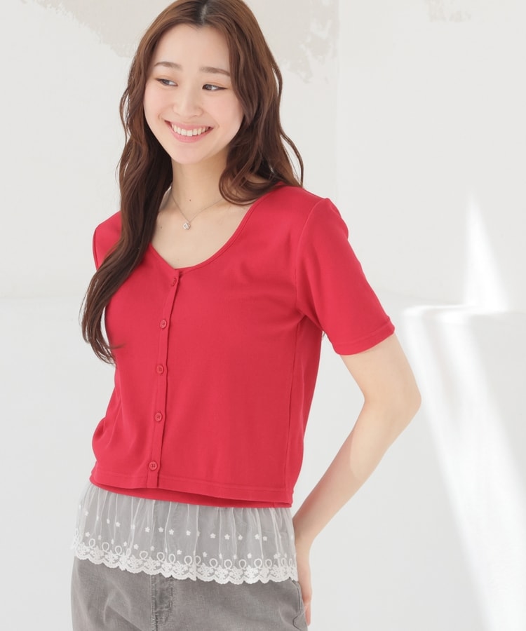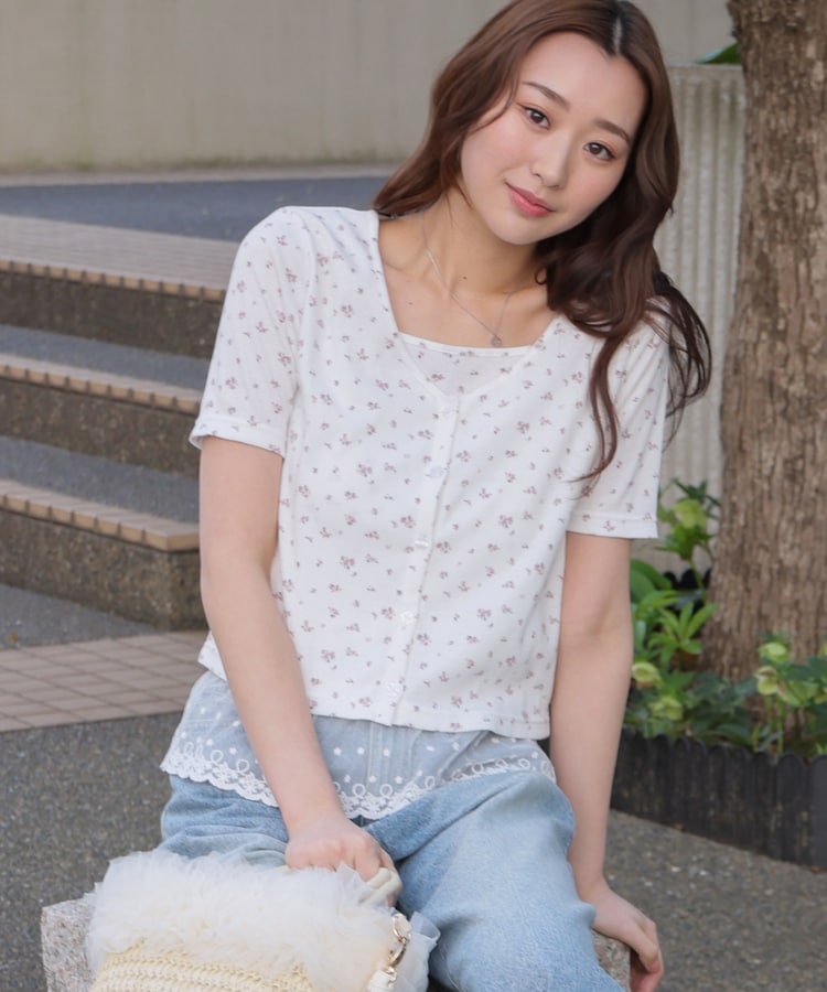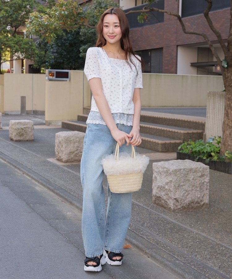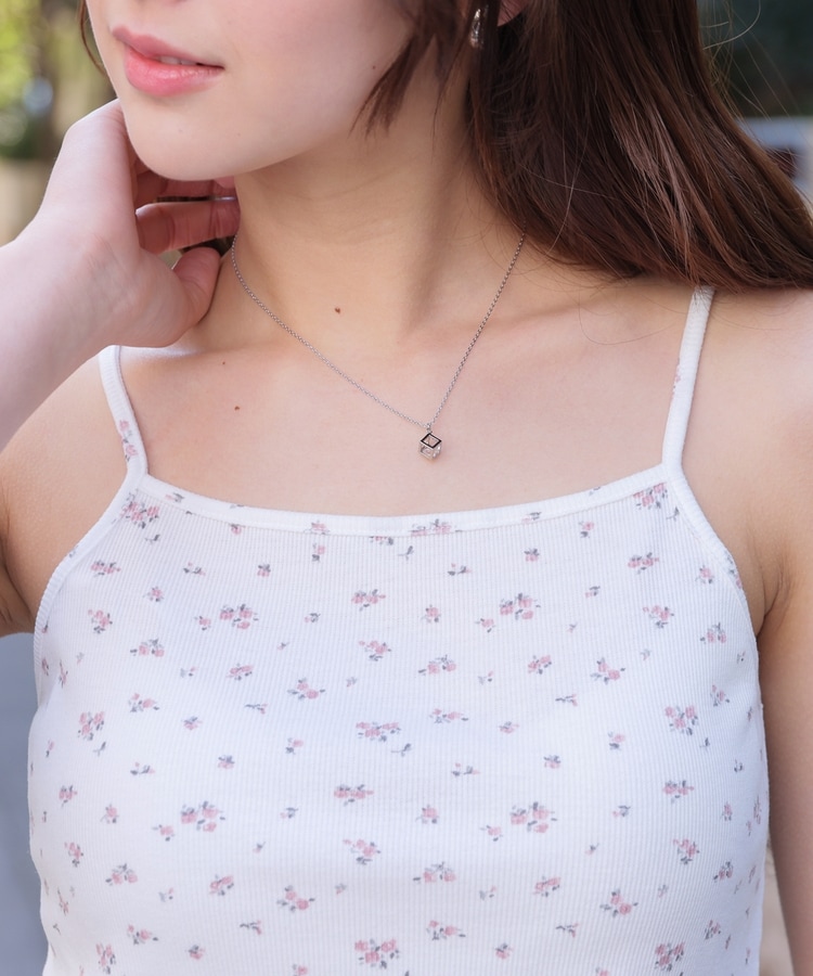 同素材のキャミソールはフェミニンなレースの裾フリル付き。