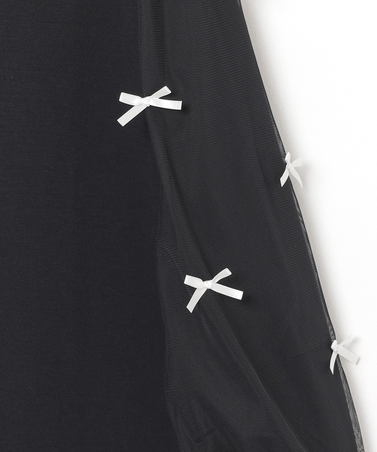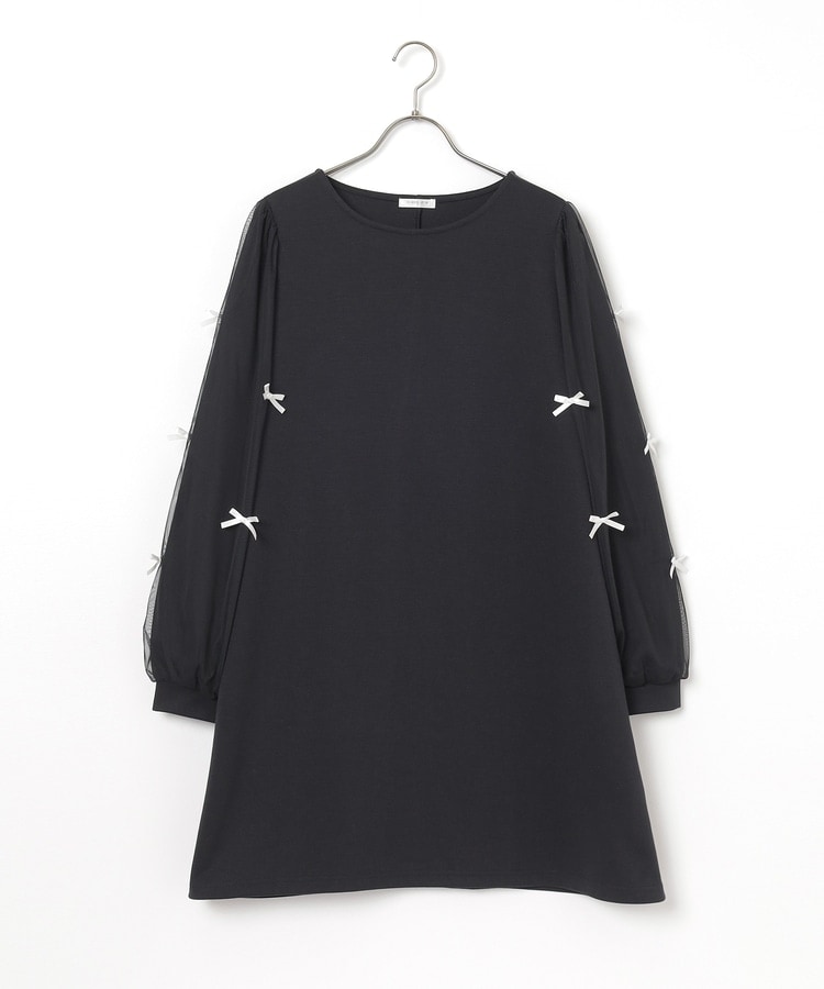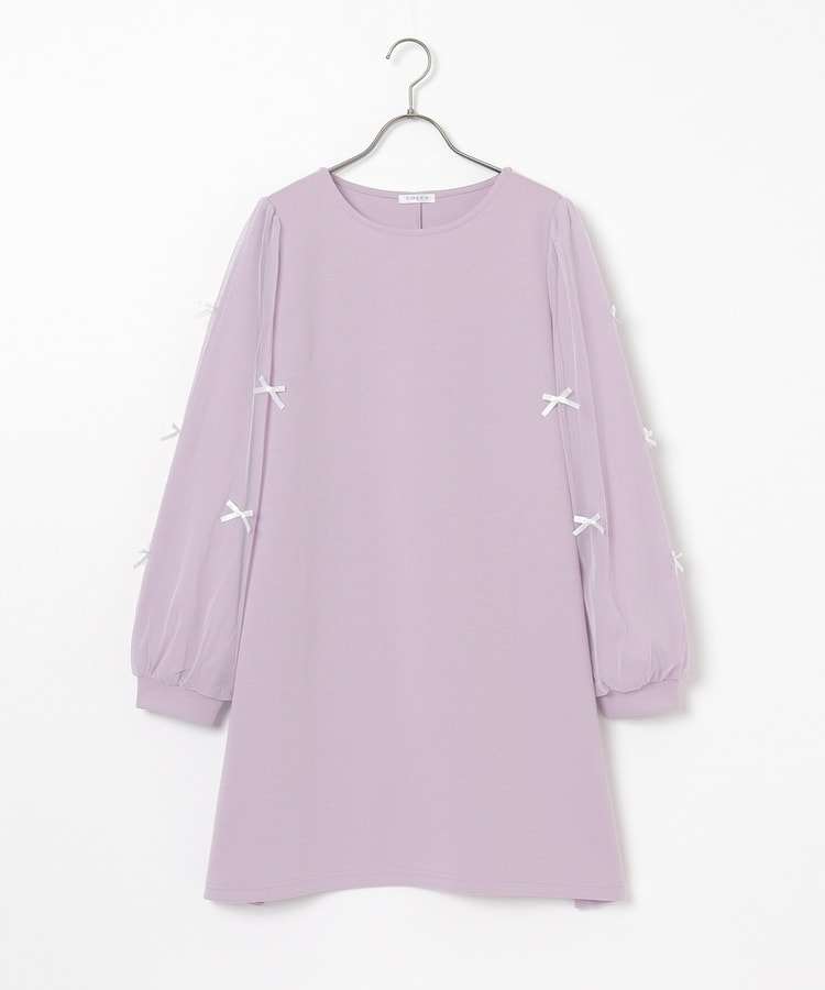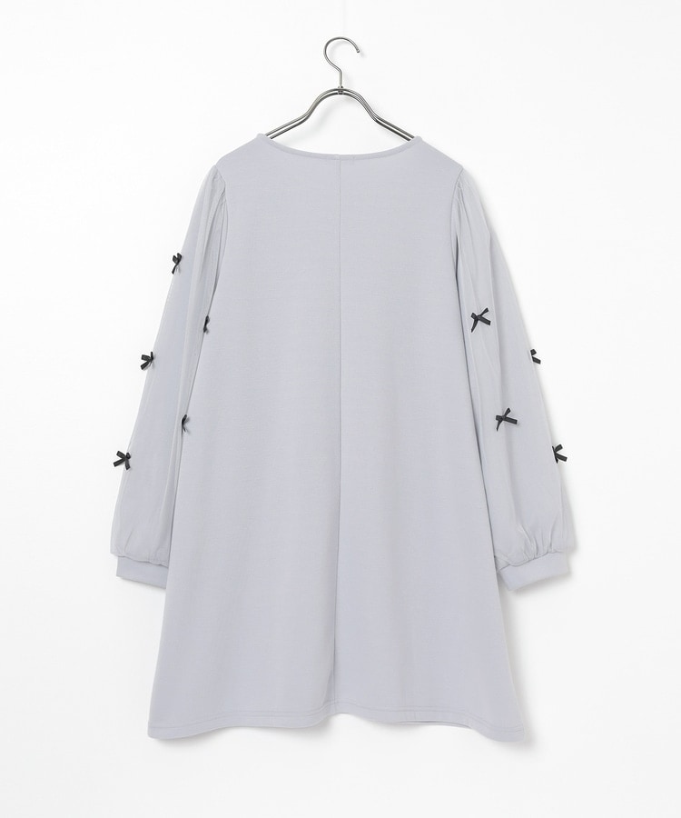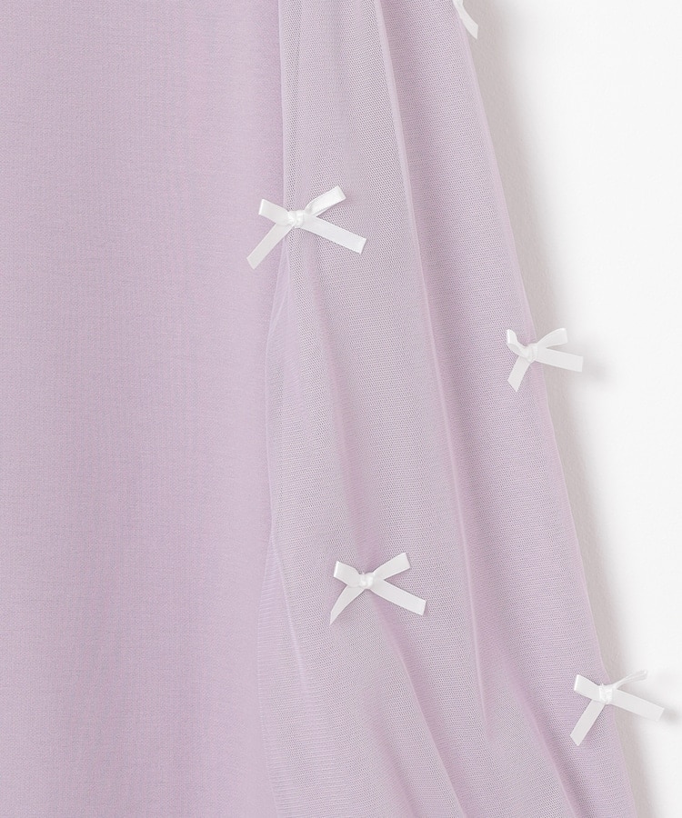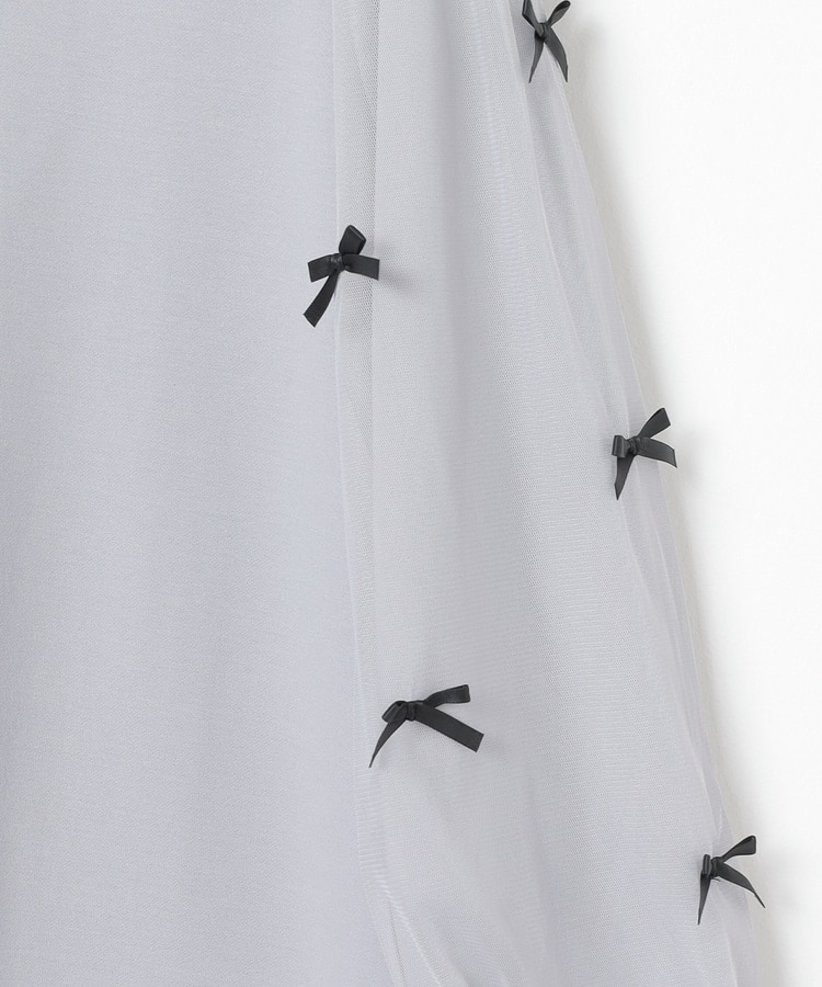 チュールを重ねたふんわり袖に、モチーフリボンをちりばめたキュートなデザイン。