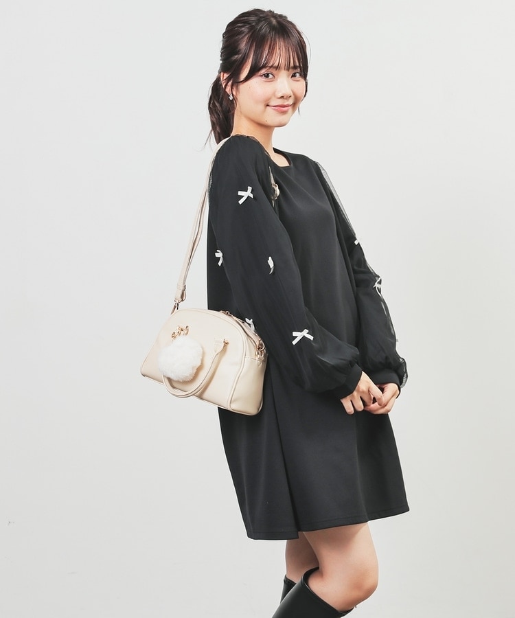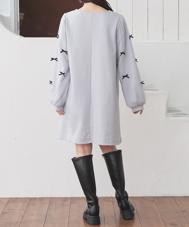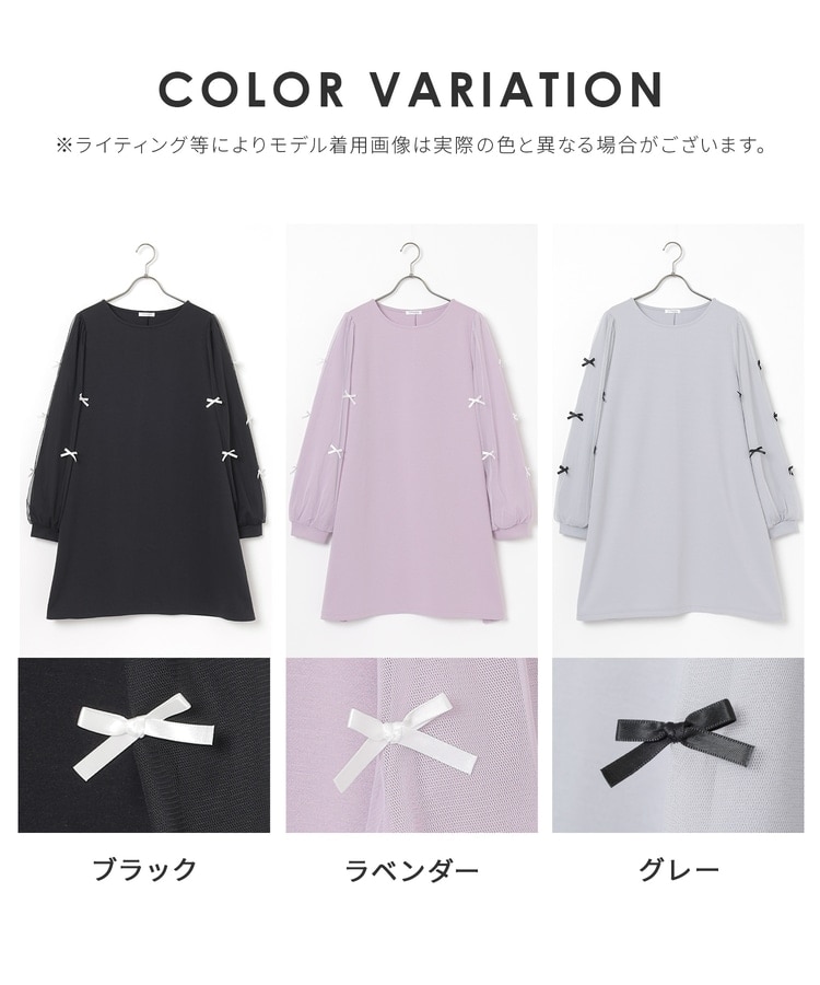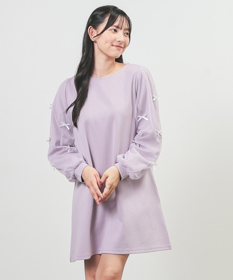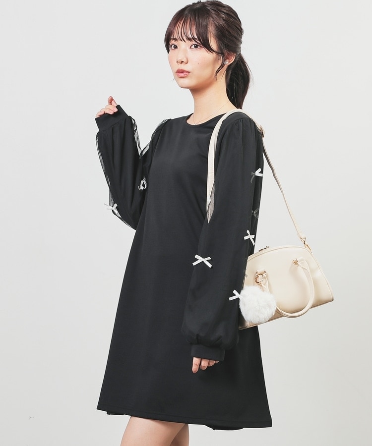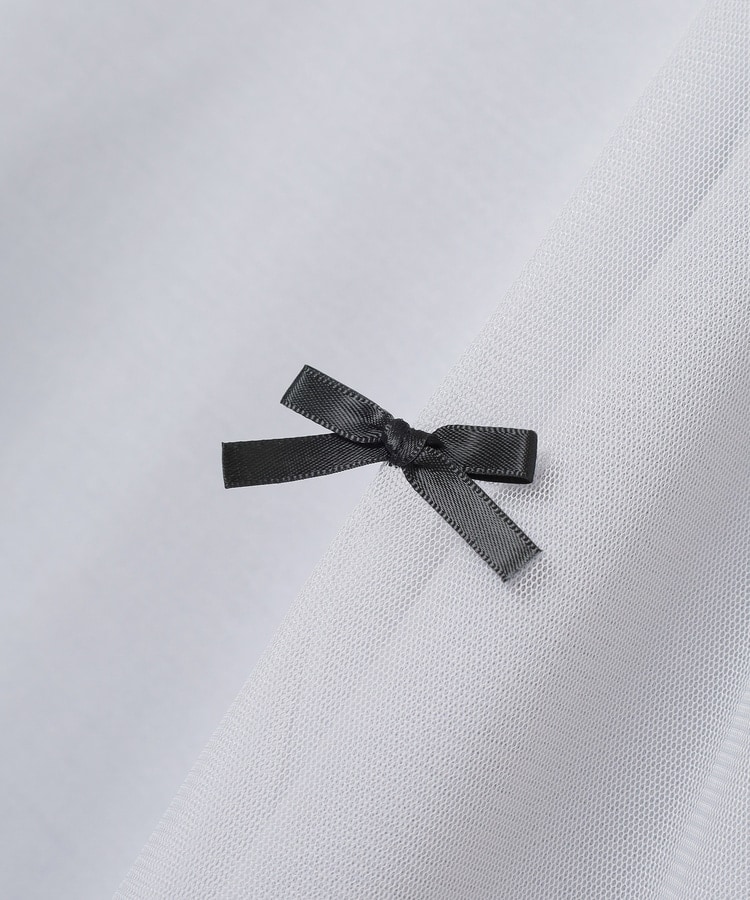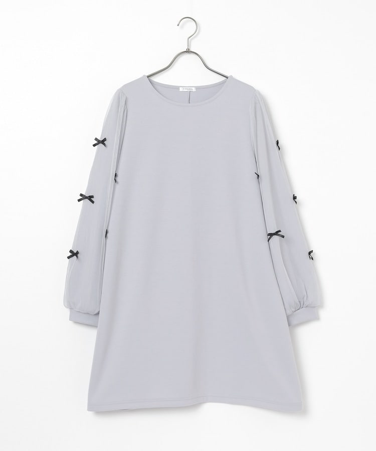 チュールを重ねたふんわり袖に、モチーフリボンをちりばめたキュートなデザイン。