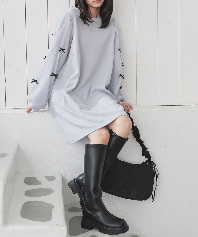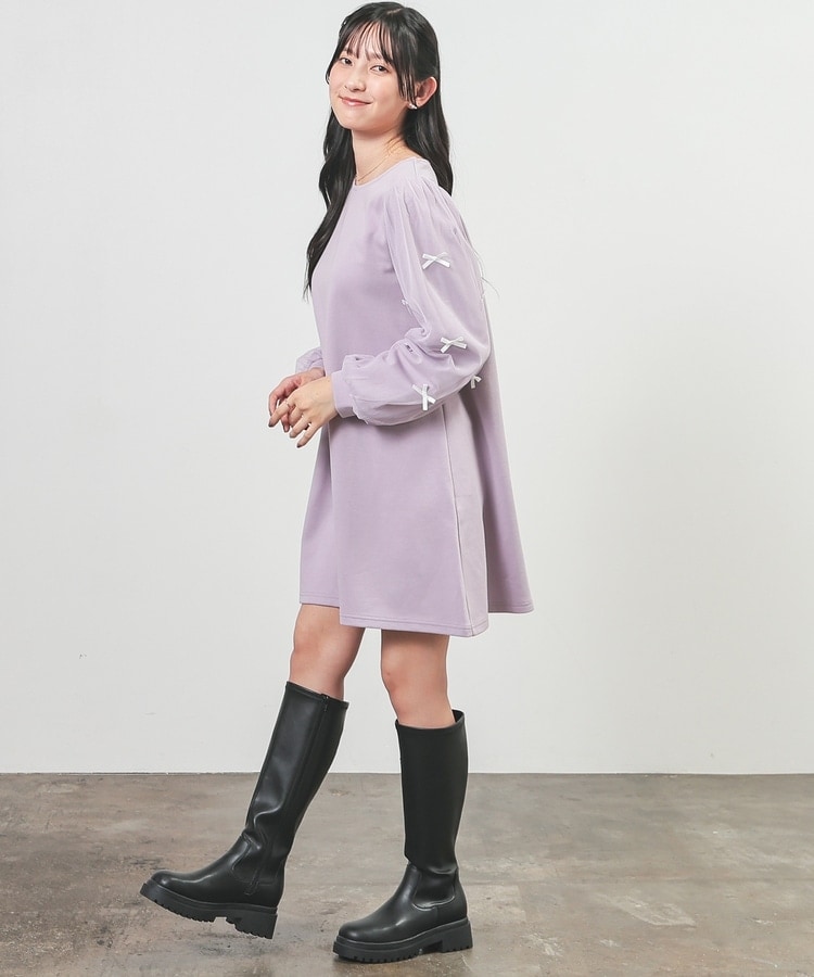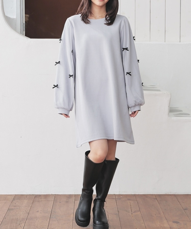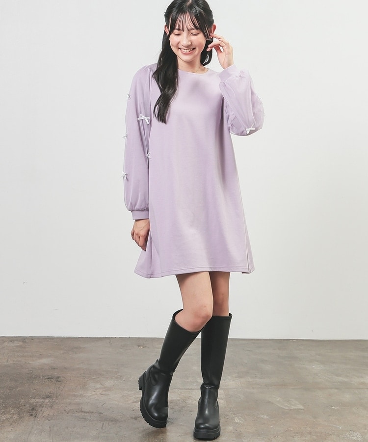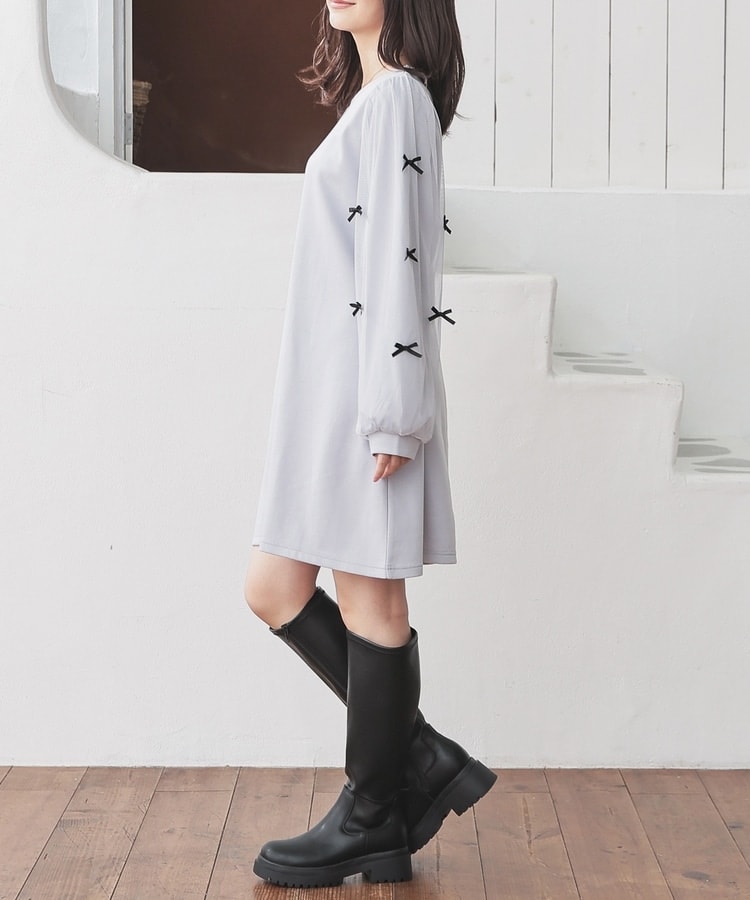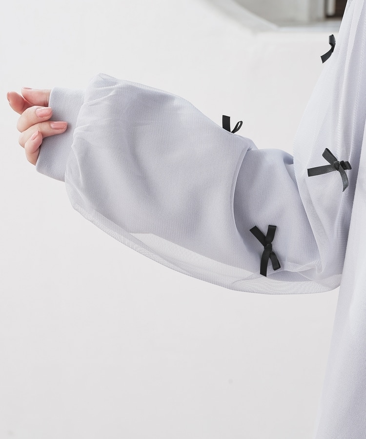 チュールを重ねたふんわり袖に、モチーフリボンをちりばめたキュートなデザイン。