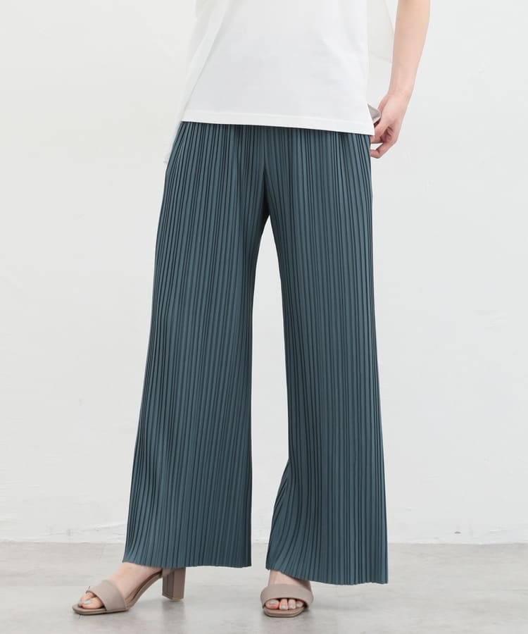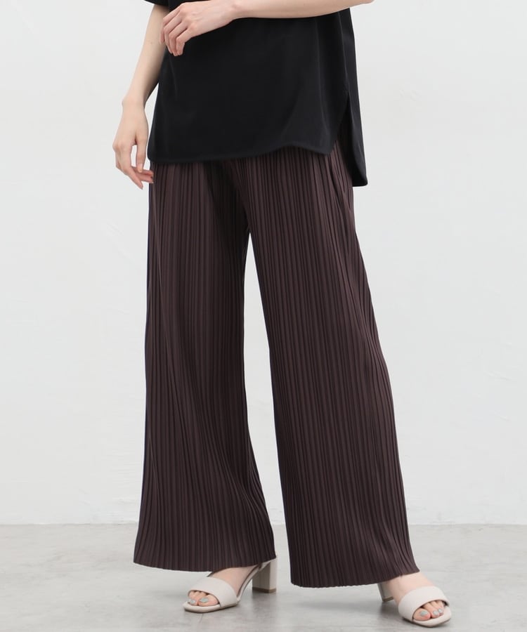 プリーツの縦ラインとストレートなシルエットで、レッグラインを拾わず美脚効果抜群のデザイン。
