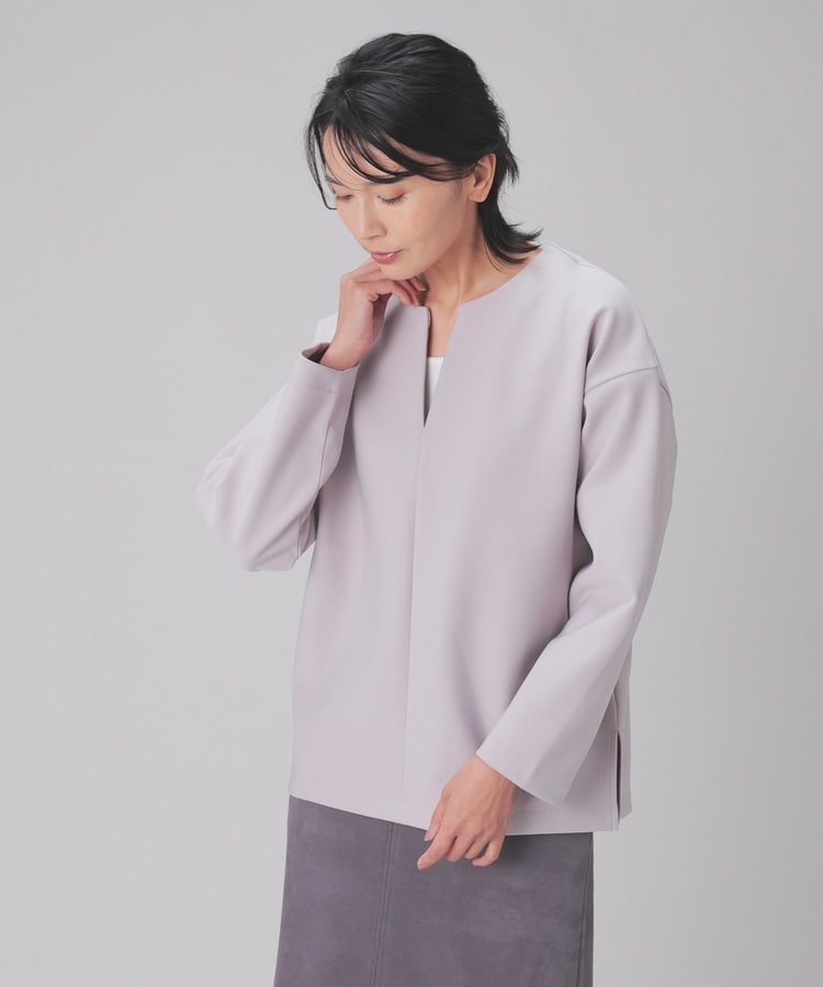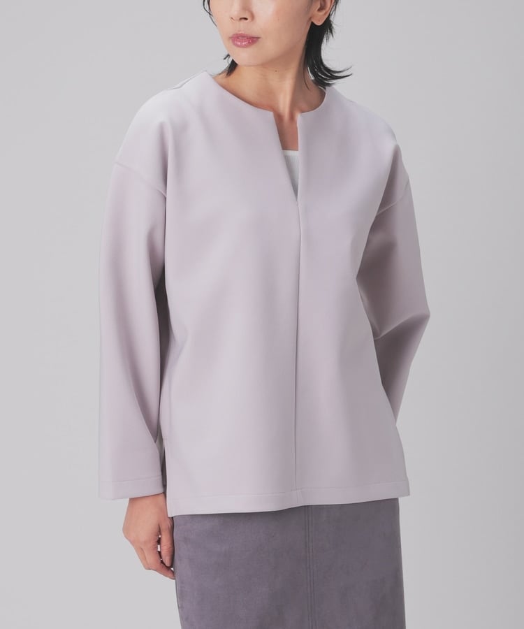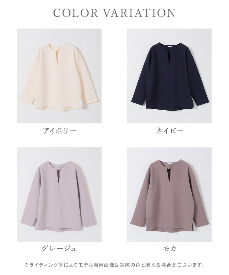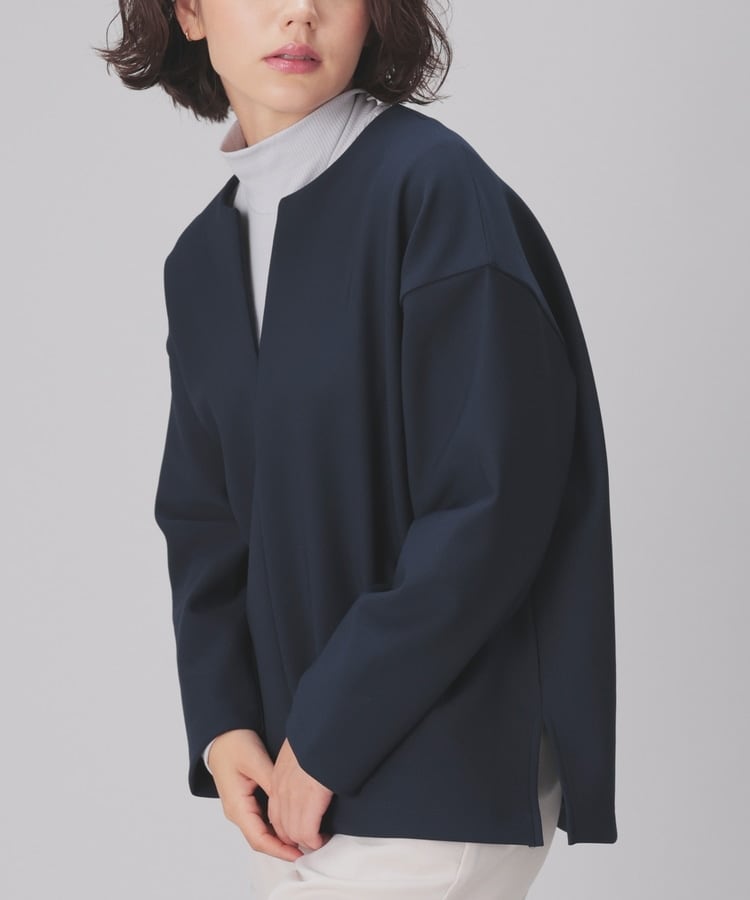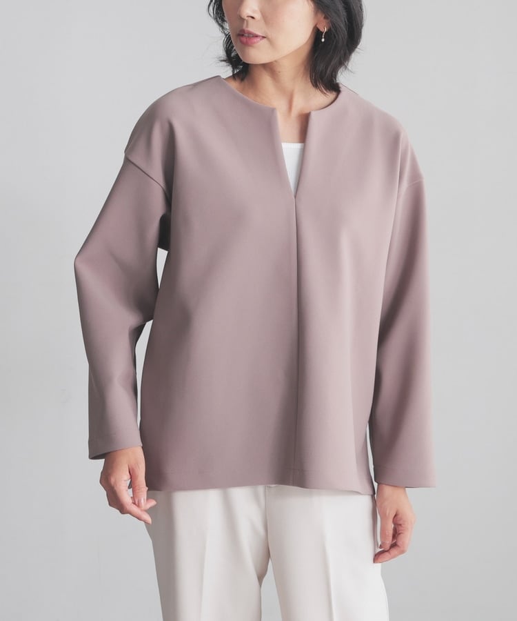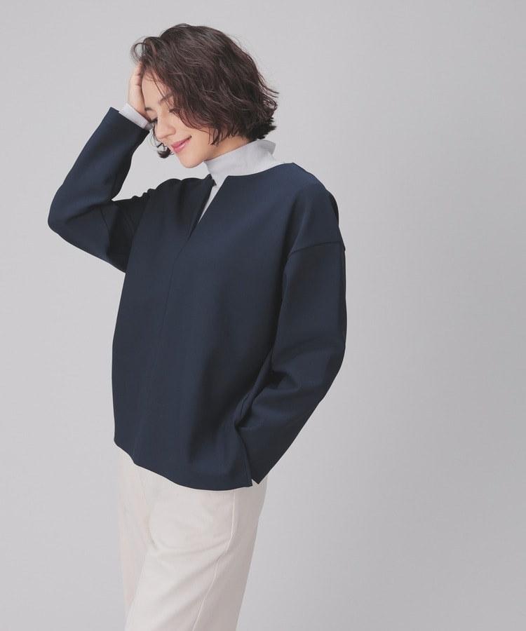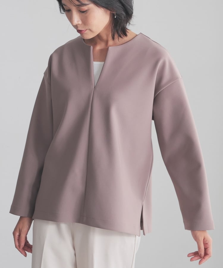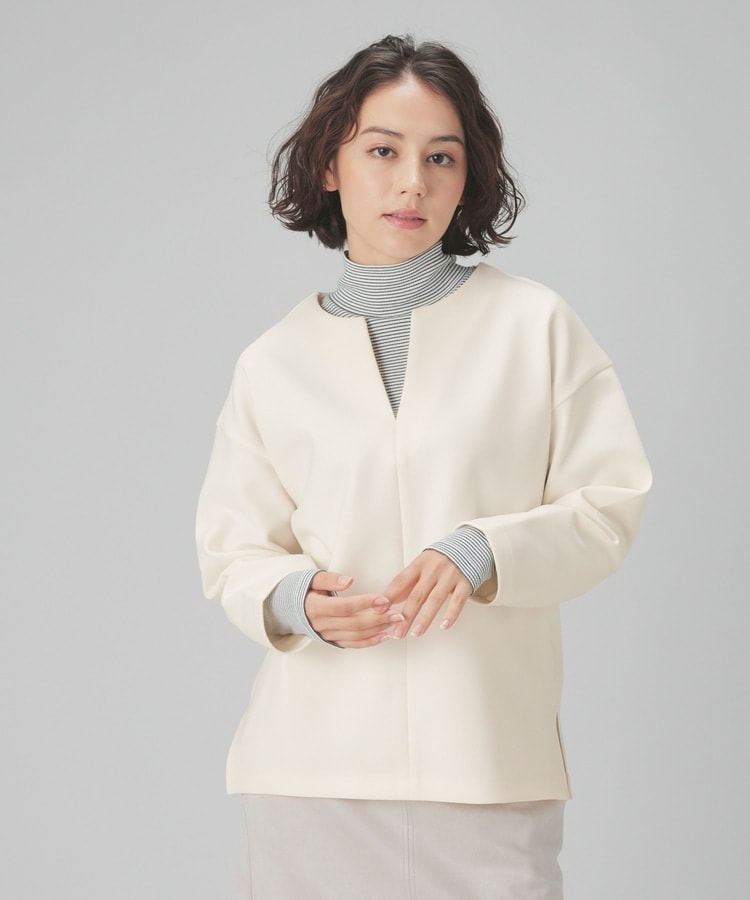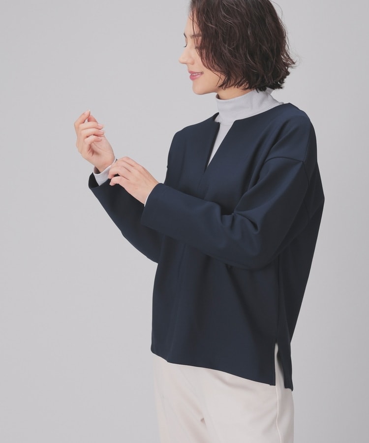 インナー次第でさまざまな着こなしを楽しめるキーネック。