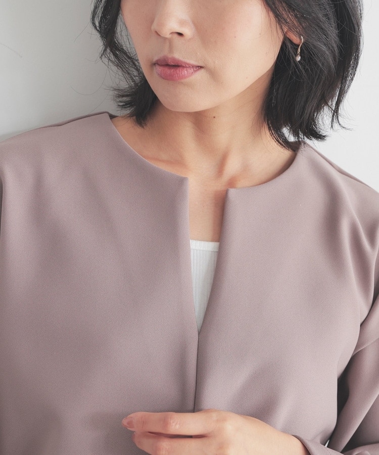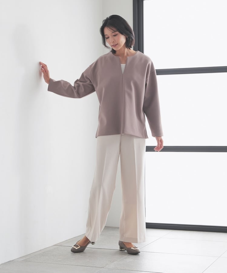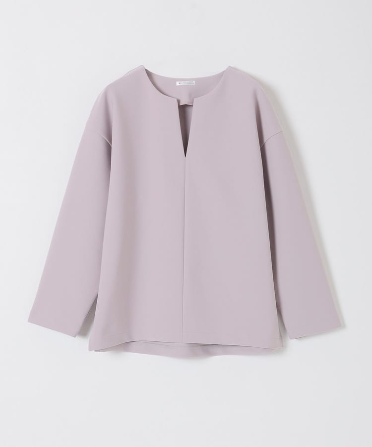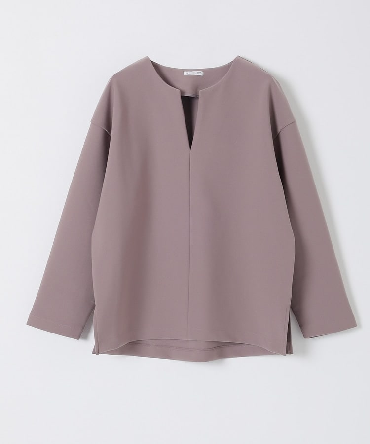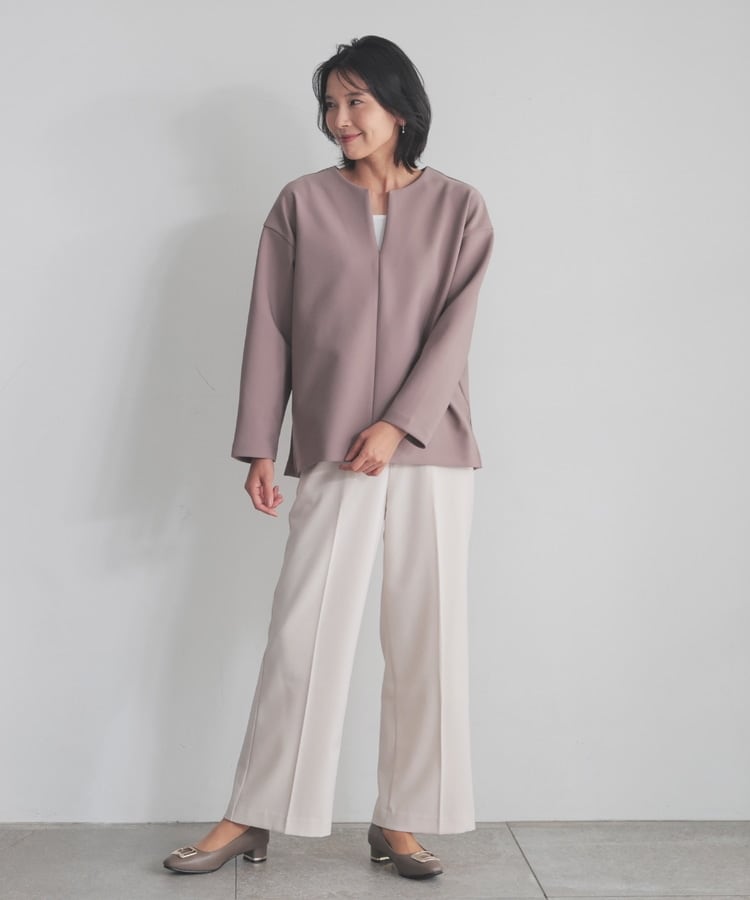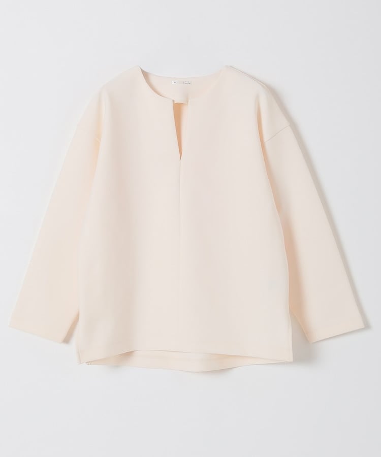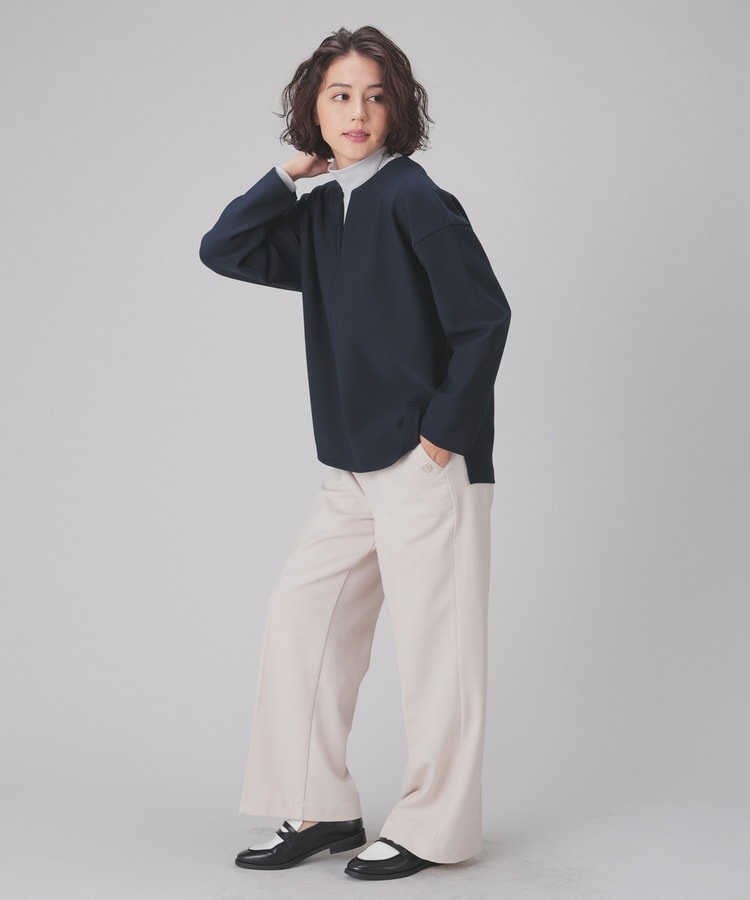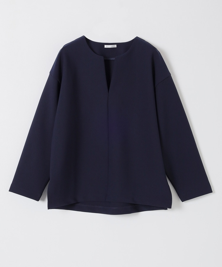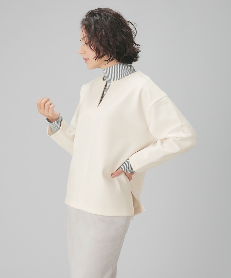 インナー次第でさまざまな着こなしを楽しめるキーネック。
