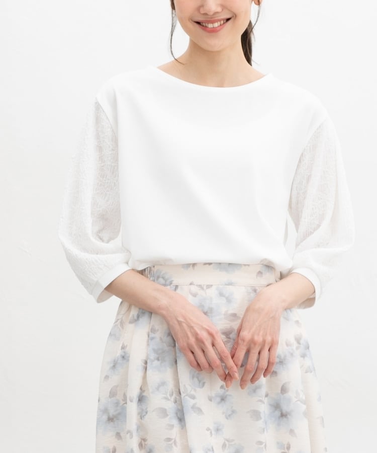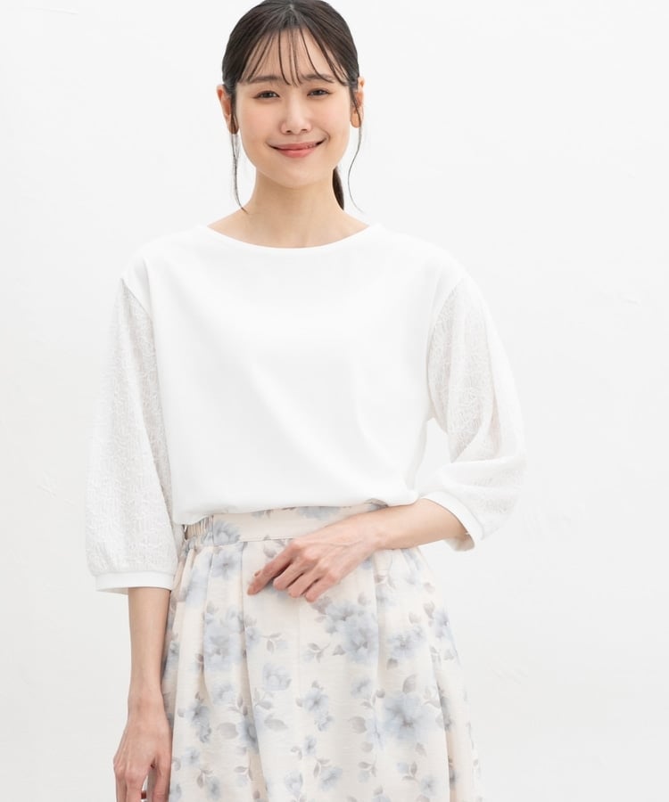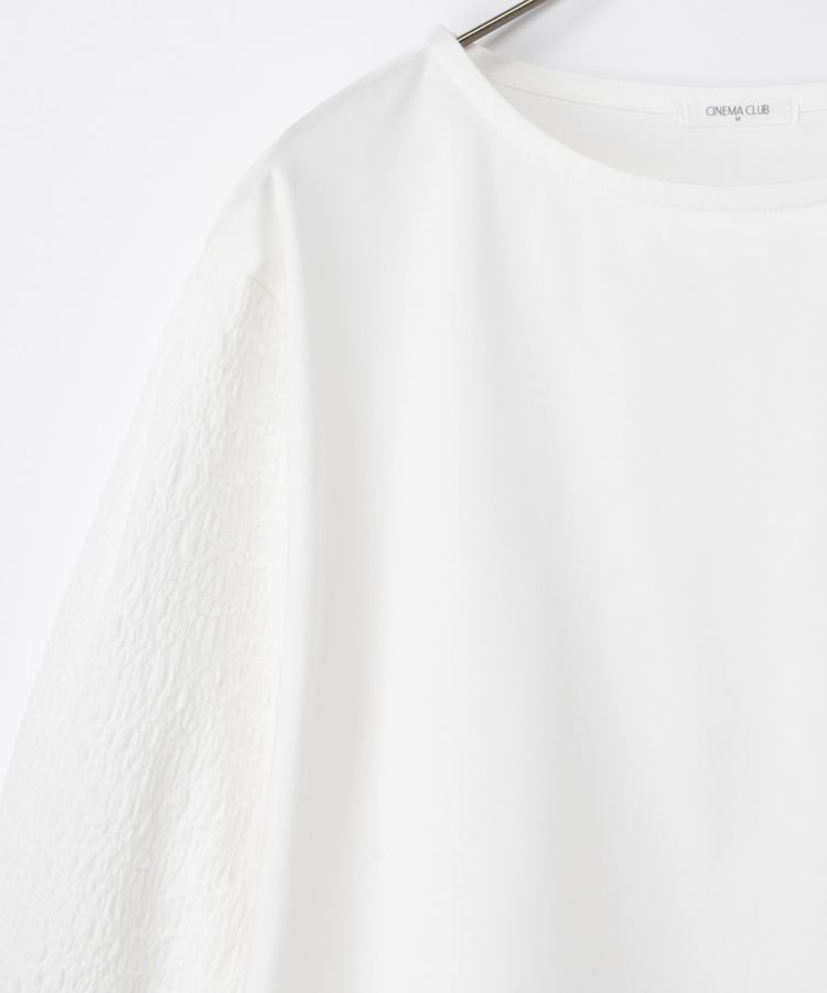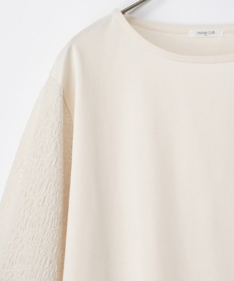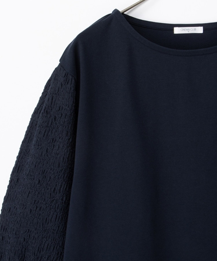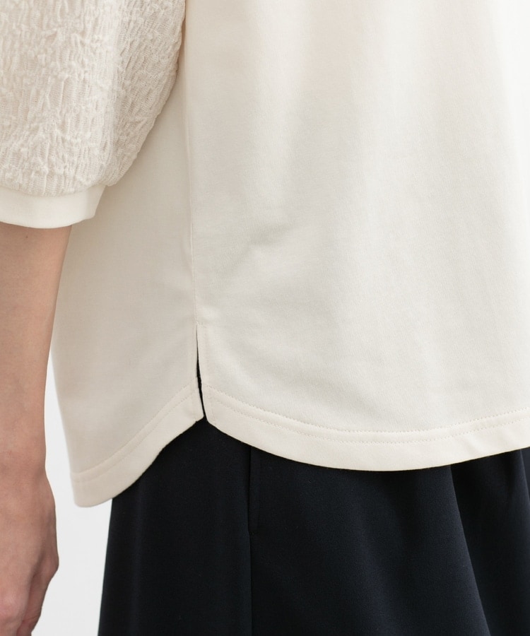 袖は、ストレッチの利いた、凹凸感のあるレーシーなジャカード素材。