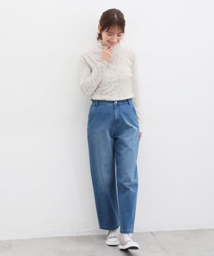 首元をカバーするプチハイネックに、メロー使いがさりげないアクセント。