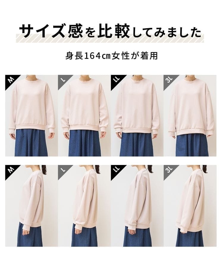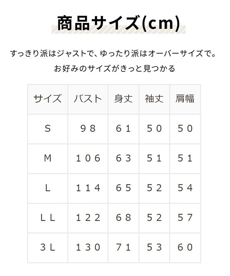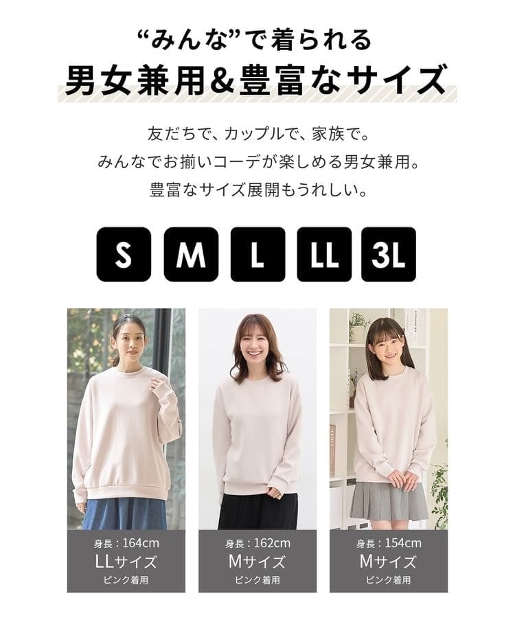 ユニセックス対応で、カップルや家族でお揃いコーデが楽しめる、S〜3Lのサイズ展開。