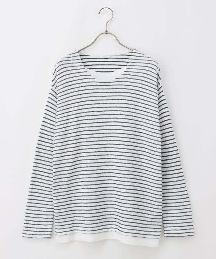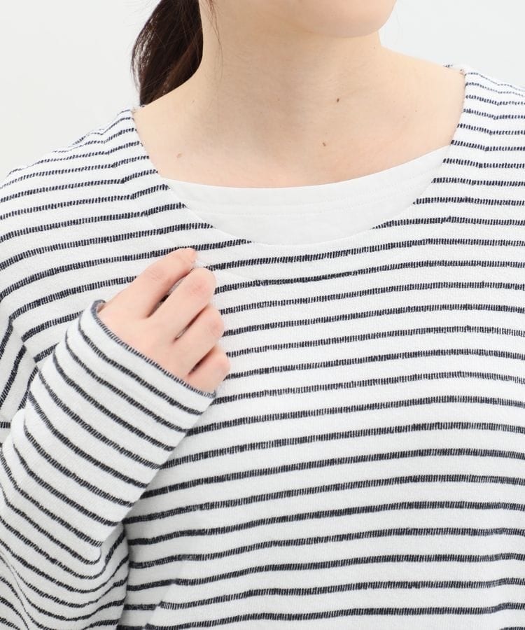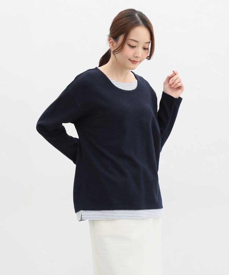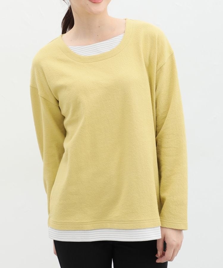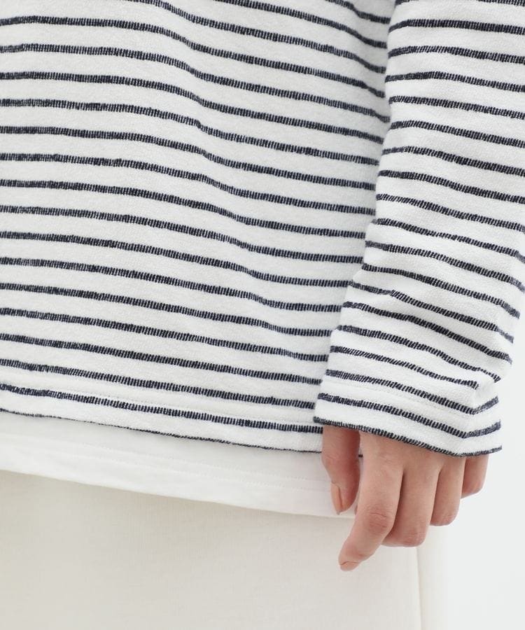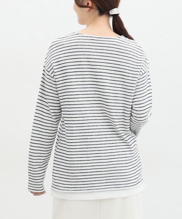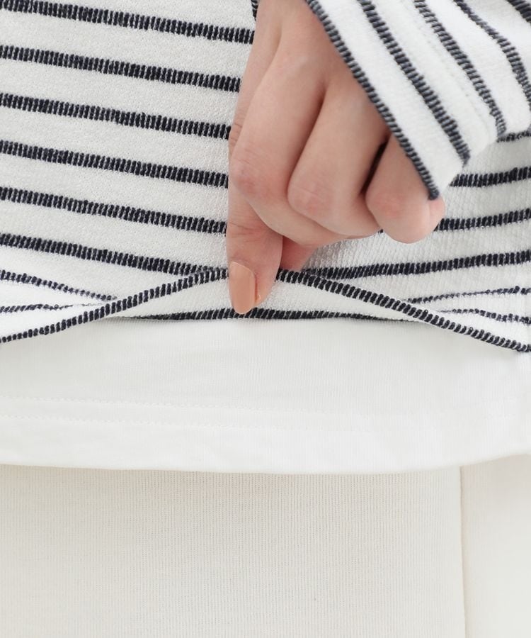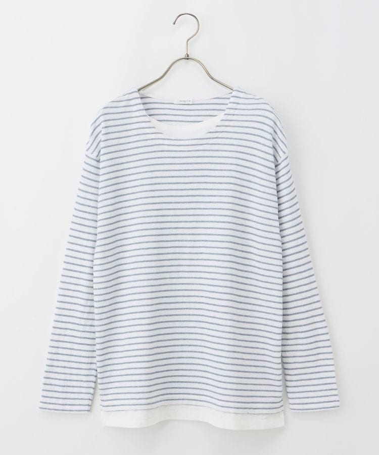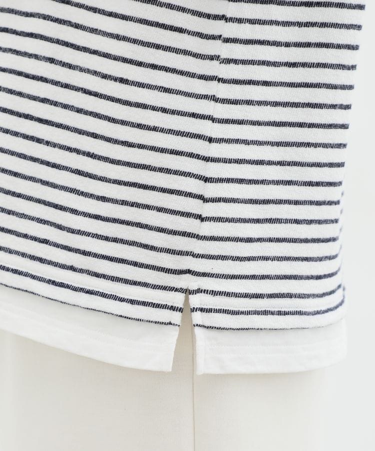 無地×ボーダーの組み合わせと、ナチュラルな表面感が大人可愛いレイヤード風デザイン。
