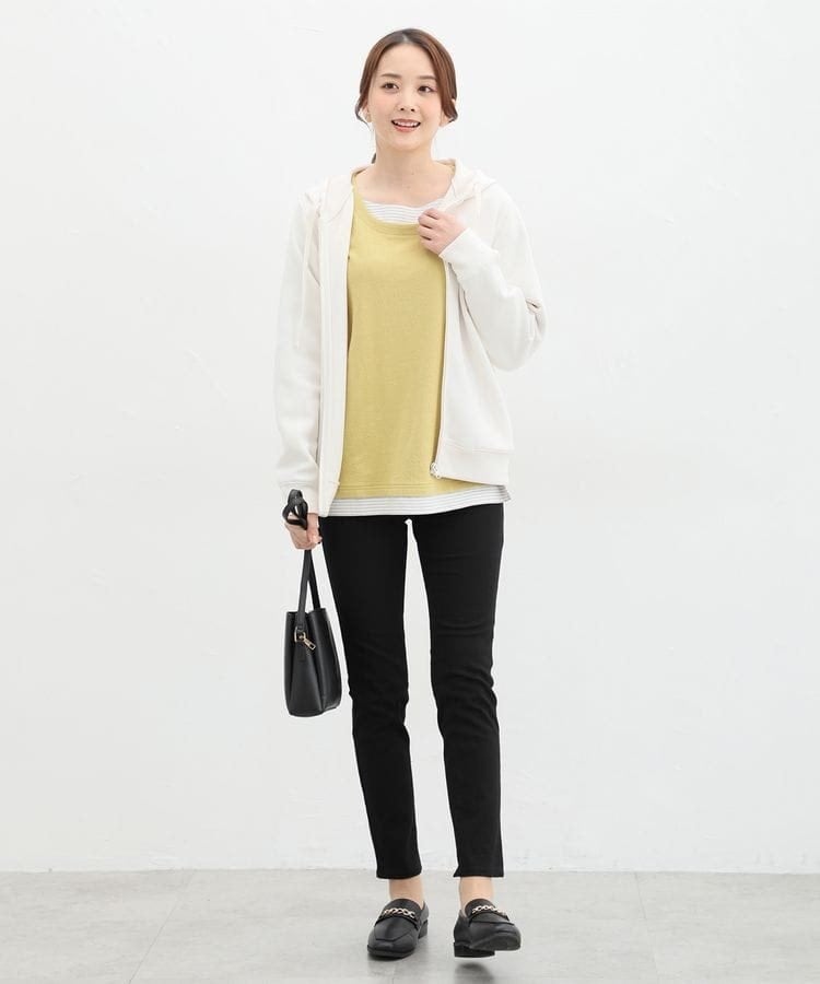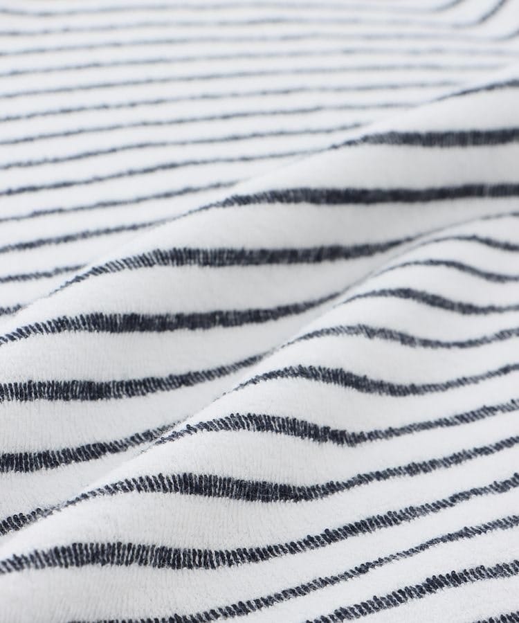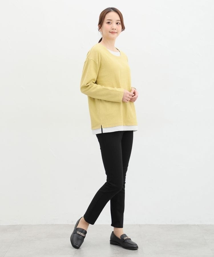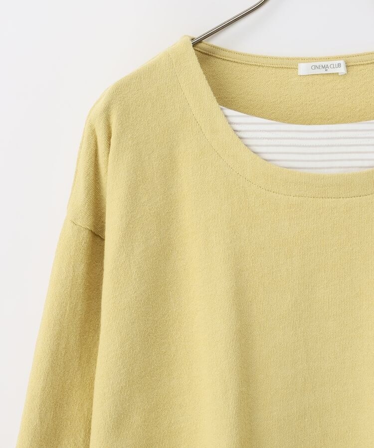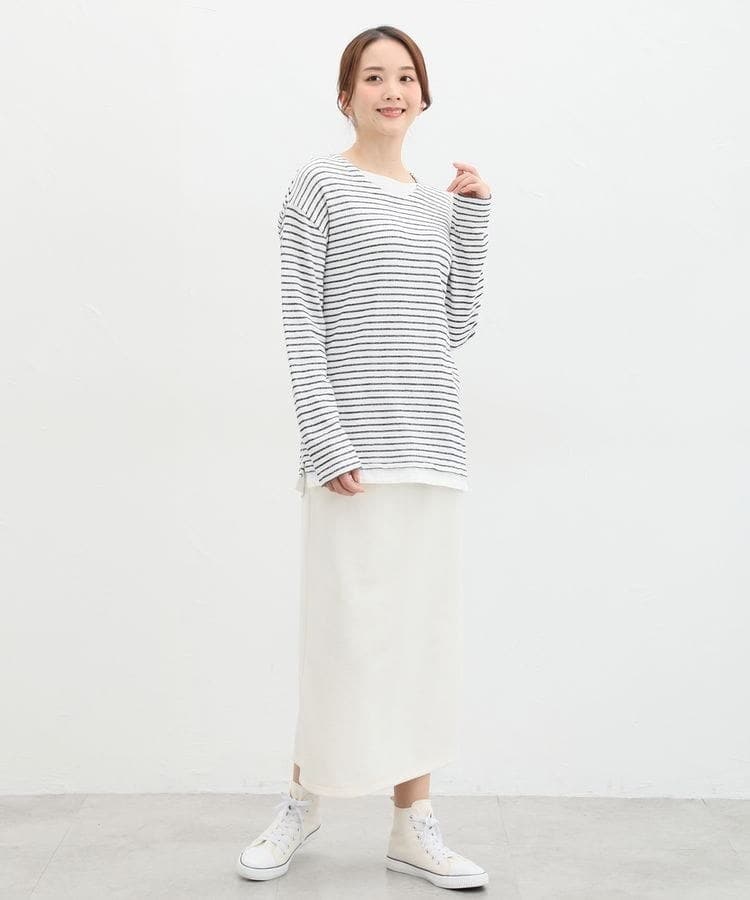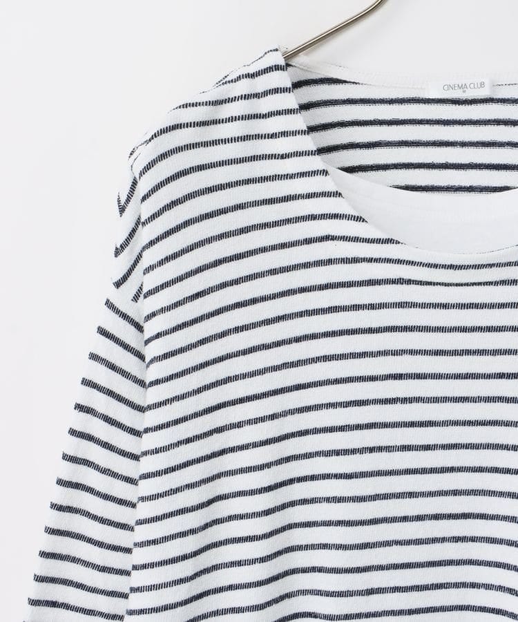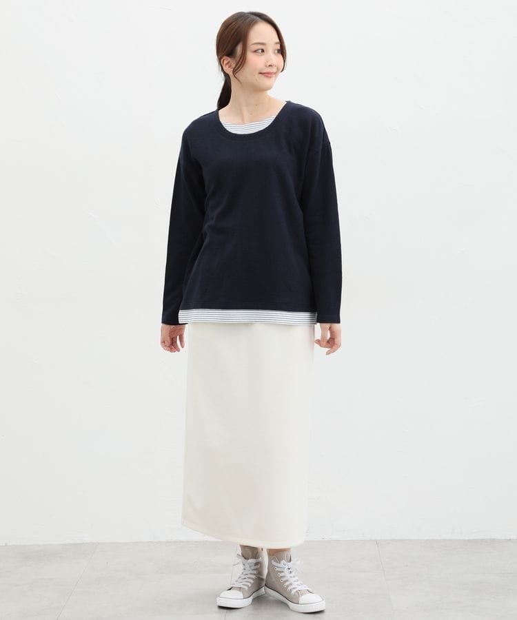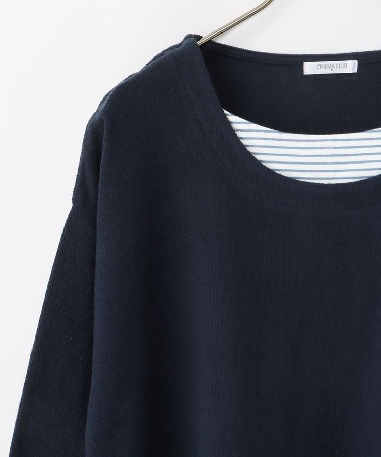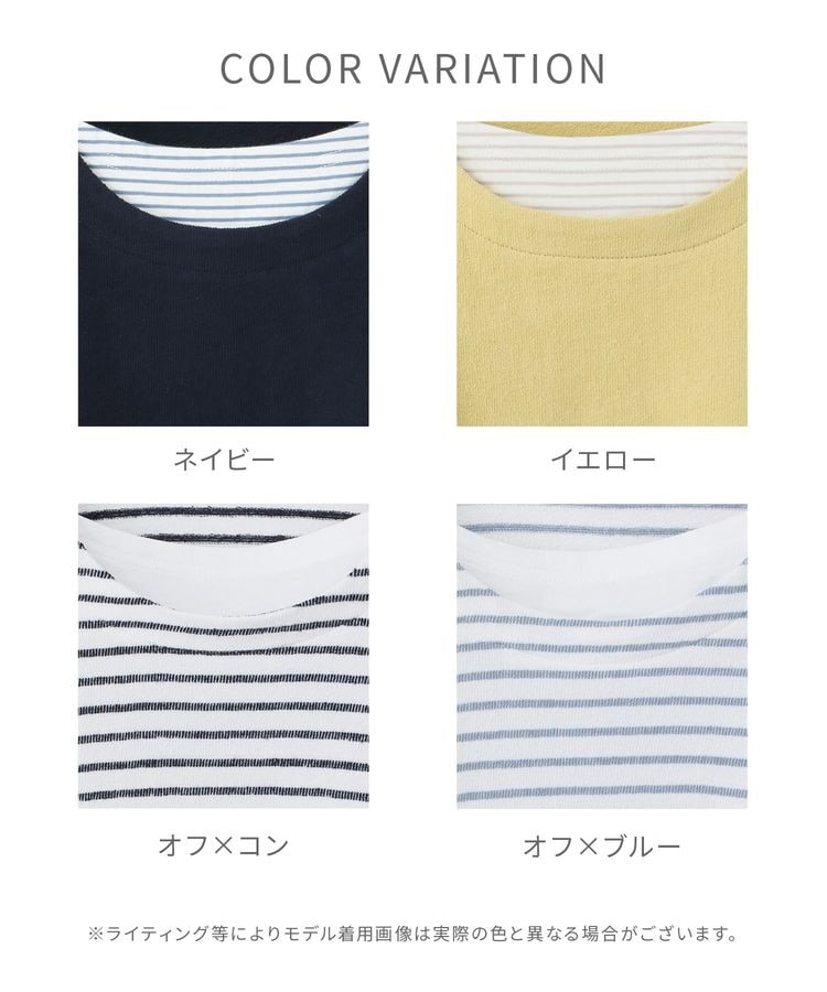 無地×ボーダーの組み合わせと、ナチュラルな表面感が大人可愛いレイヤード風デザイン。