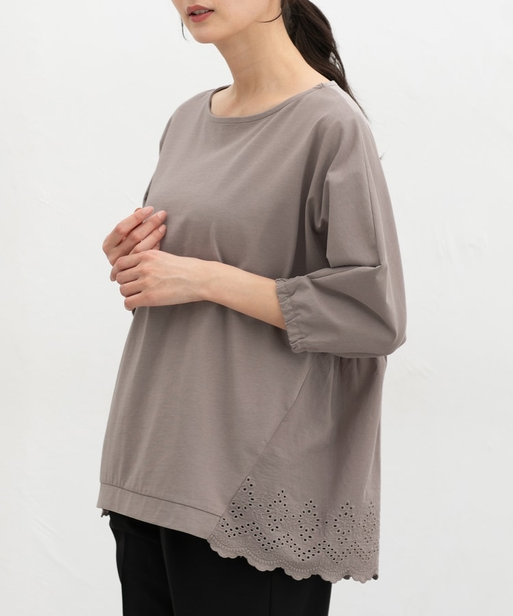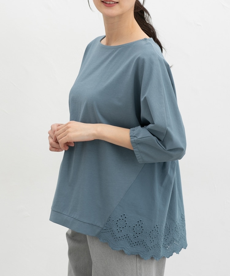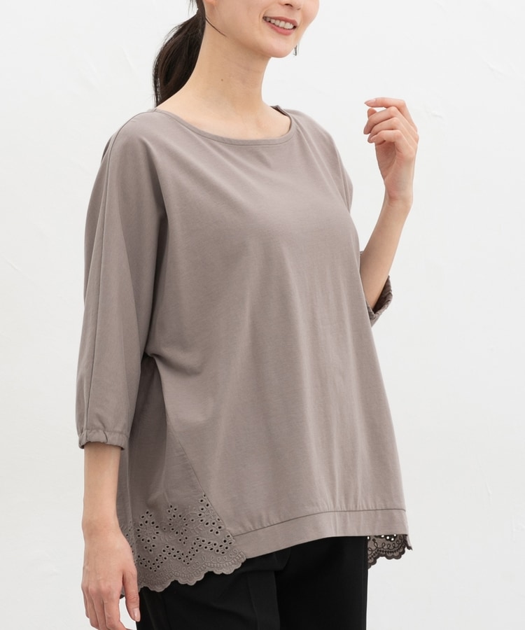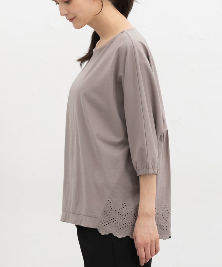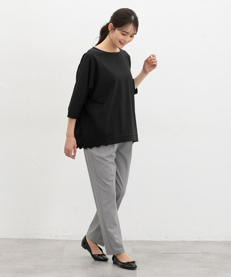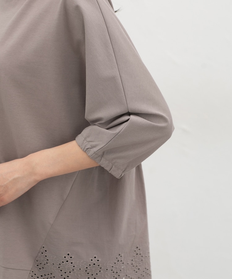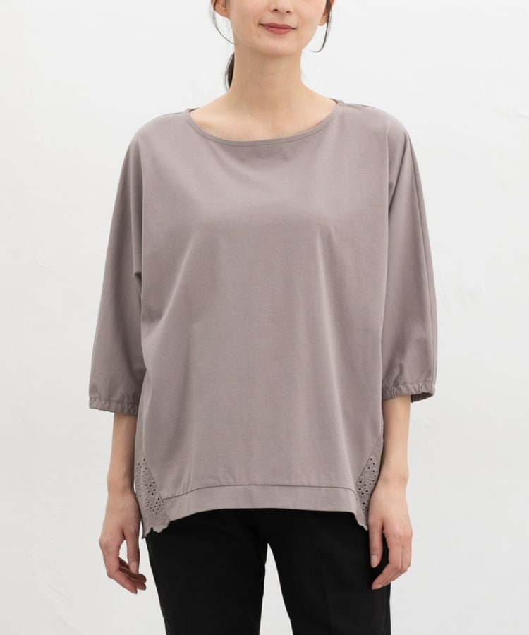 ゆったりした幅とヒップまで隠れる丈感、ドルマン袖でストレスフリーな着心地。