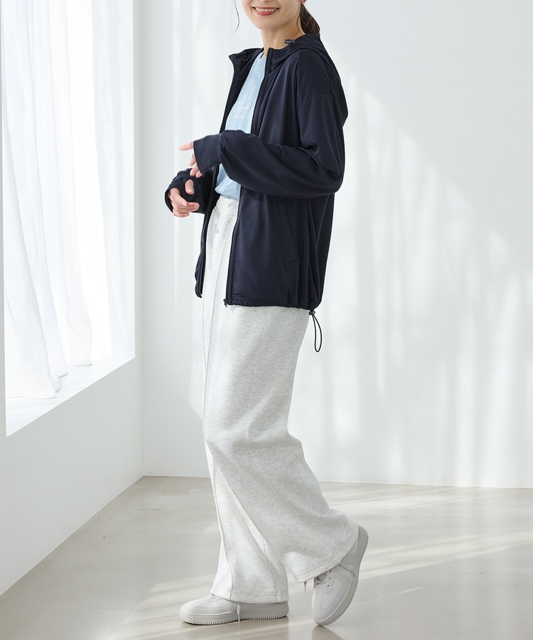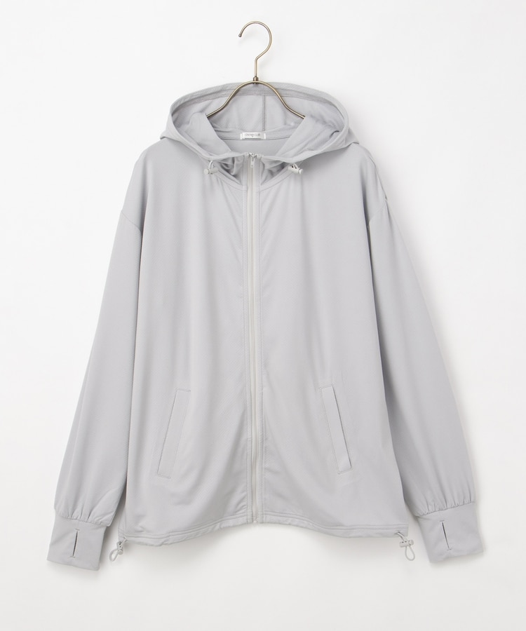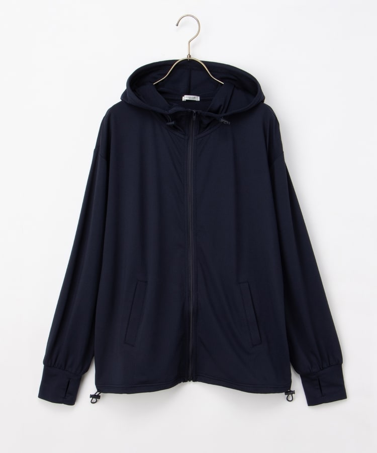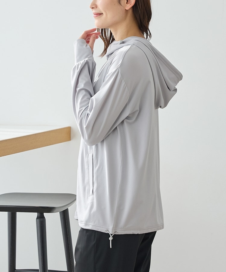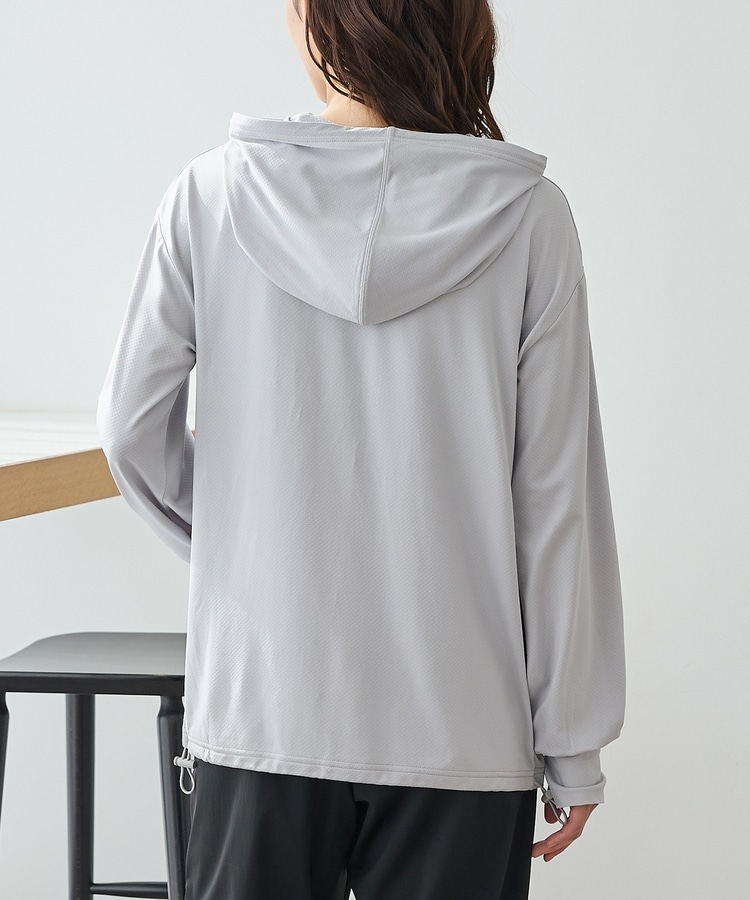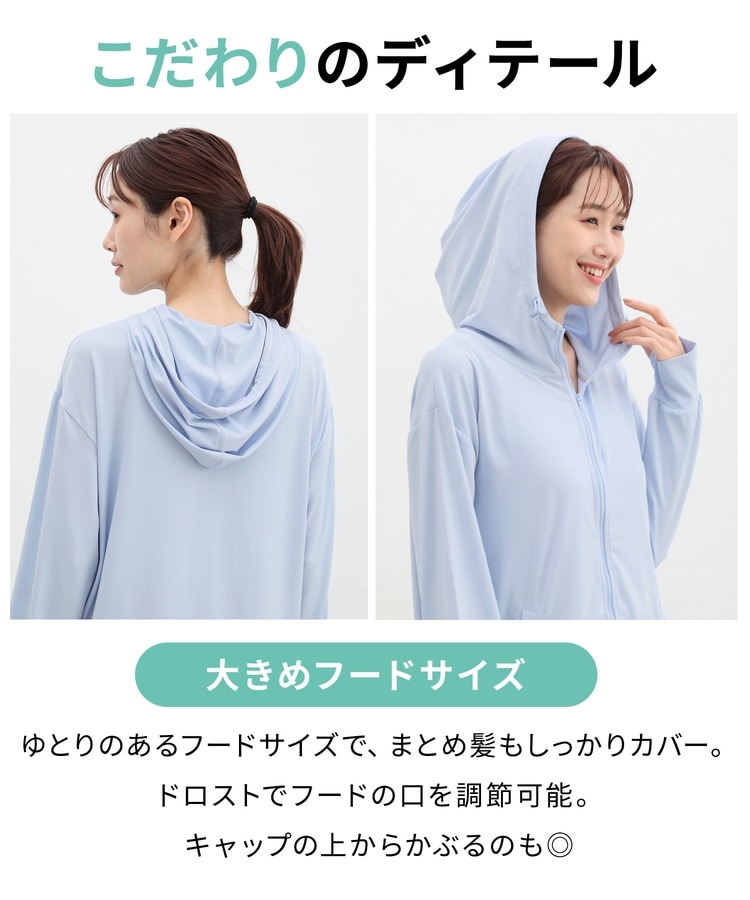 まとめ髪やキャップの上からでもすっぽりかぶれる少し大きめのフードも、ドロストでサイズ調整可能。