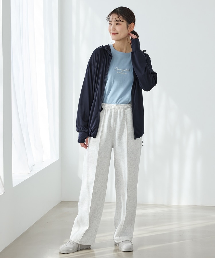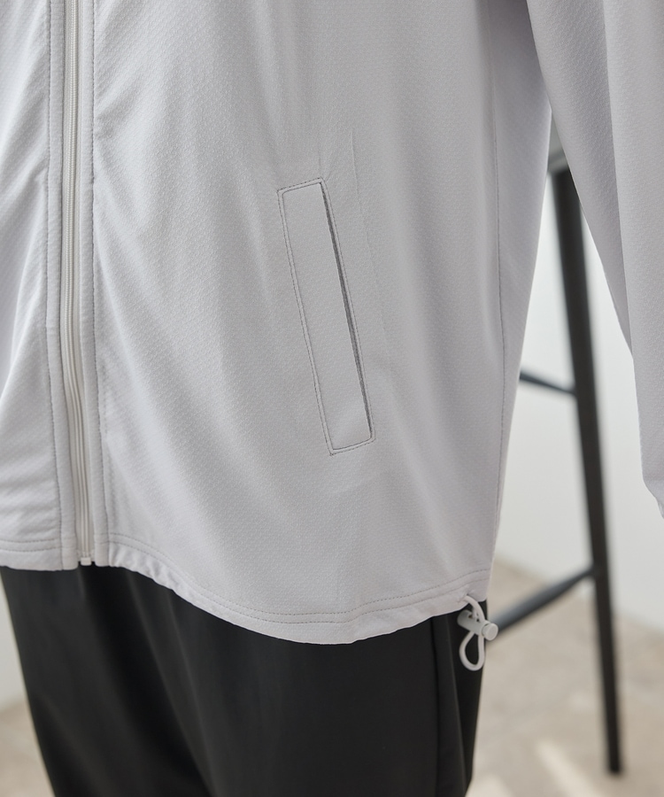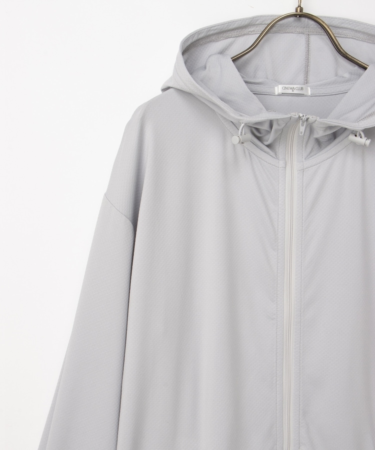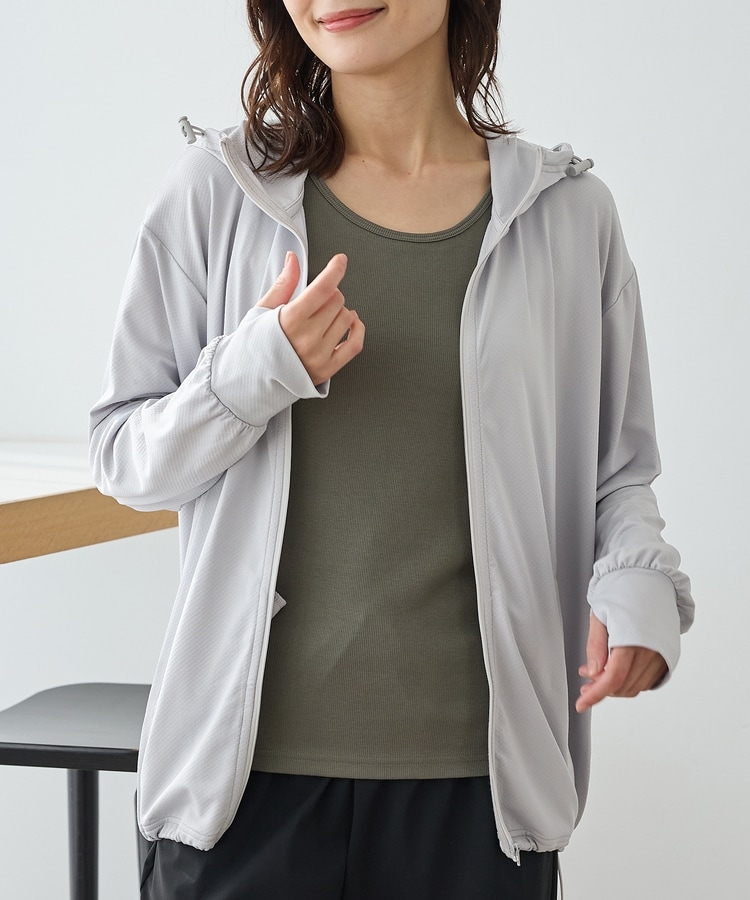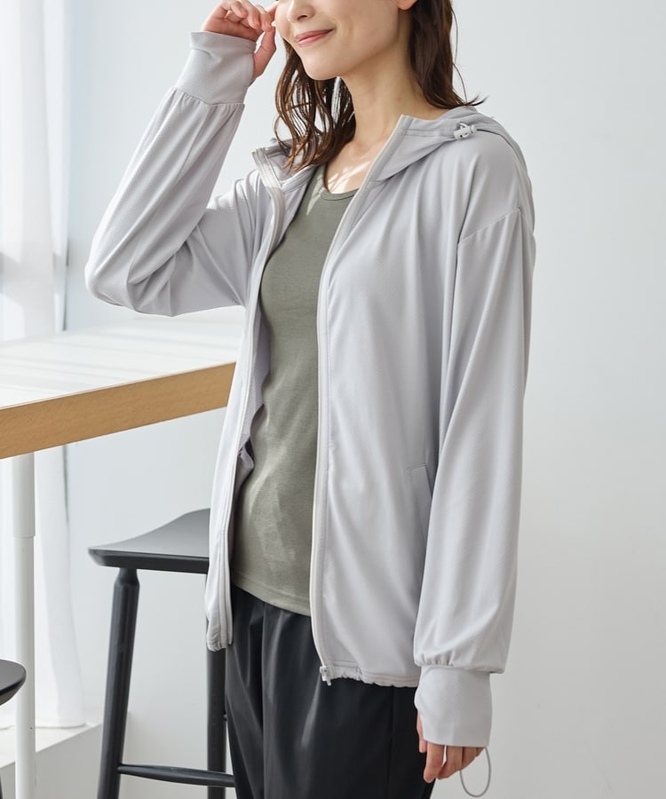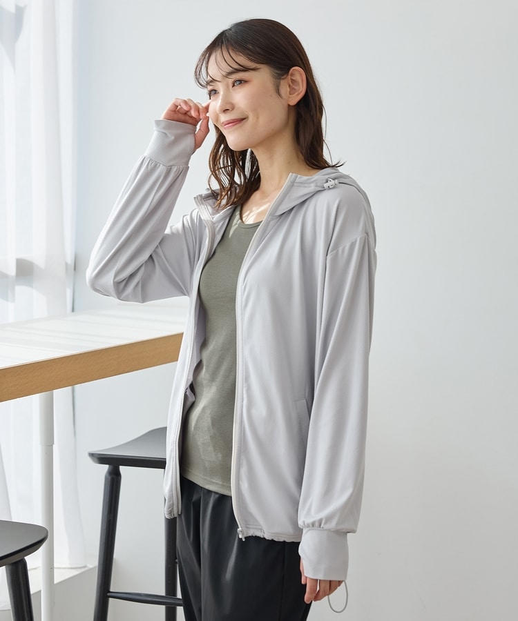 まとめ髪やキャップの上からでもすっぽりかぶれる少し大きめのフードも、ドロストでサイズ調整可能。
