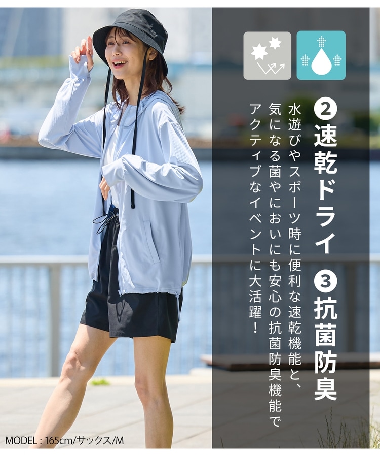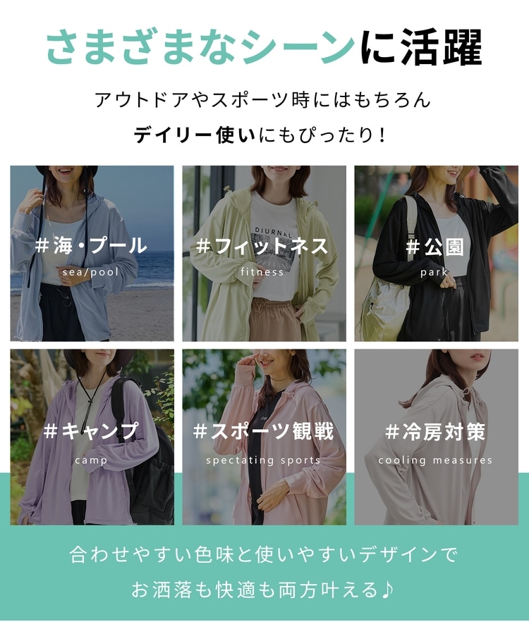 ビーチやプールなどの水辺ではもちろん、ガーデニングやお散歩、公園で遊んだりの普段使い、キャンプやバーベキューなどのアウトドア、ジムやヨガ、ジョギングなどのスポーツシーン、冷房対策まで、さまざまなシチュエーションで大活躍!