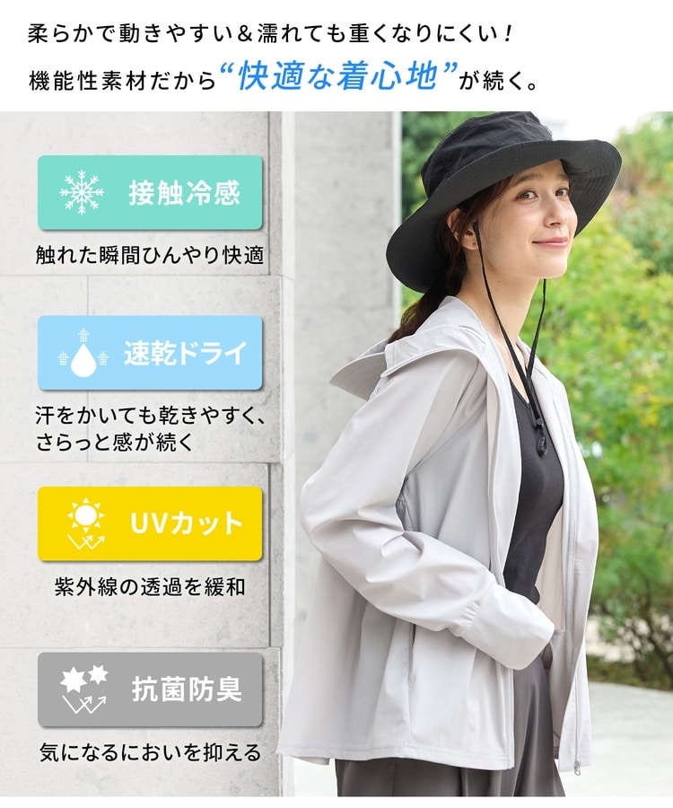 ビーチやプールなどの水辺ではもちろん、ガーデニングやお散歩、公園で遊んだりの普段使い、キャンプやバーベキューなどのアウトドア、ジムやヨガ、ジョギングなどのスポーツシーン、冷房対策まで、さまざまなシチュエーションで大活躍!