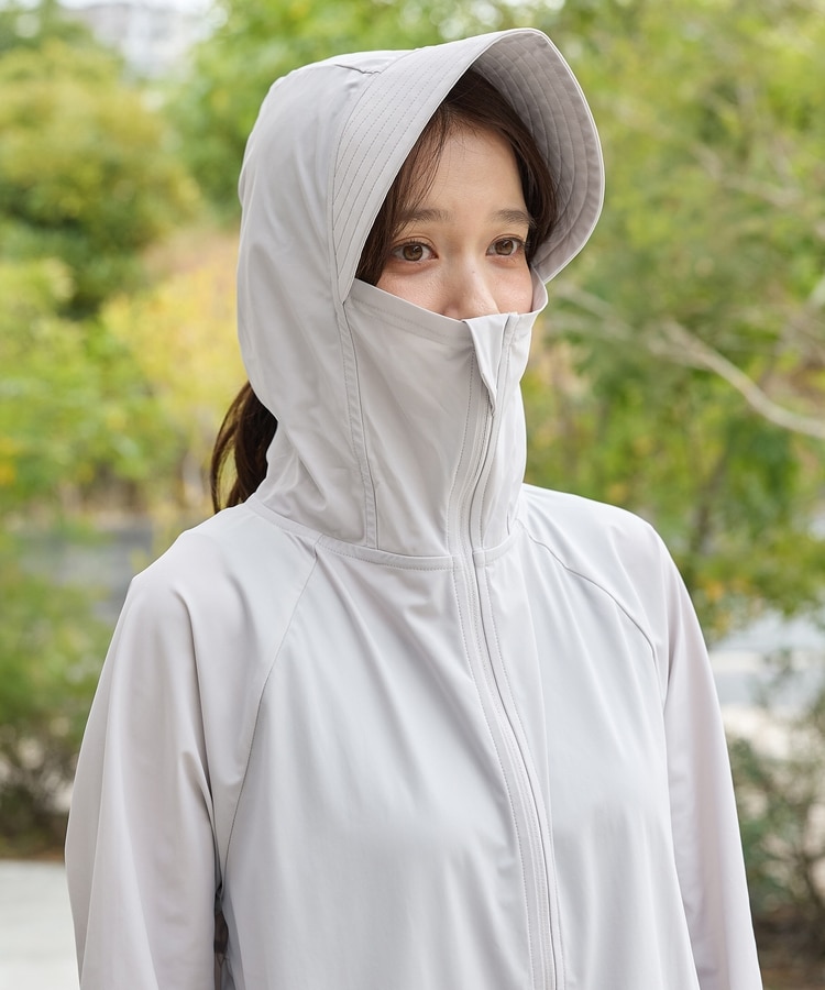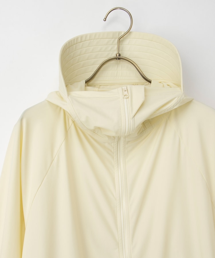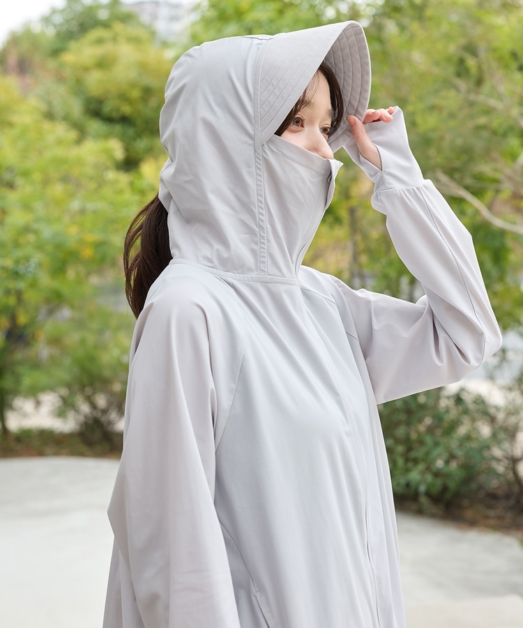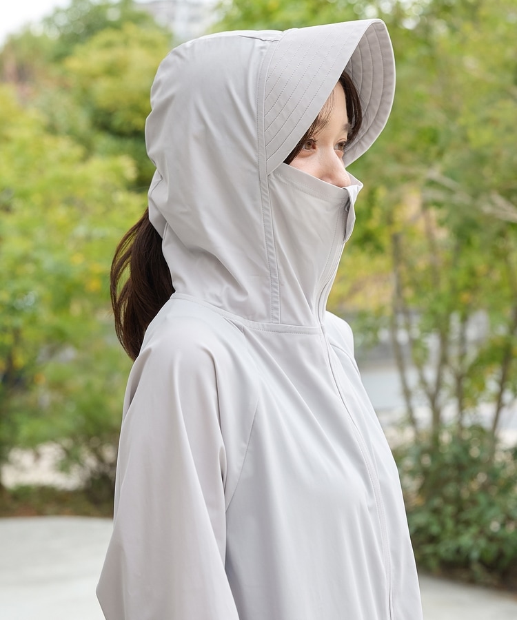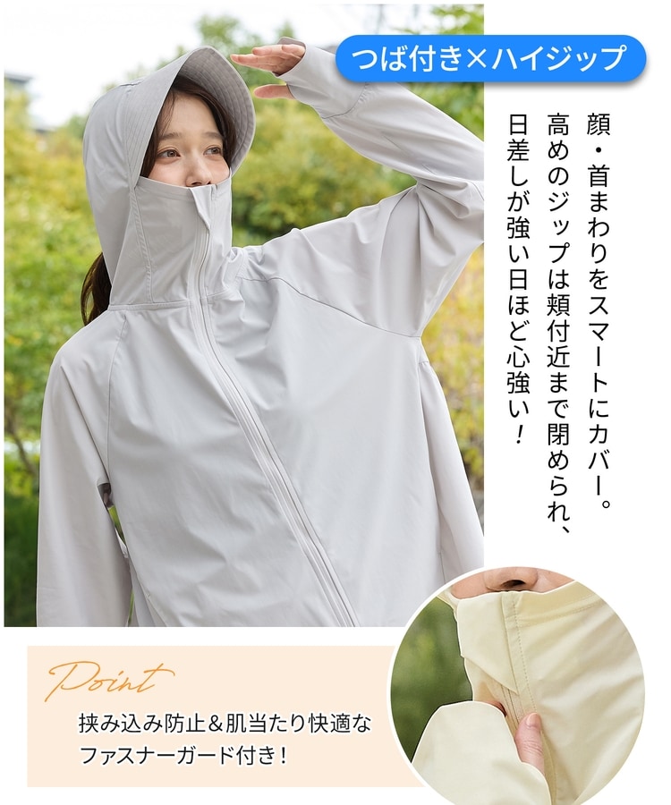 鼻先まで覆うファスナーと日差しをガードするつば付きのフードで安心。挟み込み防止&肌当たり快適なファスナーガードも。