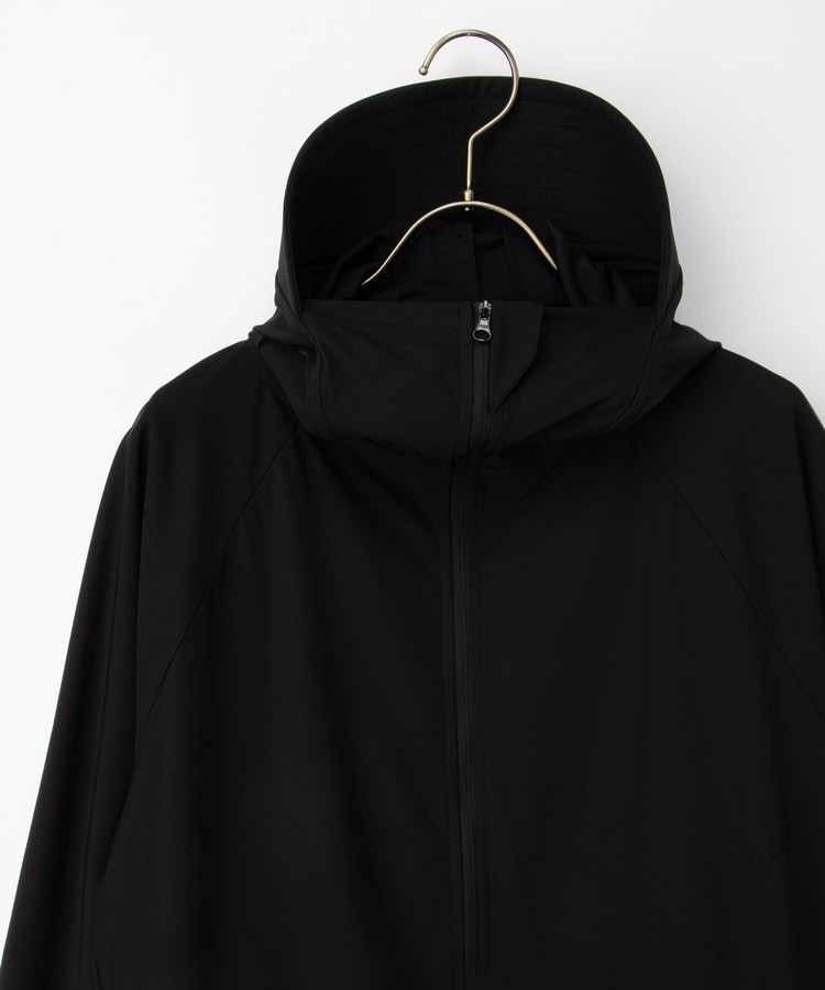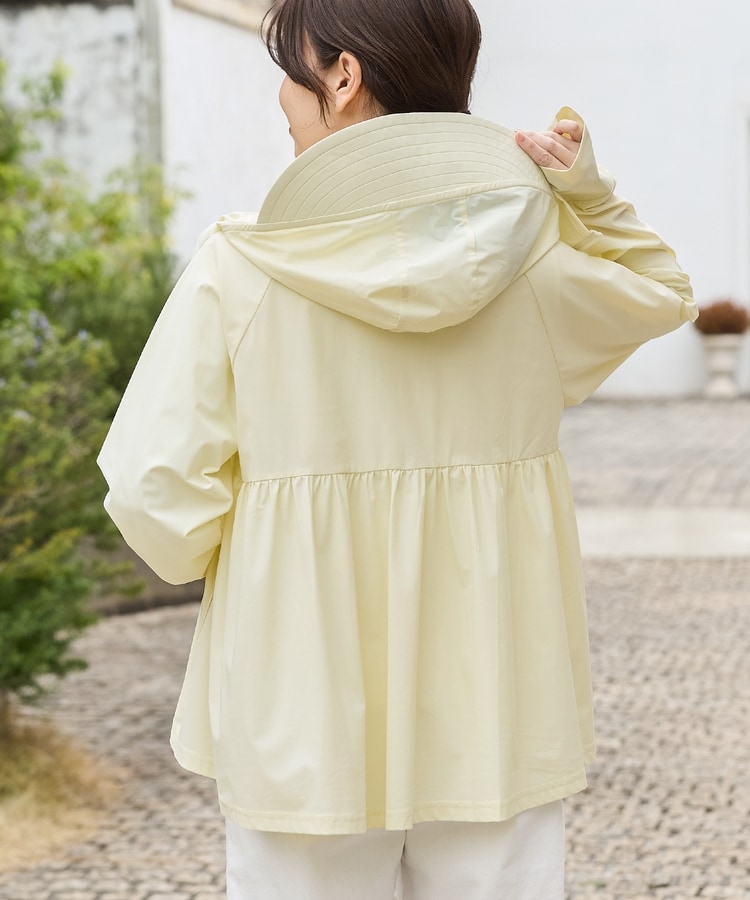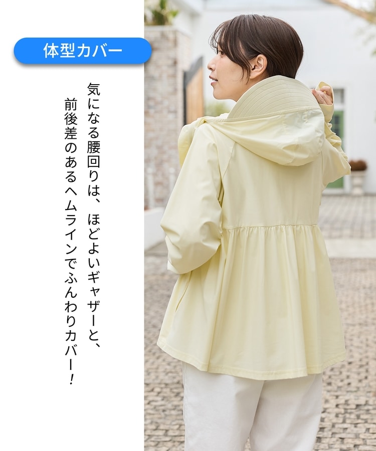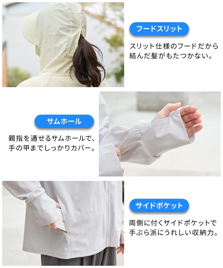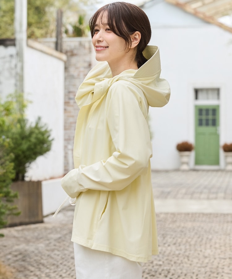 鼻先まで覆うファスナーと日差しをガードするつば付きのフードで安心。挟み込み防止&肌当たり快適なファスナーガードも。