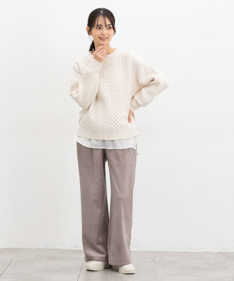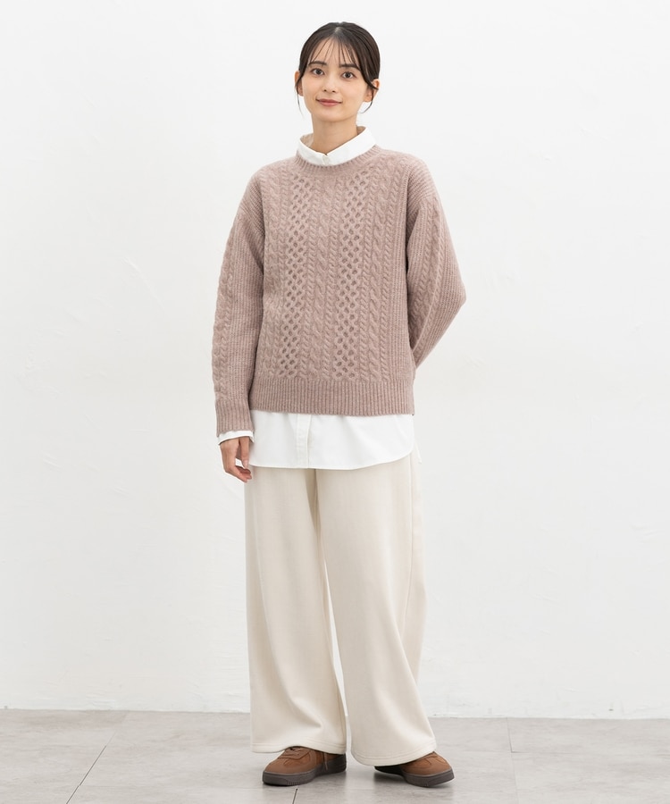 縦の編み目とストンと落ちるシルエットで、スタイルアップも叶うデザイン。