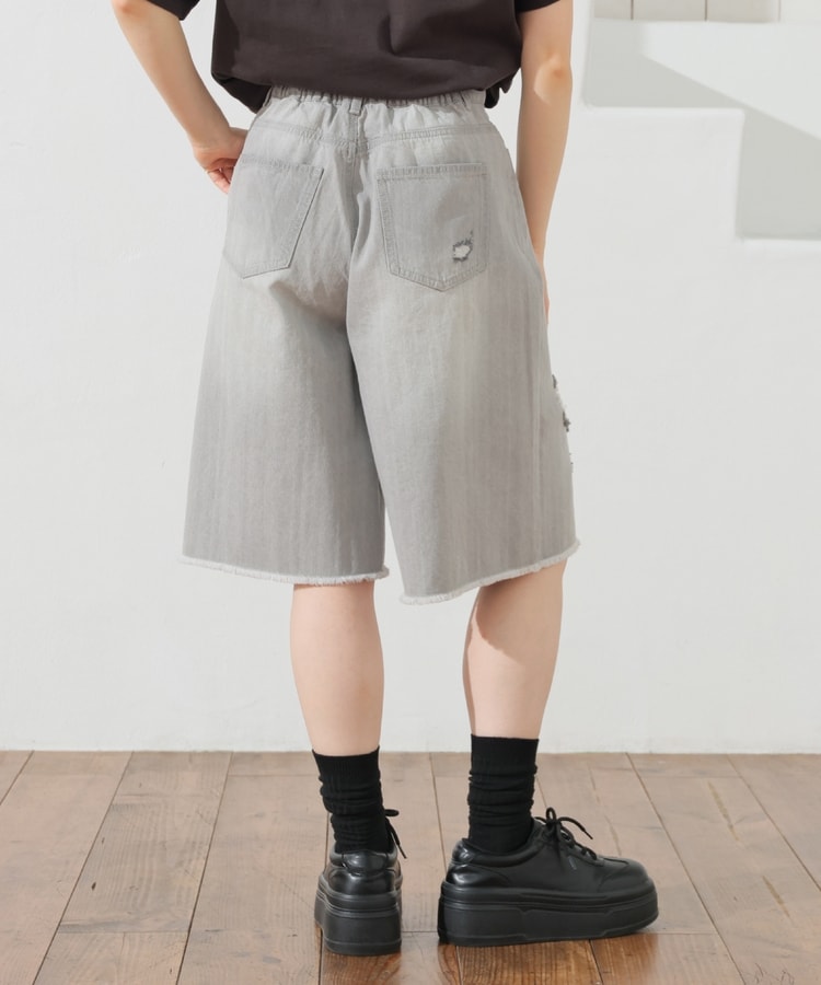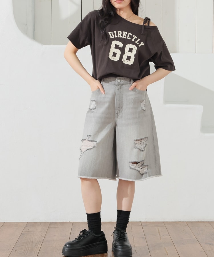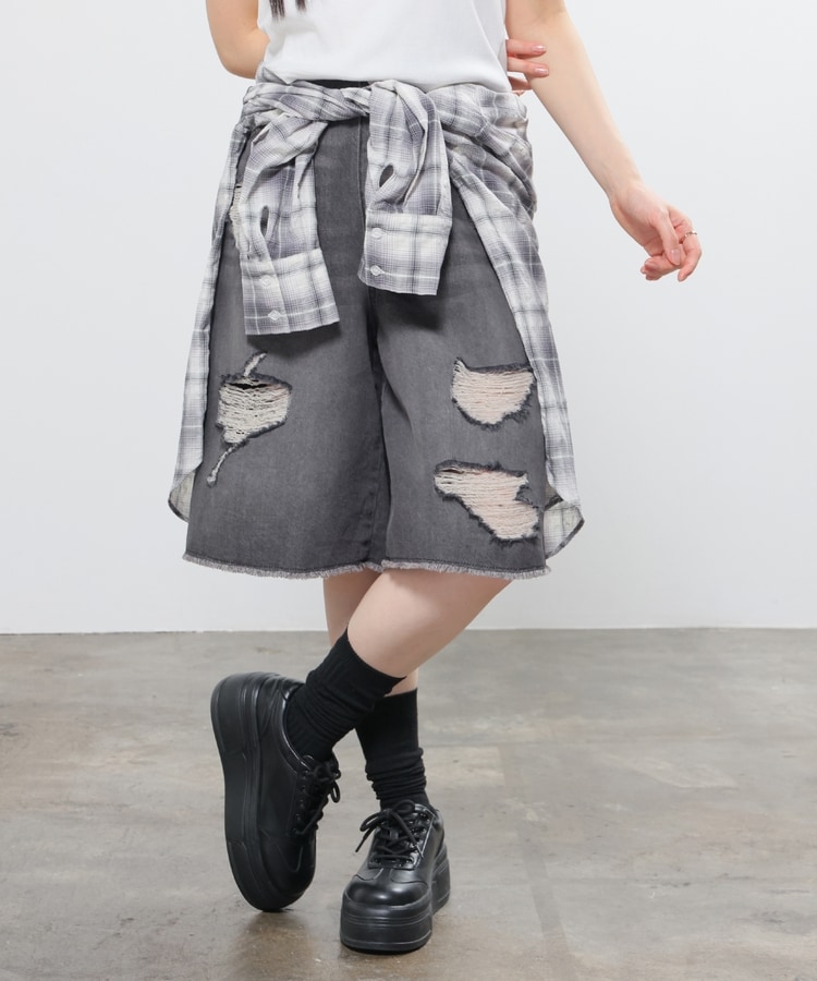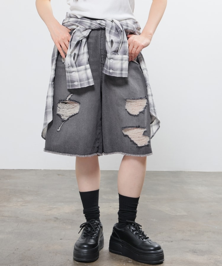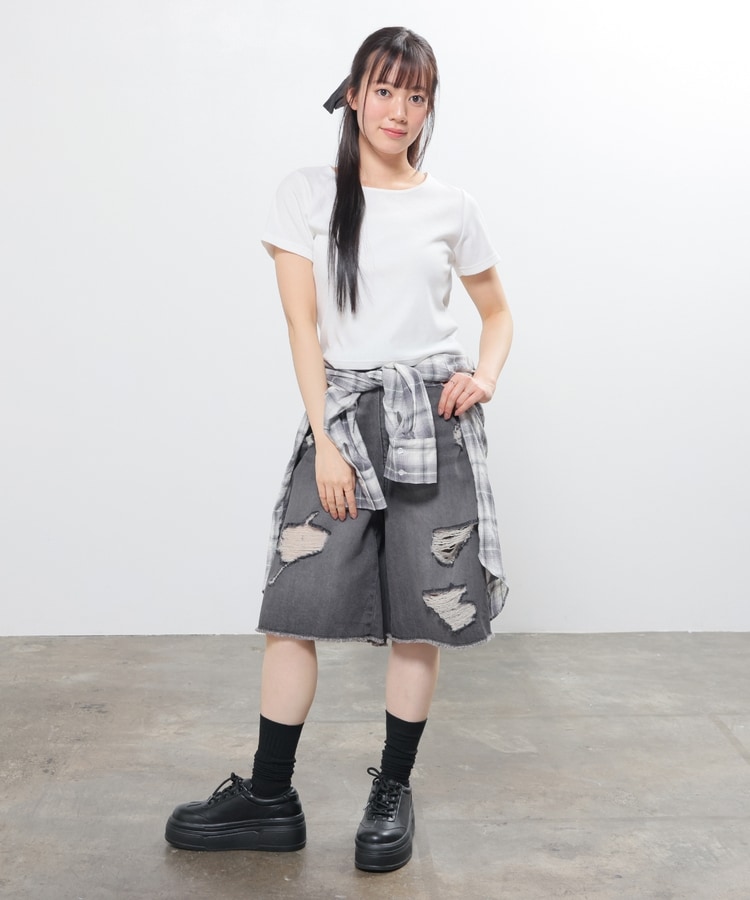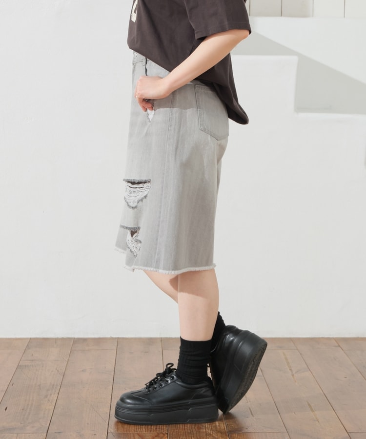 膝上の絶妙な丈感と裾に向かってやや広がるワイドめなシルエットで、細見え効果も期待できる今年らしいデザイン。