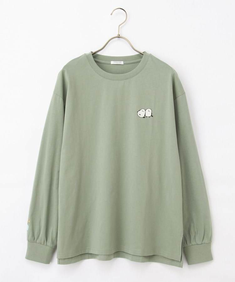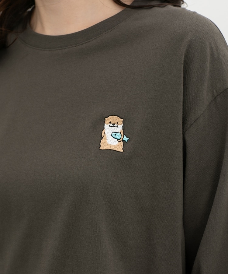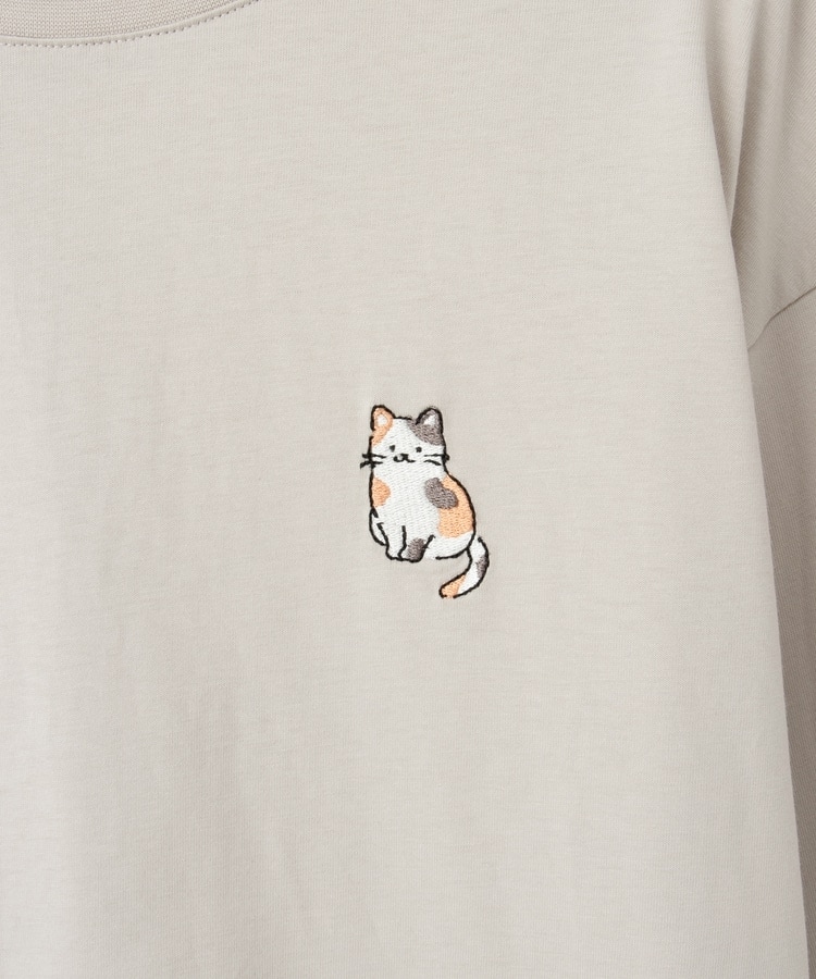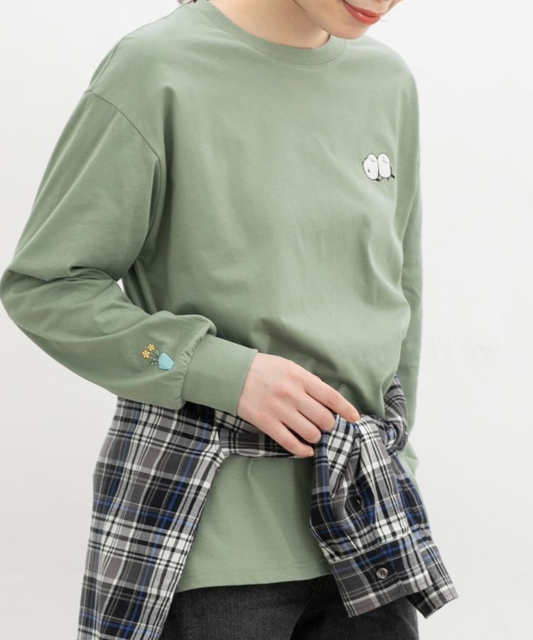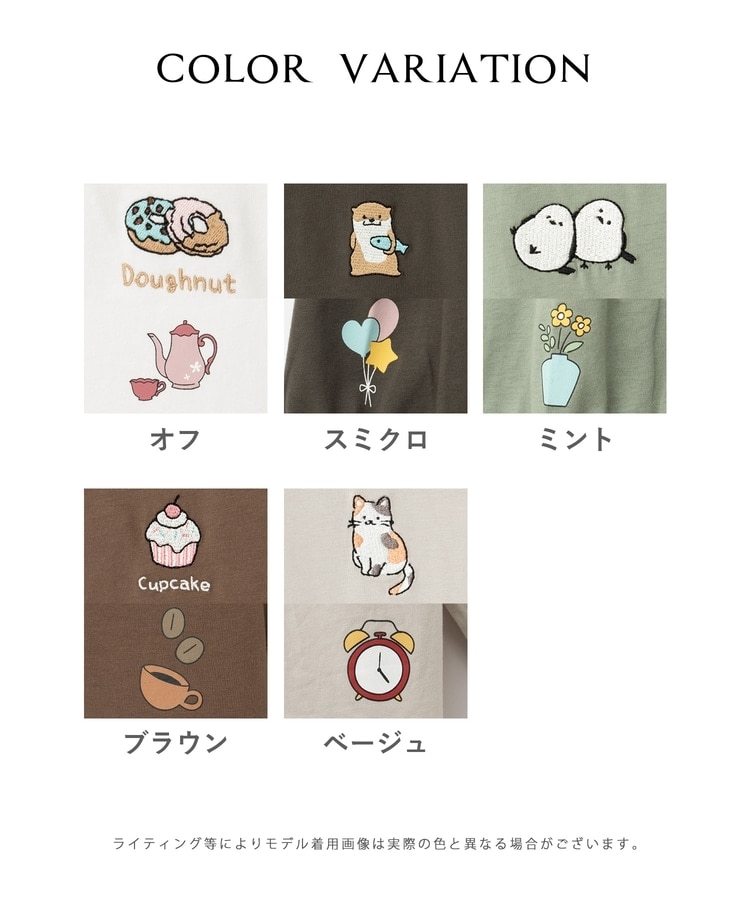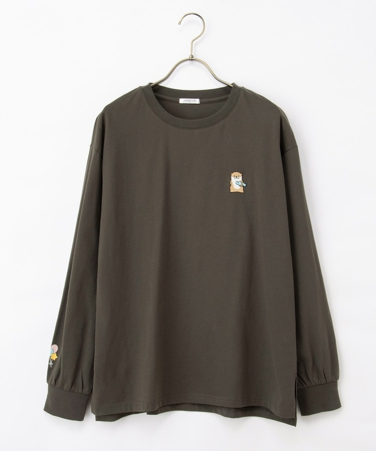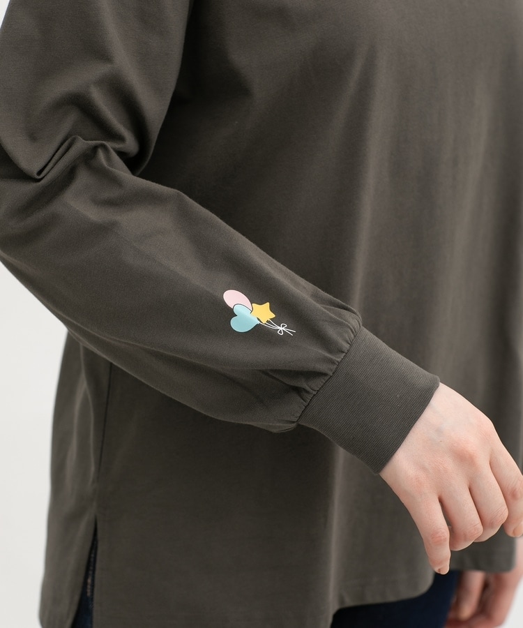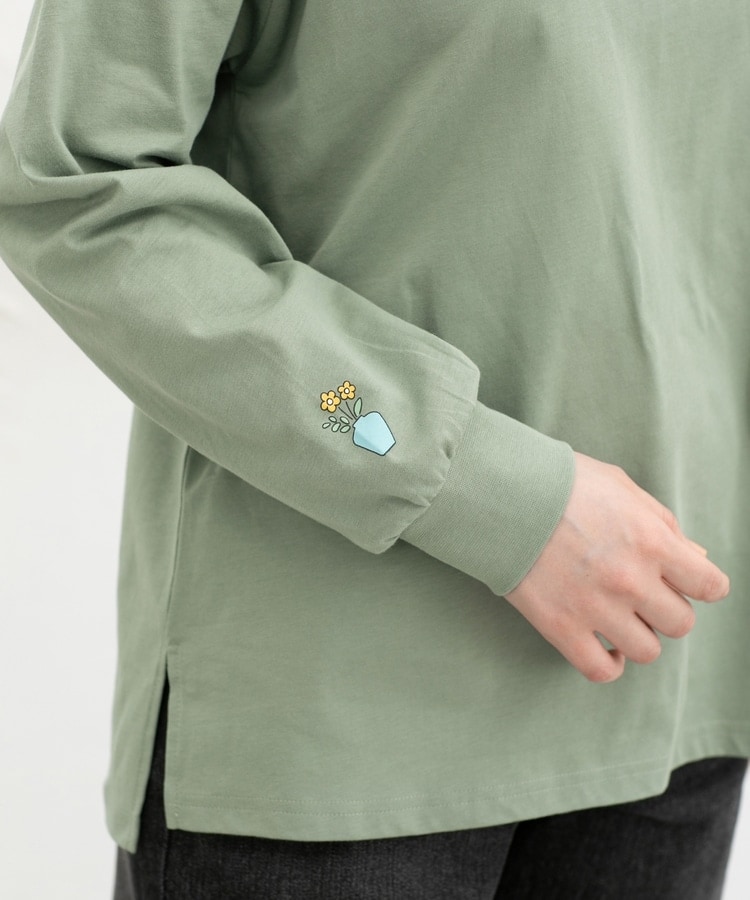 胸元や右袖、後ろ裾などのゆるかわモチーフ刺繍やプリントと、抜け感のあるスリットがお洒落なデザイン。