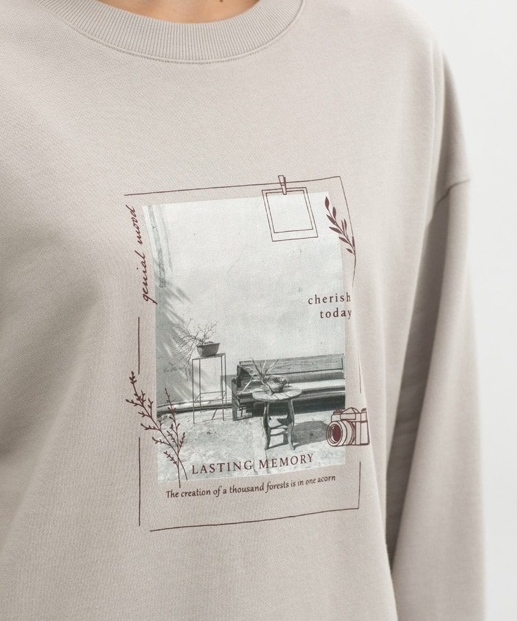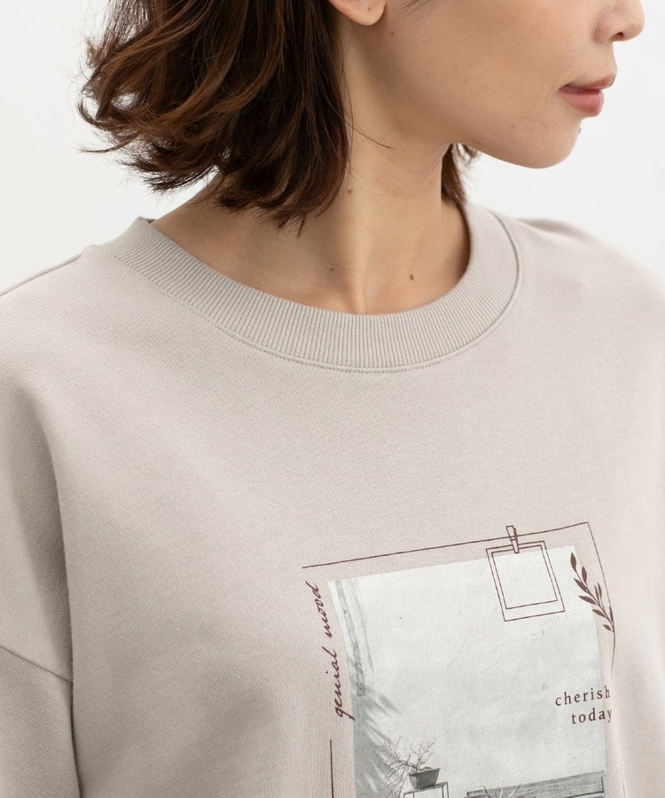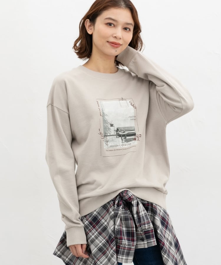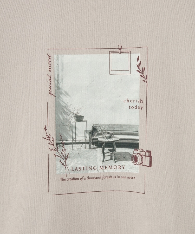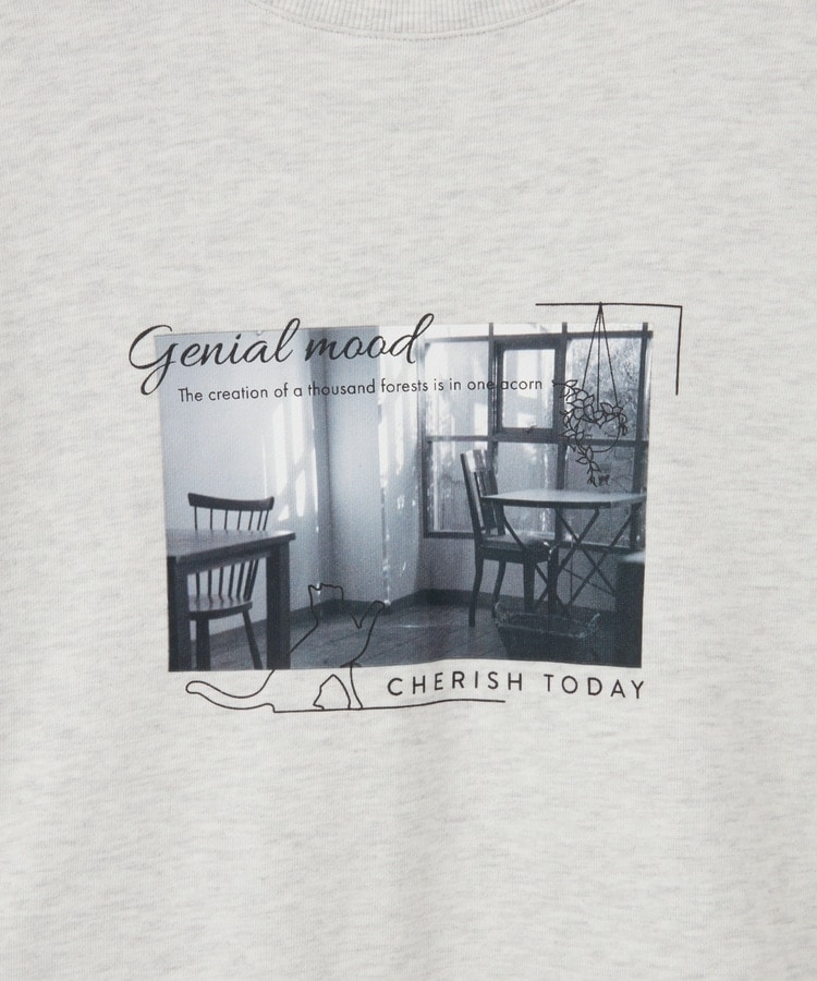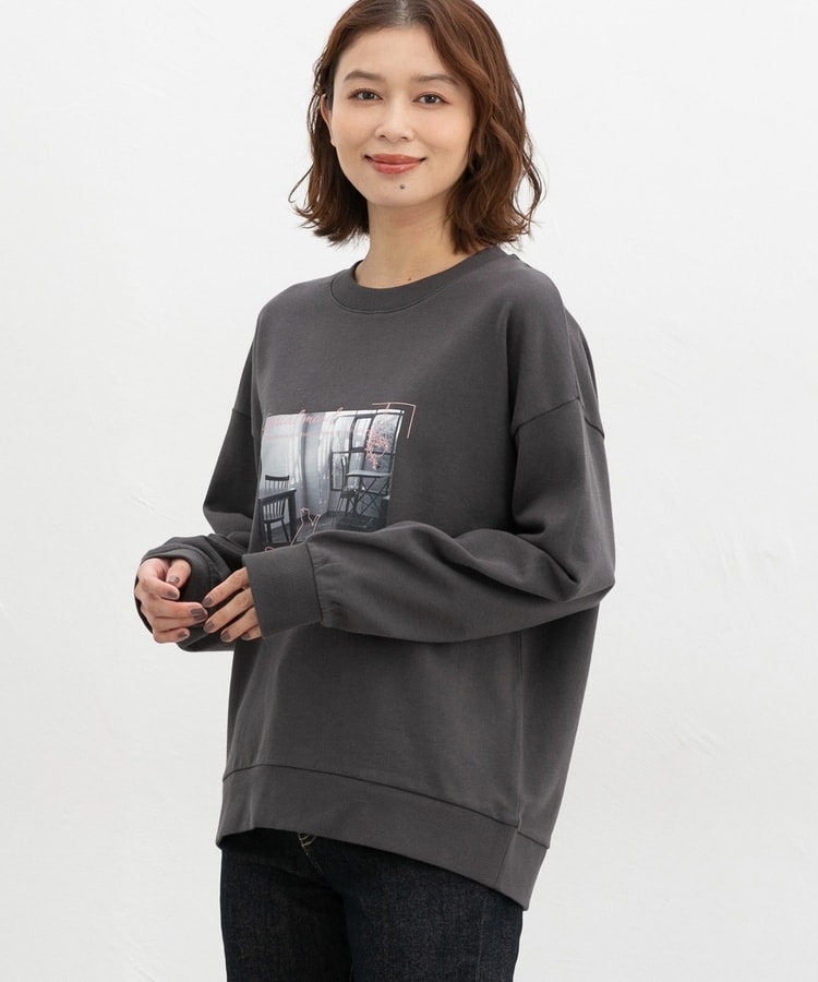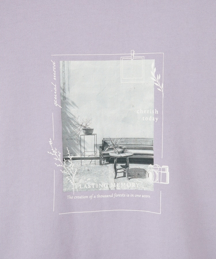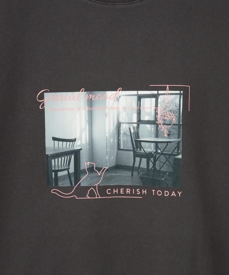 モノクロ風のフォトプリントと前後差ヘムのゆったりシルエットがおしゃれなデザイン。
