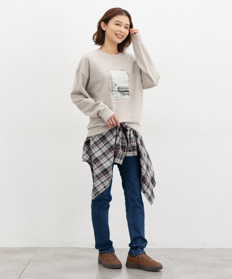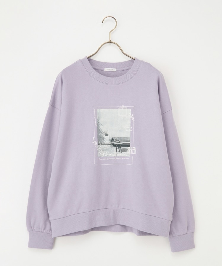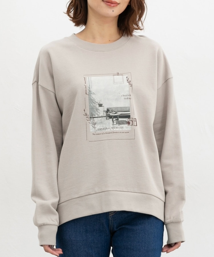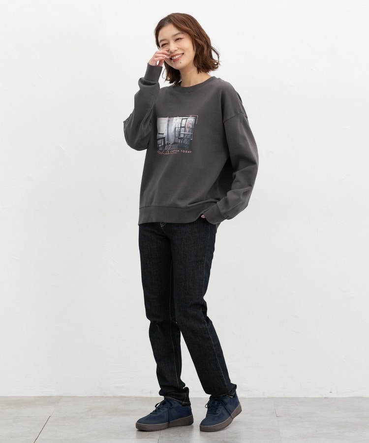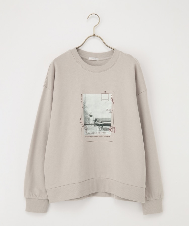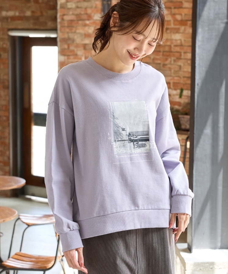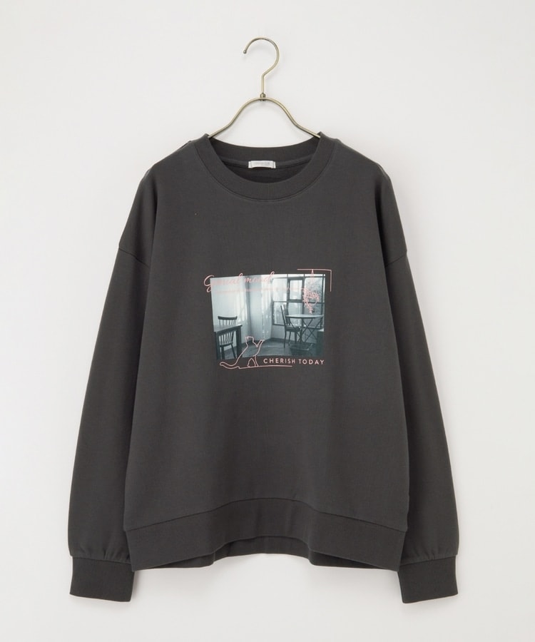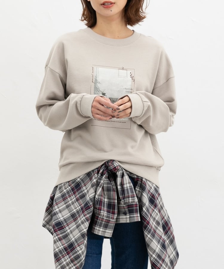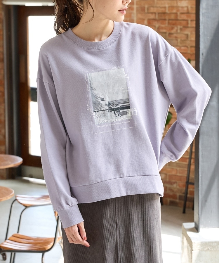 モノクロ風のフォトプリントと前後差ヘムのゆったりシルエットがおしゃれなデザイン。